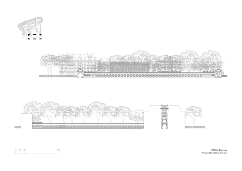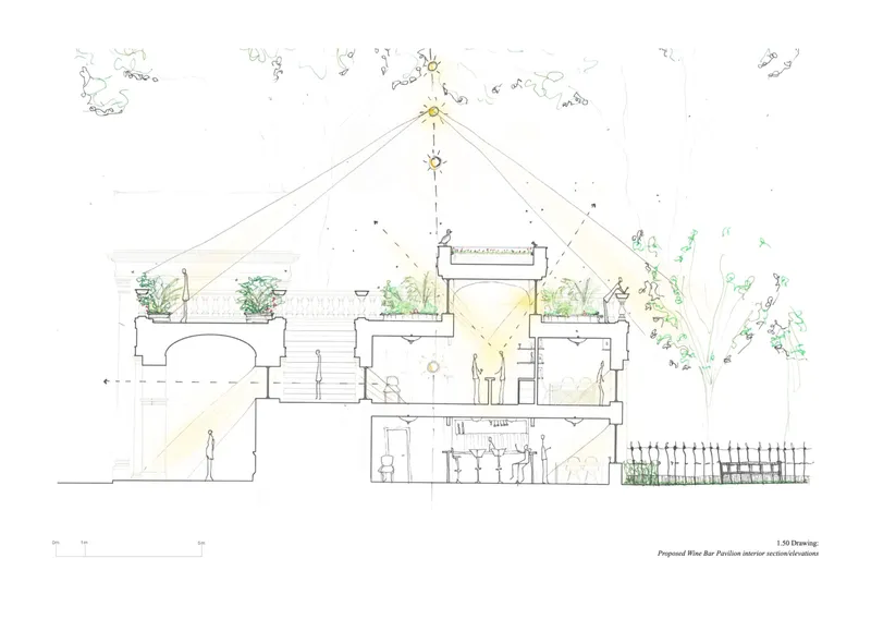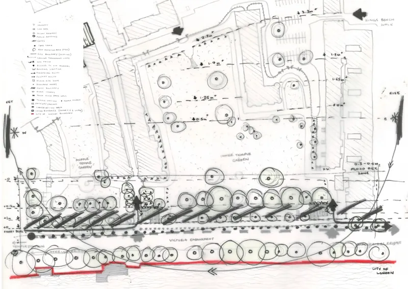 The design consists of a colonnade over the pedestrian pavement across Inner Temple Gardens with two entrance porticos. The building holds pavilions on either side which serve as a wine bar in the west and private amenities for the site users in the east (i.e. cycle storage, showers, toilets, gardener‘s facilities). For the public, the project offers an improved pedestrian path with vaulted ceilings and seating throughout, with a shared terrace walkway and green roof providing views into the Temple Gardens (to mitigate the restricted public access into the gardens which are open 12-3 pm) and across the River Thames. The design reflects the classical heritage of the area, utilising materials like stone and brick to preserve architectural integrity. Environmental considerations include minimal disruption to existing plants, with a commitment to enhancing biodiversity through features like the green rooftop terrace.