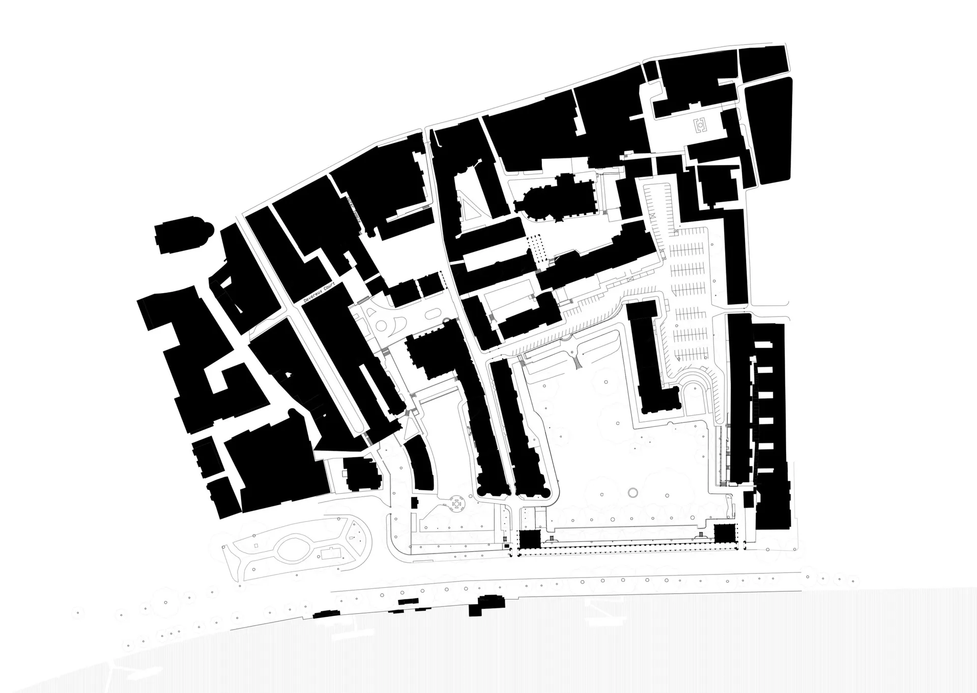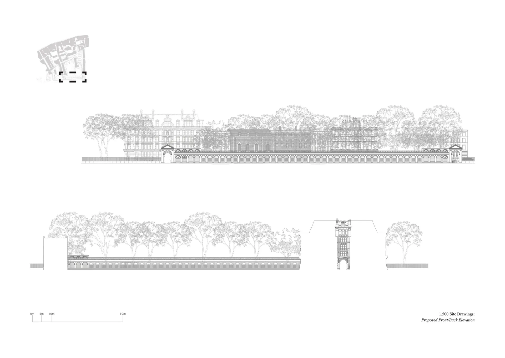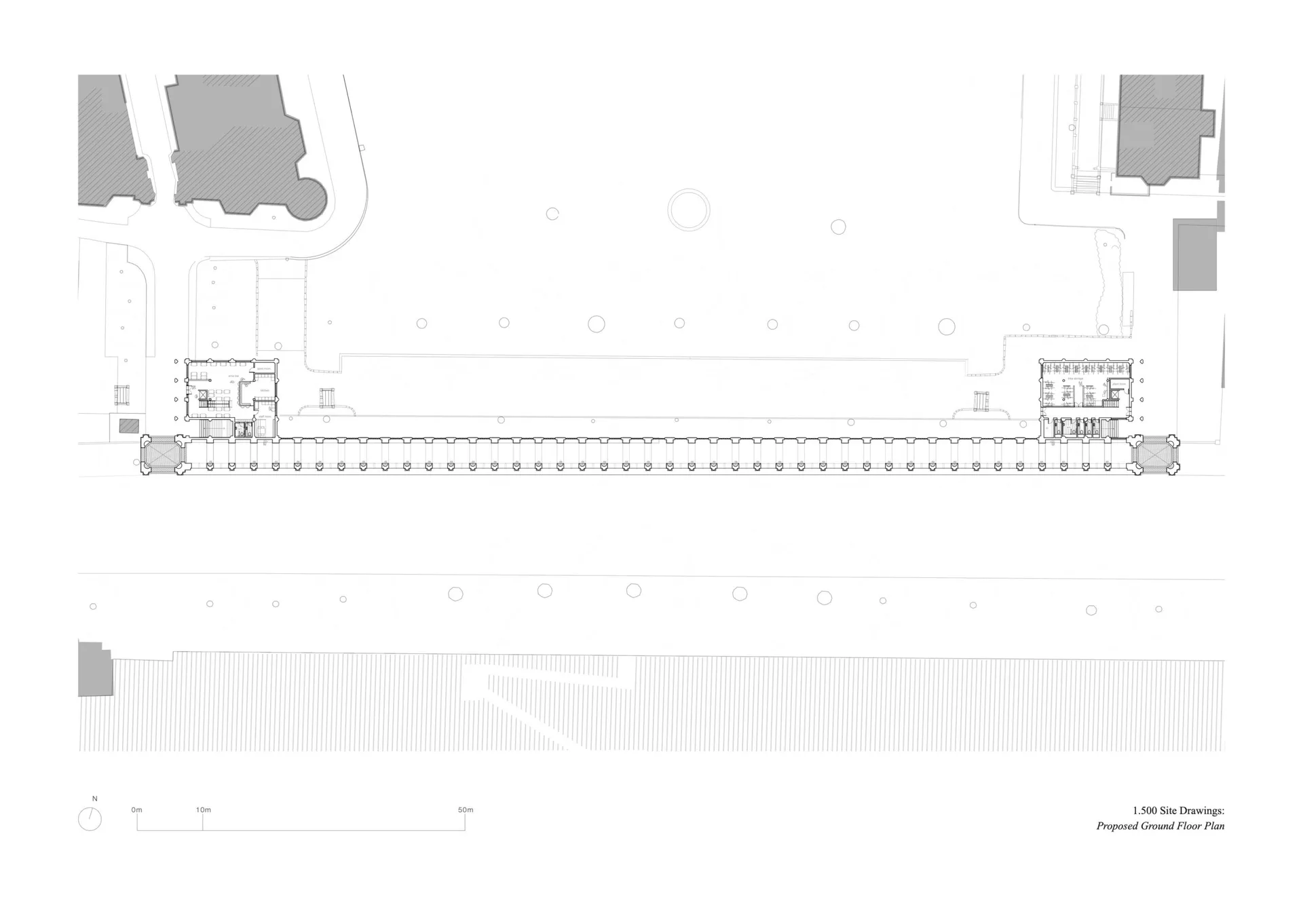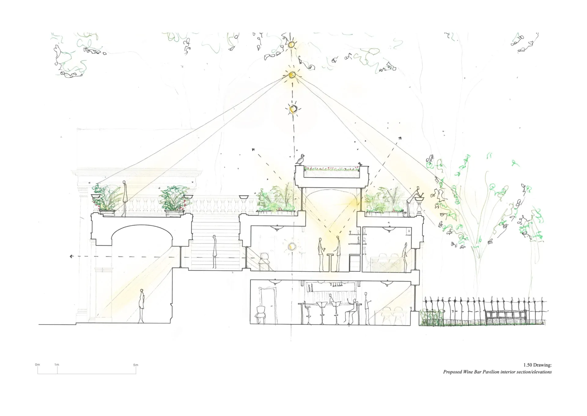 The design consists of a colonnade over the pedestrian pavement across Inner Temple Gardens with two entrance porticos. The building holds pavilions on either side which serve as a wine bar in the west and private amenities for the site users in the east (i.e. cycle storage, showers, toilets, gardener‘s facilities). For the public, the project offers an improved pedestrian path with vaulted ceilings and seating throughout, with a shared terrace walkway and green roof providing views into the Temple Gardens (to mitigate the restricted public access into the gardens which are open 12-3 pm) and across the River Thames. The design reflects the classical heritage of the area, utilising materials like stone and brick to preserve architectural integrity. Environmental considerations include minimal disruption to existing plants, with a commitment to enhancing biodiversity through features like the green rooftop terrace.
