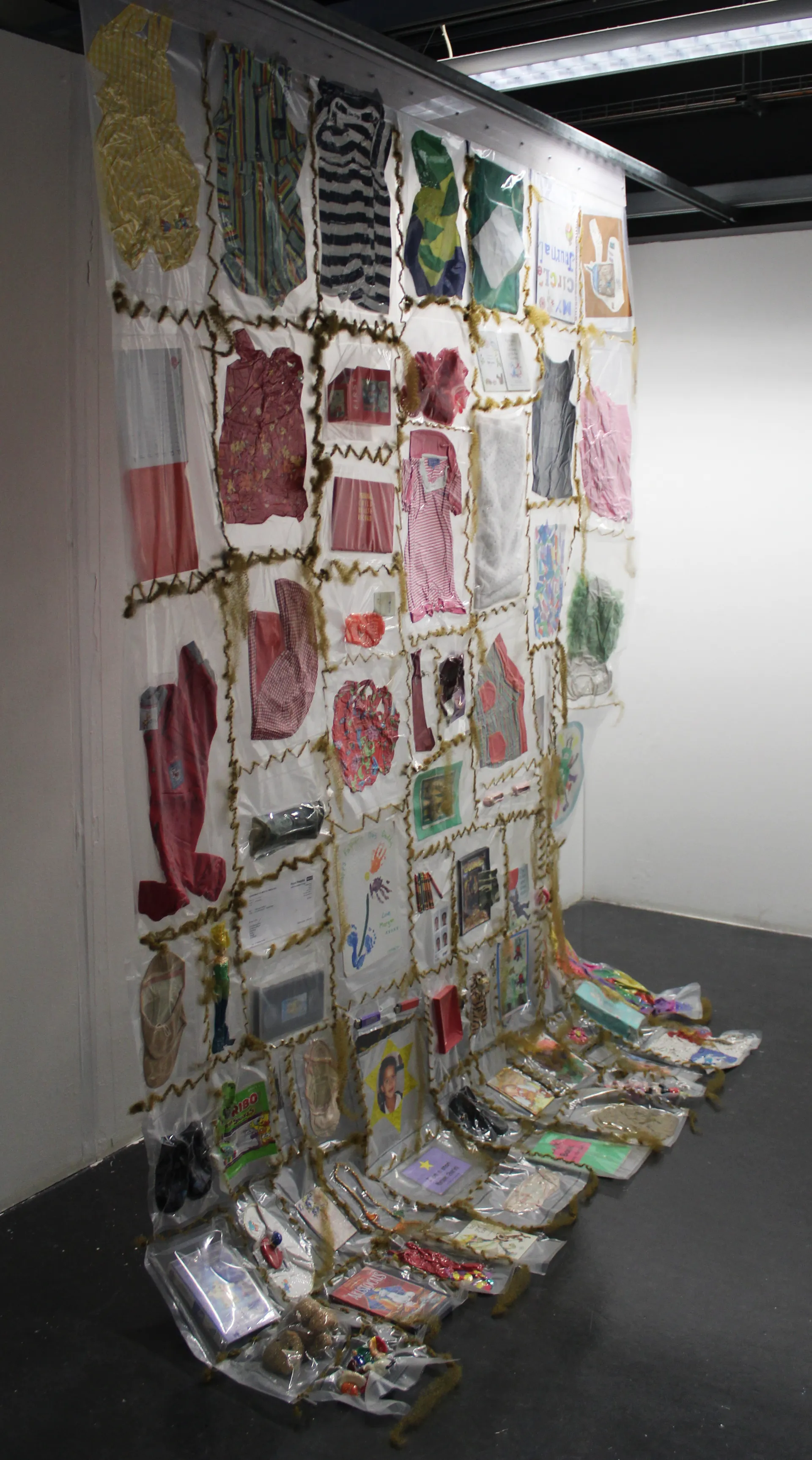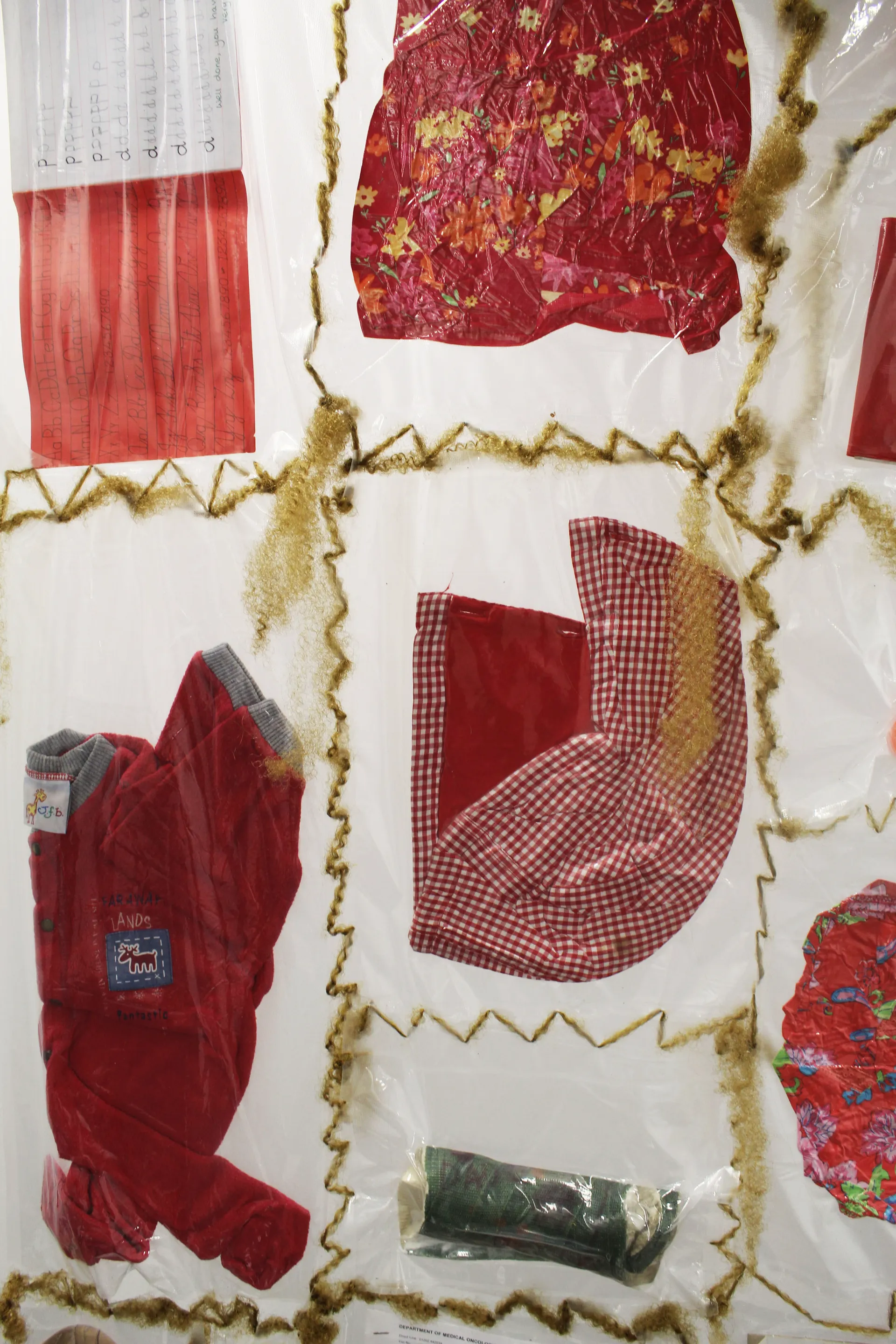 ‘Second Skin’ explores the preservation and protection of childhood memories whilst additionally considering themes of identity. This work is made up of 82 fragments of childhood memorabilia, including; photos, old clothing, shoes, toys, diaries etc. All of these objects are vacuum packed and sealed inside plastic pockets which are then individually sewn together with synthetic braiding hair. These items are encased within this plastic skin in an act of conservation, the braiding hair being a representation of a dominant part of my identity and is utilised throughout the black community when protective hairstyles are done. ‘Second Skin’ shows a story from pieces of a person, the connection between object and memory and how this supplies solace.