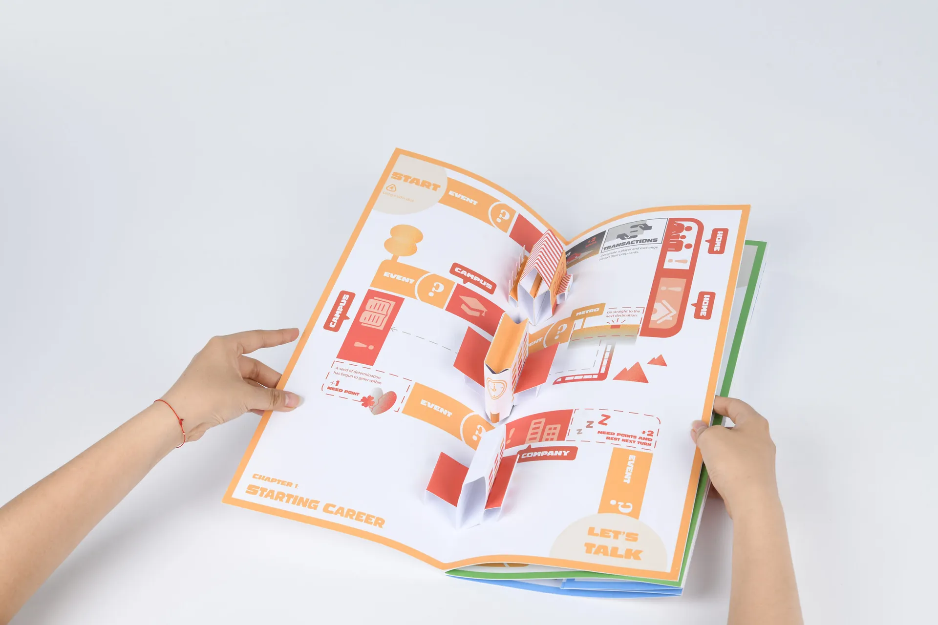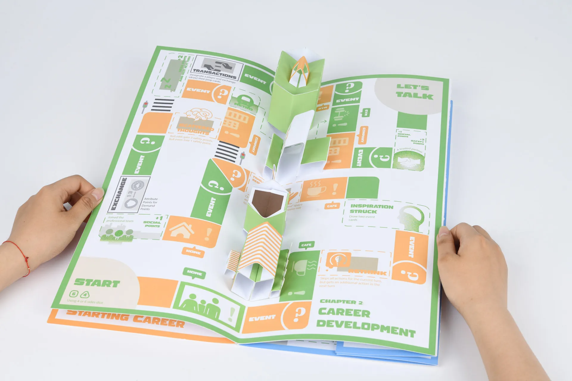 Mulan is a multiplayer strategy board game that focuses on the experiences and personal growth of women in the workplace in China. The game takes the form of a pop-up book with pages illustrating the challenges women may encounter in society. Using news, policies, and interviews, the game helps players understand and remember events that impact the personal development of women in China. Players make strategic decisions from a first-person perspective. The game’s design and presentation are gender-neutral, aiming to enhance player immersion and deepen understanding of professional women among diverse groups of people.