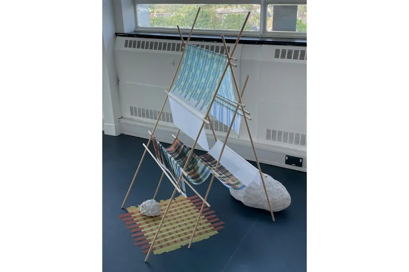 For my Final piece of my FMP I have made a sculptural structure which includes digital fabric prints and plaster rocks. I have been looking at puzzles and networks for this project, playing with games and the child’s perspective. For my final piece I wanted to create my own puzzle, inspired by games like Jenga and pick up sticks. My intention was to make a wooden structure which could be fitted and balanced in different arrangements.