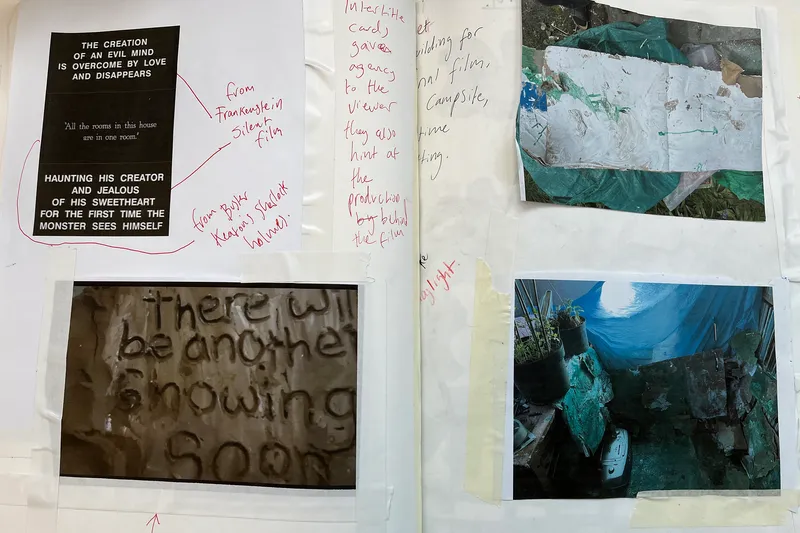 I have made a film about attempting to make a film, including scenes about auditioning, acting, rehearsing whilst the sets and facade of the narrative is falling apart around the character. Using materials from the film and some of the props , swell as some new props made particularly for the instillation I built a campsite space that the film is played in.