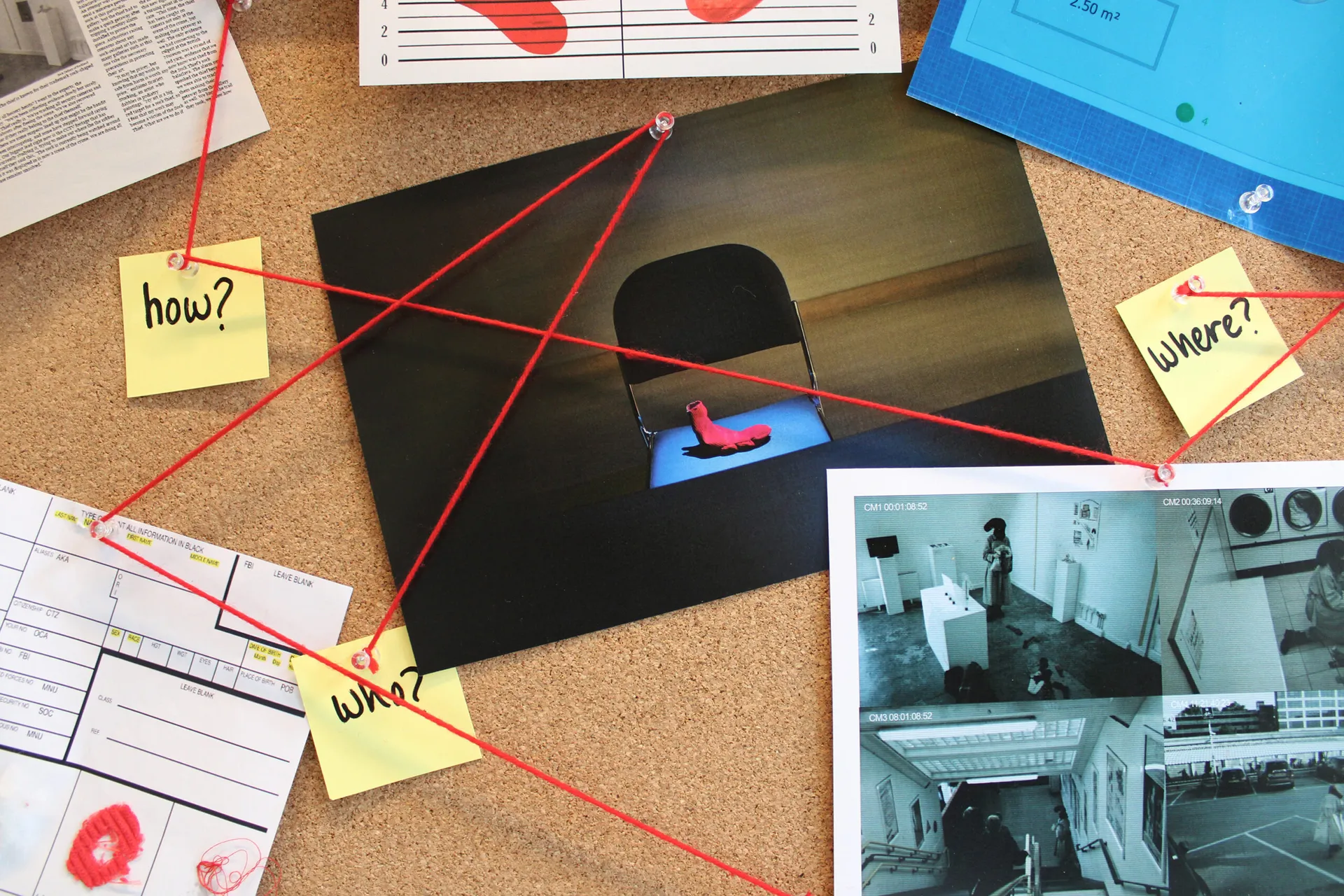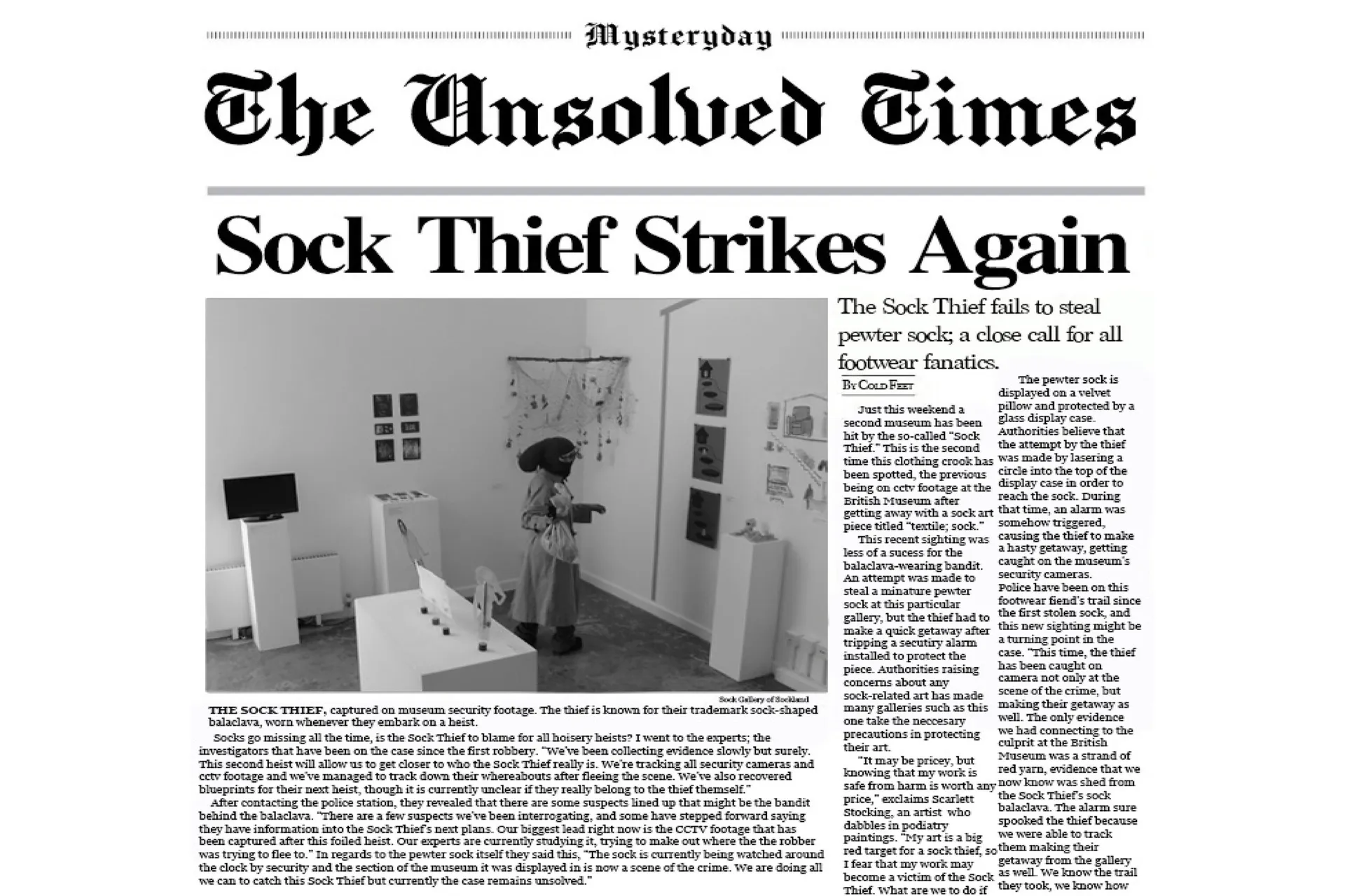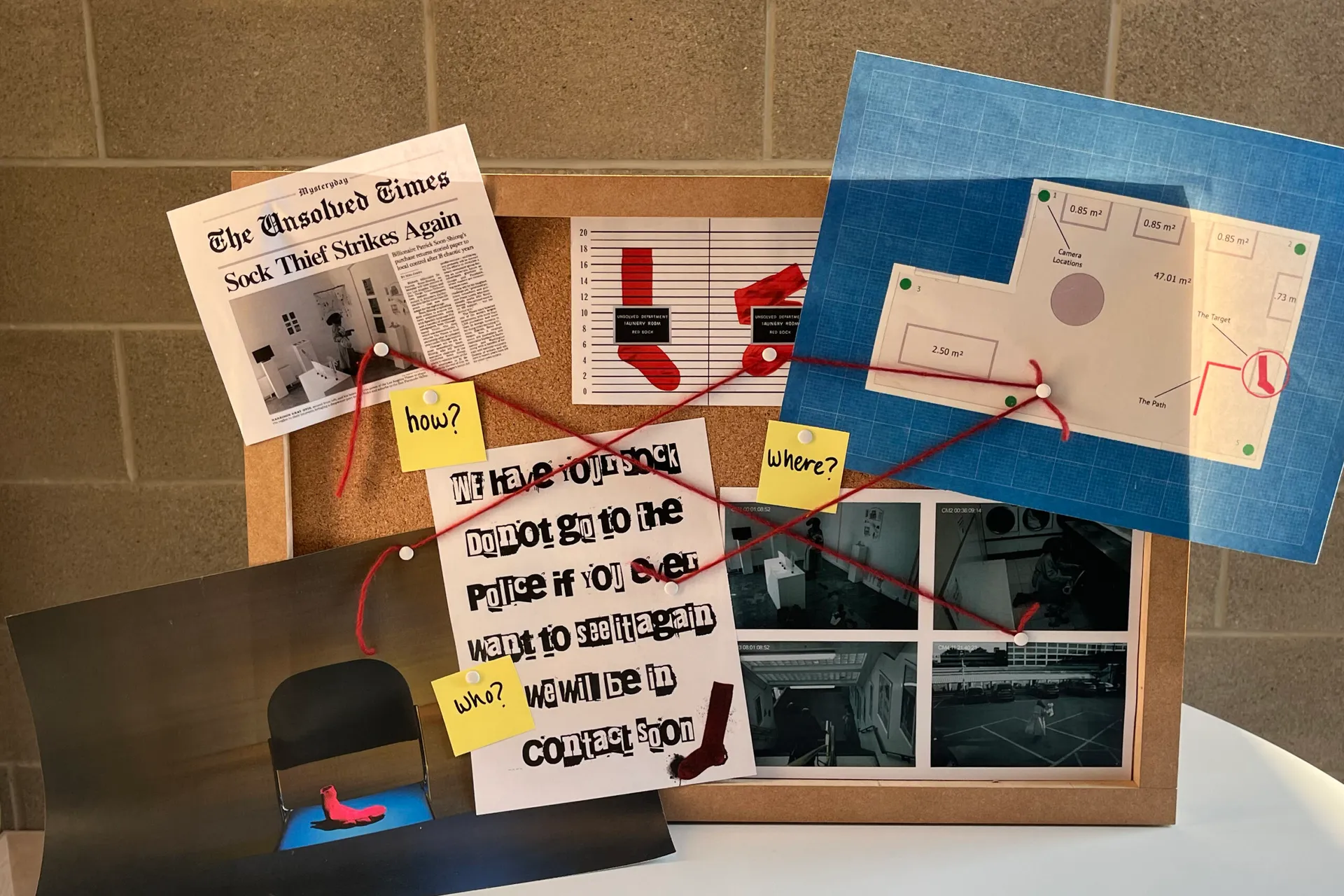 I’ve designed and made an investigation board filled with photography and documents that exist as possible clues in the case. Interrogations of sock suspects, CCTV footage of the Sock Thief, and sock heist blueprints are just a few of the pieces of evidence that are tacked on the board.