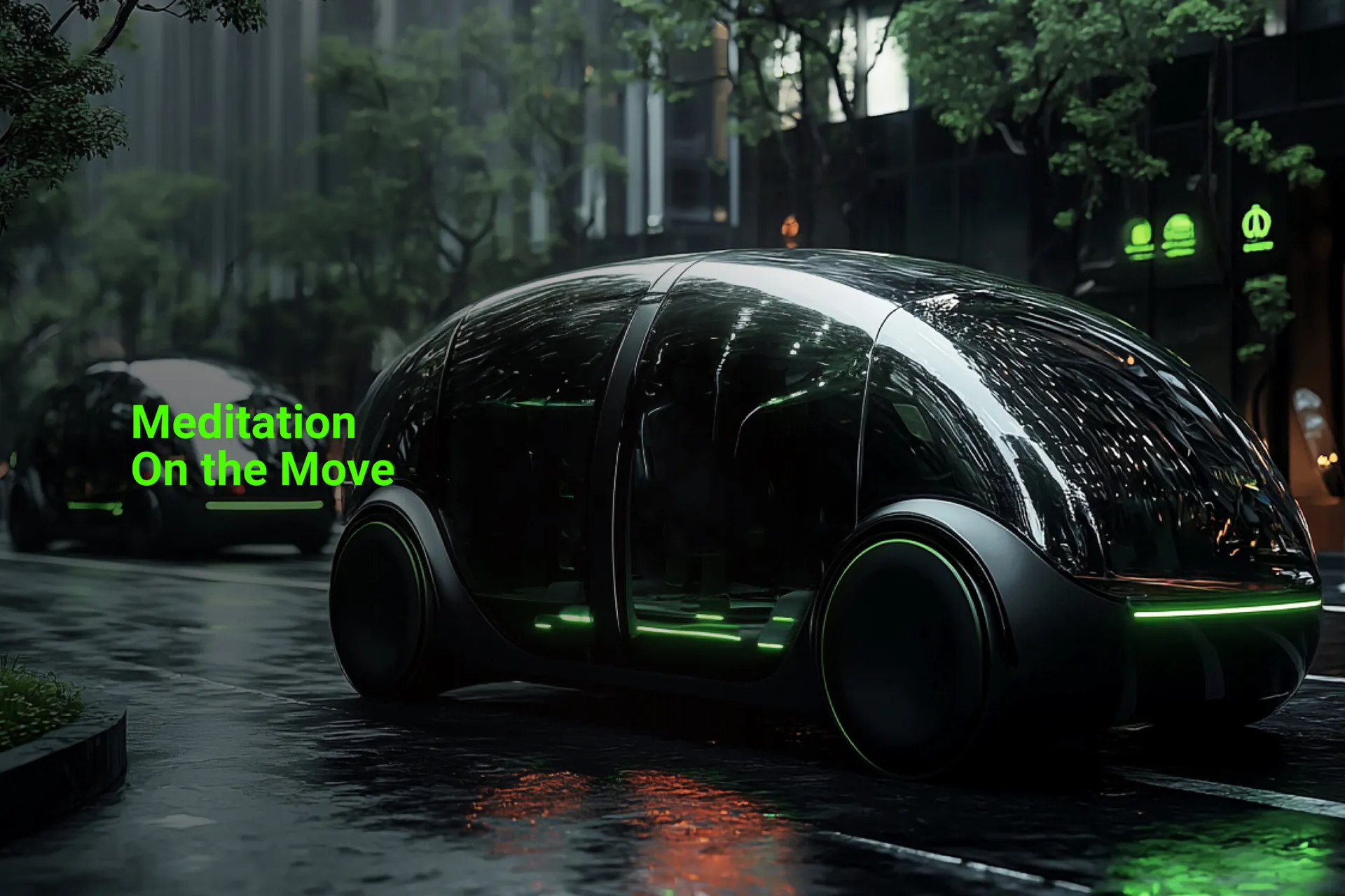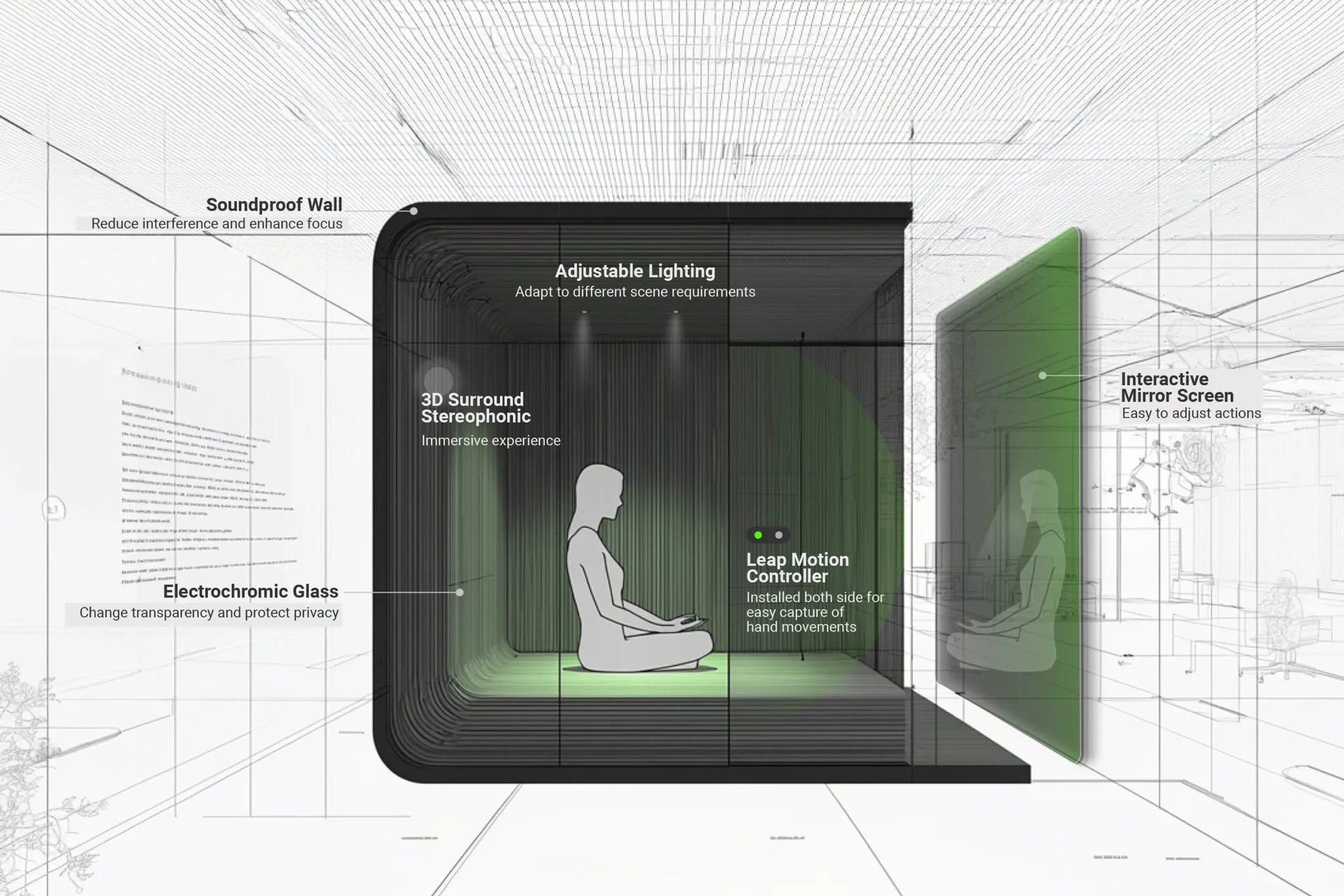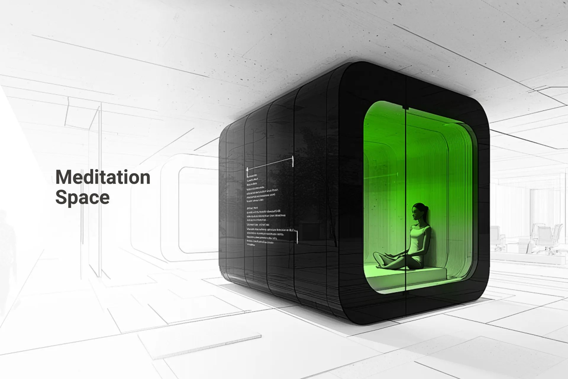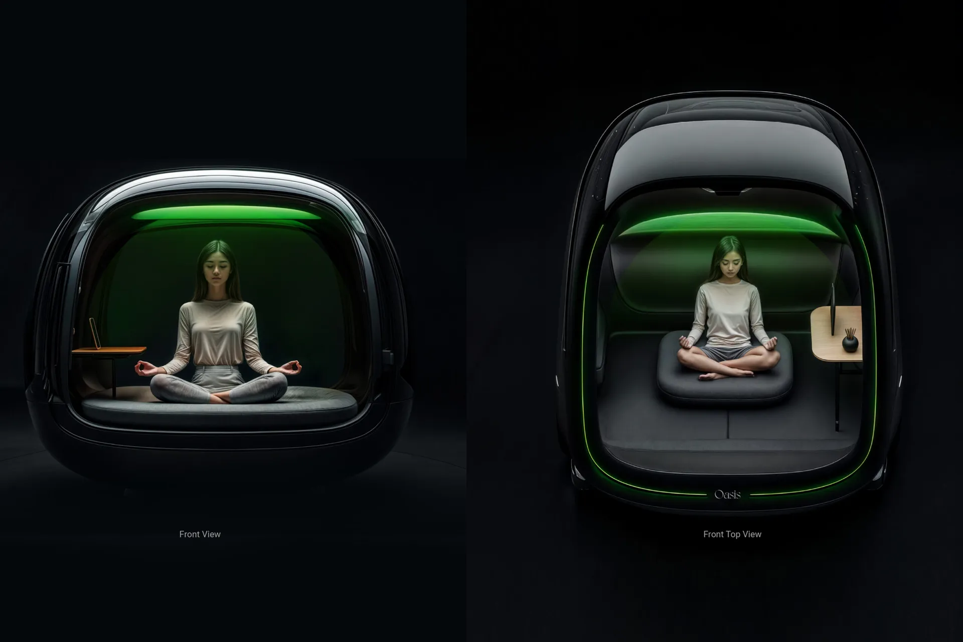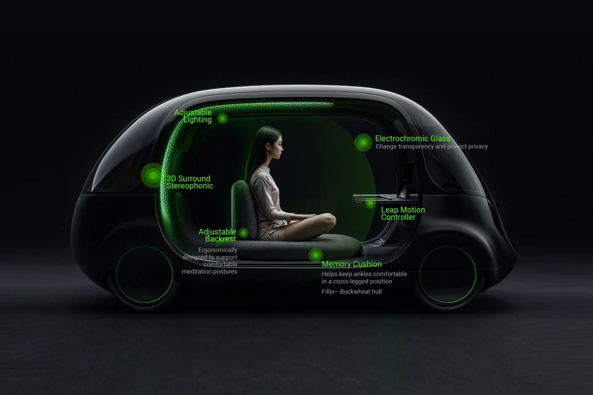 Our innovative approach offers two accessible meditation scenarios: 1. upgrade office booths repurposed as serene meditation spaces. 2. mobile meditation environments within autonomous vehicles. These flexible options allow users to practice mindfulness conveniently during work or on the move, fostering mental clarity, reducing stress, and enhancing well-being.