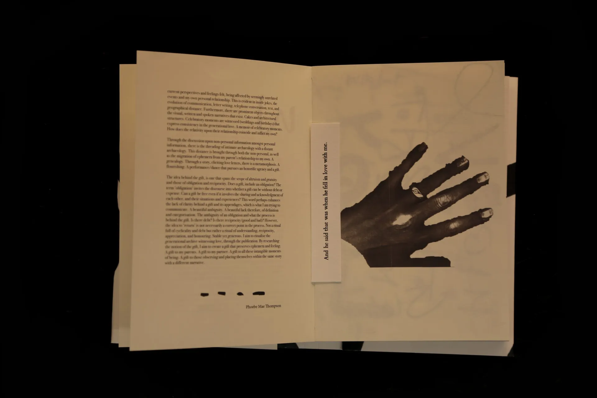 Through the discussion upon non-personal information amongst personal information, there is the threading of intimate archaeology with a distant archaeology. This distance is brought through both the non-personal, as well as the migration of ephemera from my parent’s relationship to my own. A genealogy. Through a story, eliciting love letters, there is a metamorphosis. A flourishing. A performance/dance that pursues an honorific agency and a gift.