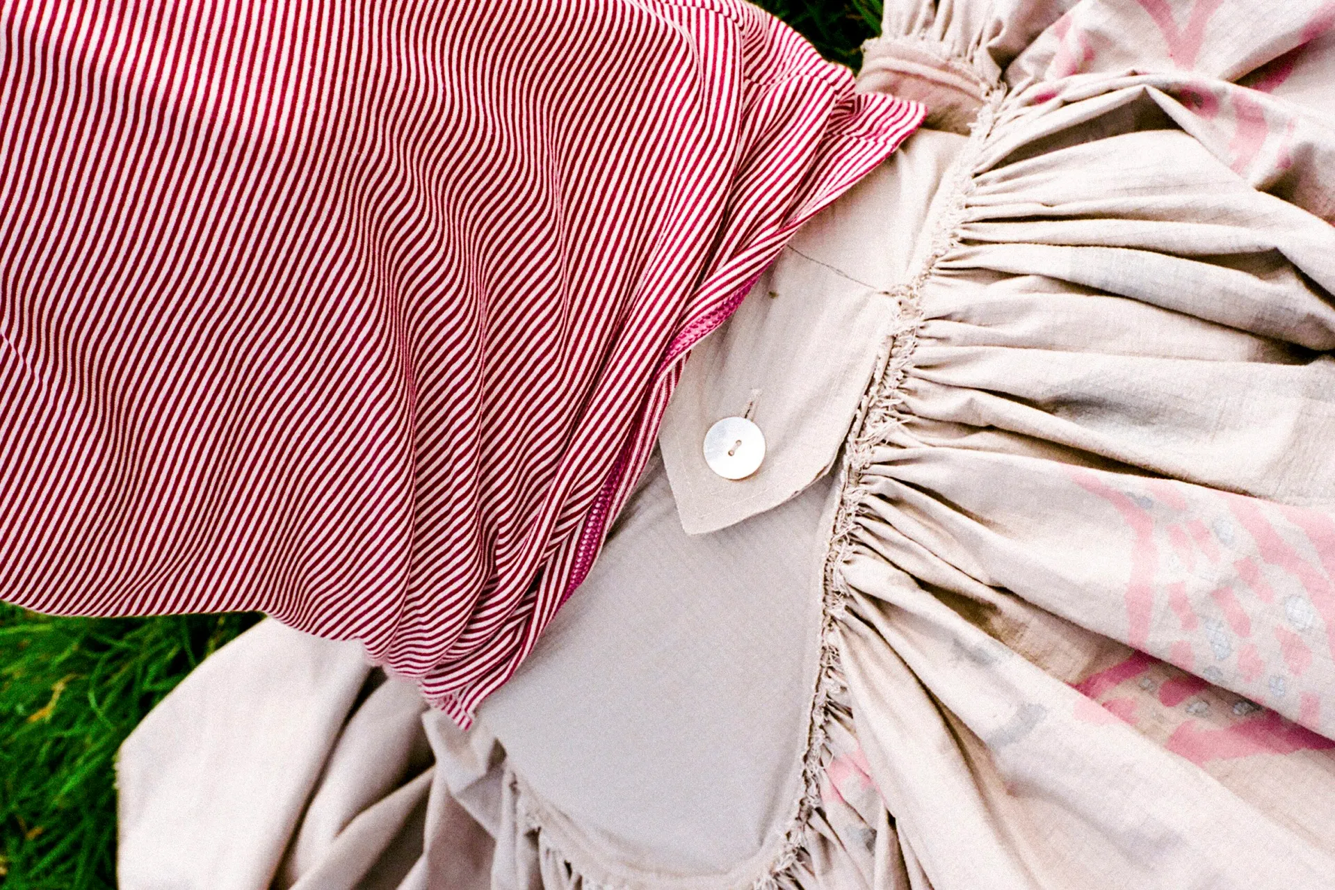 The photoshoot was a crucial element in bringing this collection to life, not only capturing the essence of Angela Carter’s storytelling but also weaving its own unique narrative. I invited friends, women who hold significant places in my life, to model my work. This allowed me to highlight the intricate layers of the collection – from woven fabrics to knits and prints – each element building upon the other to create a bright and tangible fantasy. The result was a rich tapestry of textures and colours that tell a story on their own.