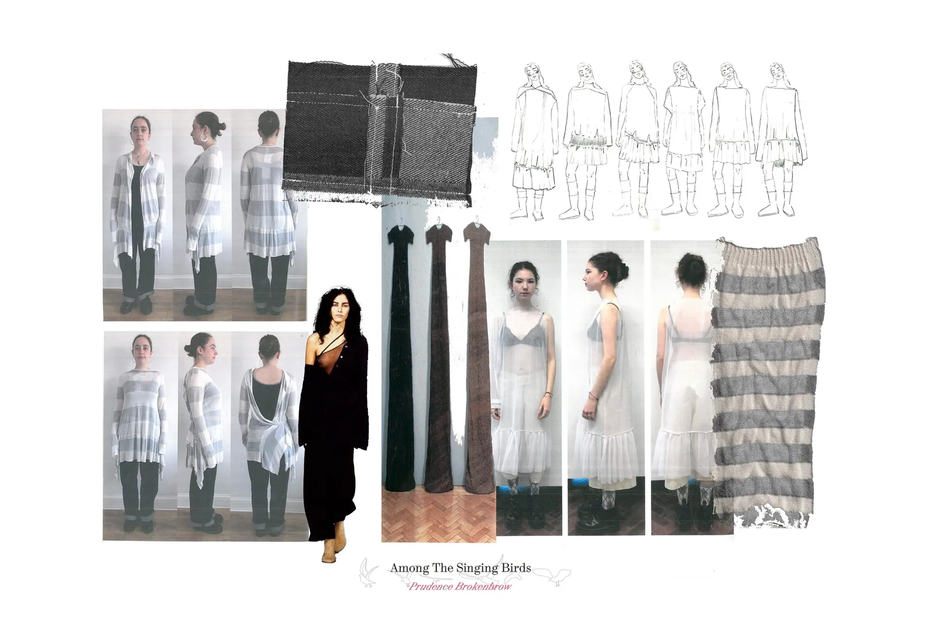 I have used a mixture of woven and knit, some new and deadstock, to create a textural collection that immerses the wearer into this fairytale world. My work features hand drawn one off monoprints, with the aim of emphasising this narrative and highlighting the ephemeral nature of folklore and the act of handing down stories.