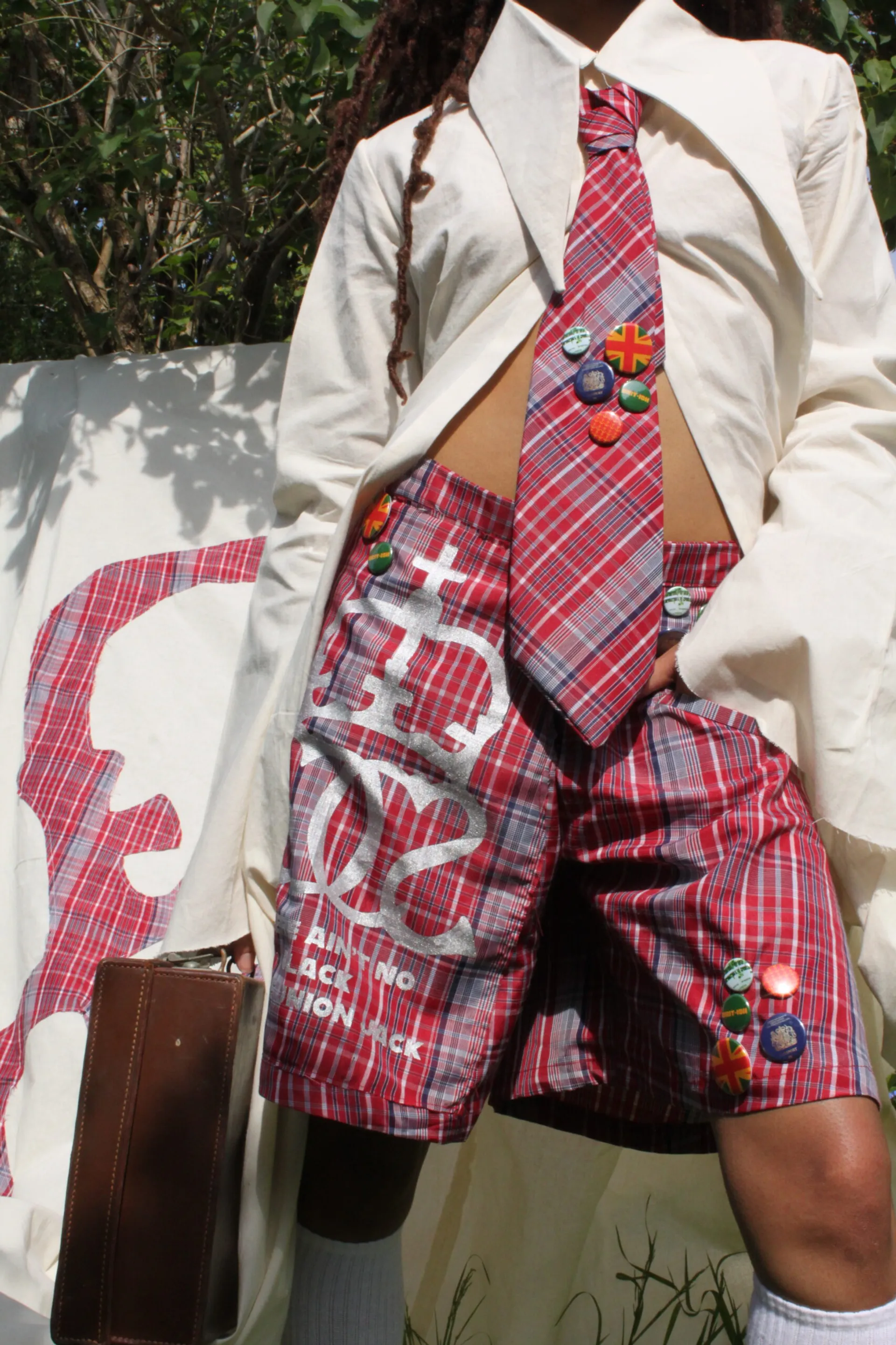 Screen printing was used within the print design of the shorts. They feature a crown, sat atop the letters S and C, which is the symbol for the slave-trading South Sea Company. That was owned and profited by the British Royal family. This symbol was used to brand Jamaican slaves. With the use of this symbol, it acts as a reclamation and subversion to raise awareness of the dark history behind monarchical insignias. As well as prompt a deeper thought around the symbolism within British culture that have an imperialistic past.