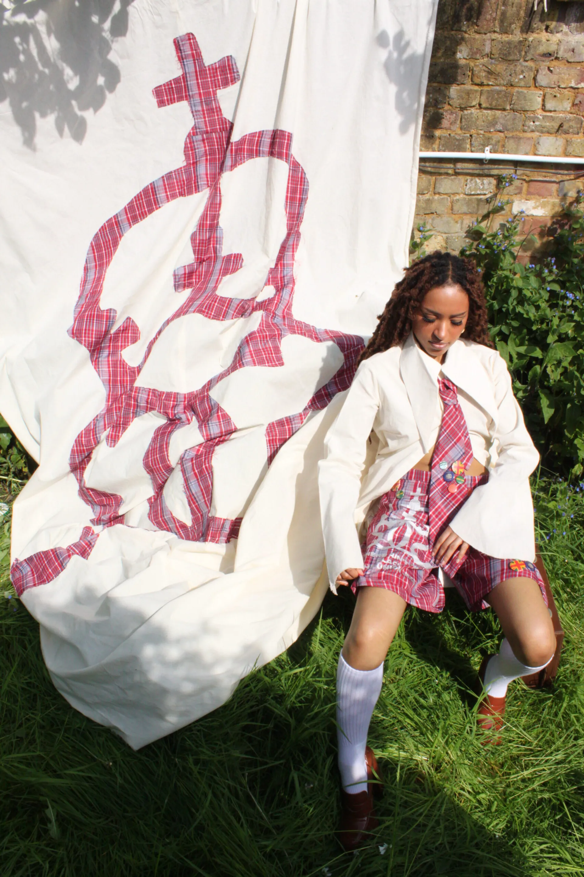 The installation explores the materiality of Jamaican Bandanna fabric, which is a part of Jamaican national dress. The similarities to tartan, act as a reminder of the colonial impact that Britian has left within the country. And how the two countries mergence in culture started long before HMT Windrush in 1948. The silhouette, however, was inspired by the way in which a new fashion aesthetic began to emerge in the 1970’s, through the Windrush generations interpretation of British fashion. The oversized collar, sleeves and train act as symbolism for this abstraction.