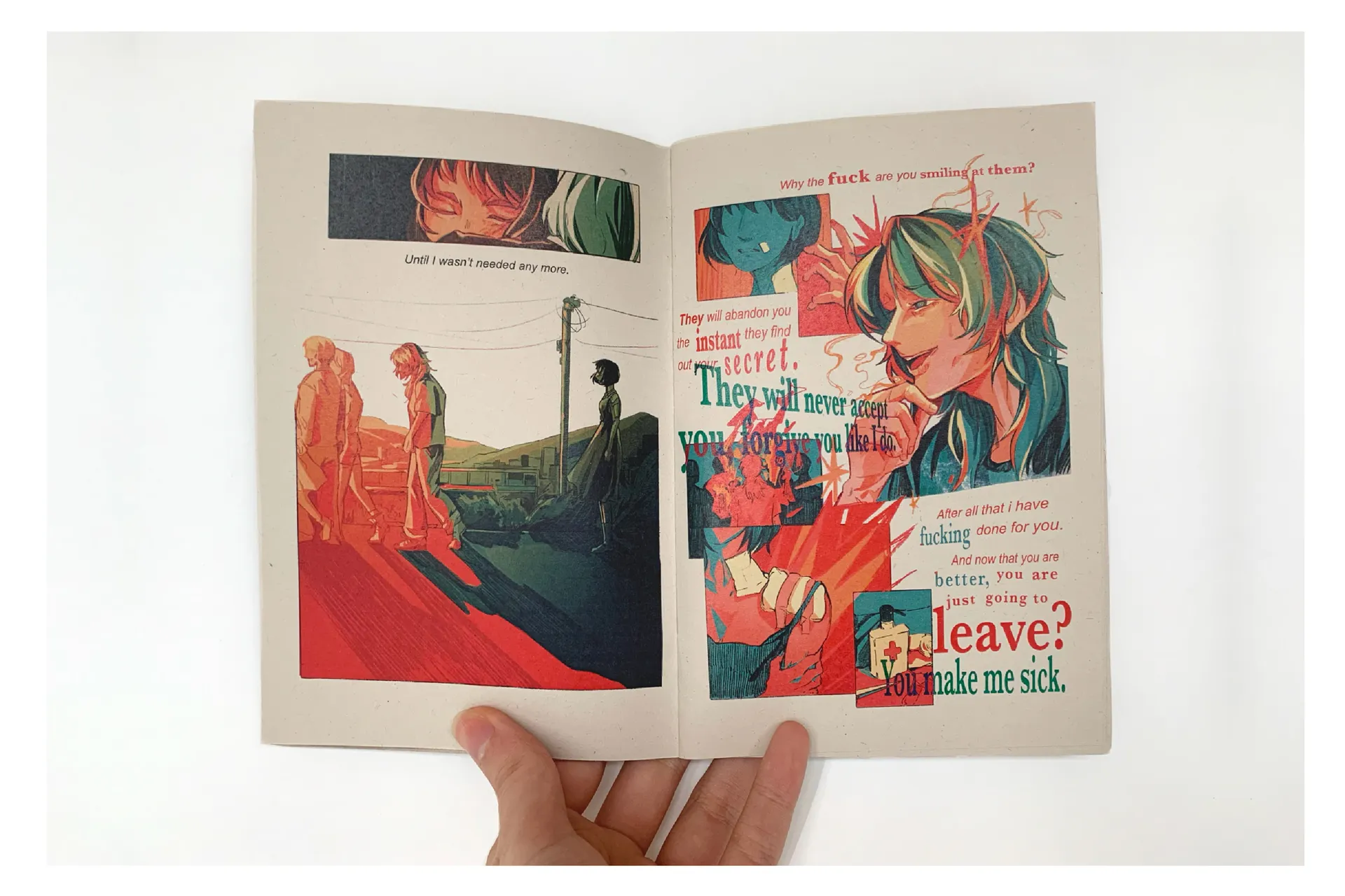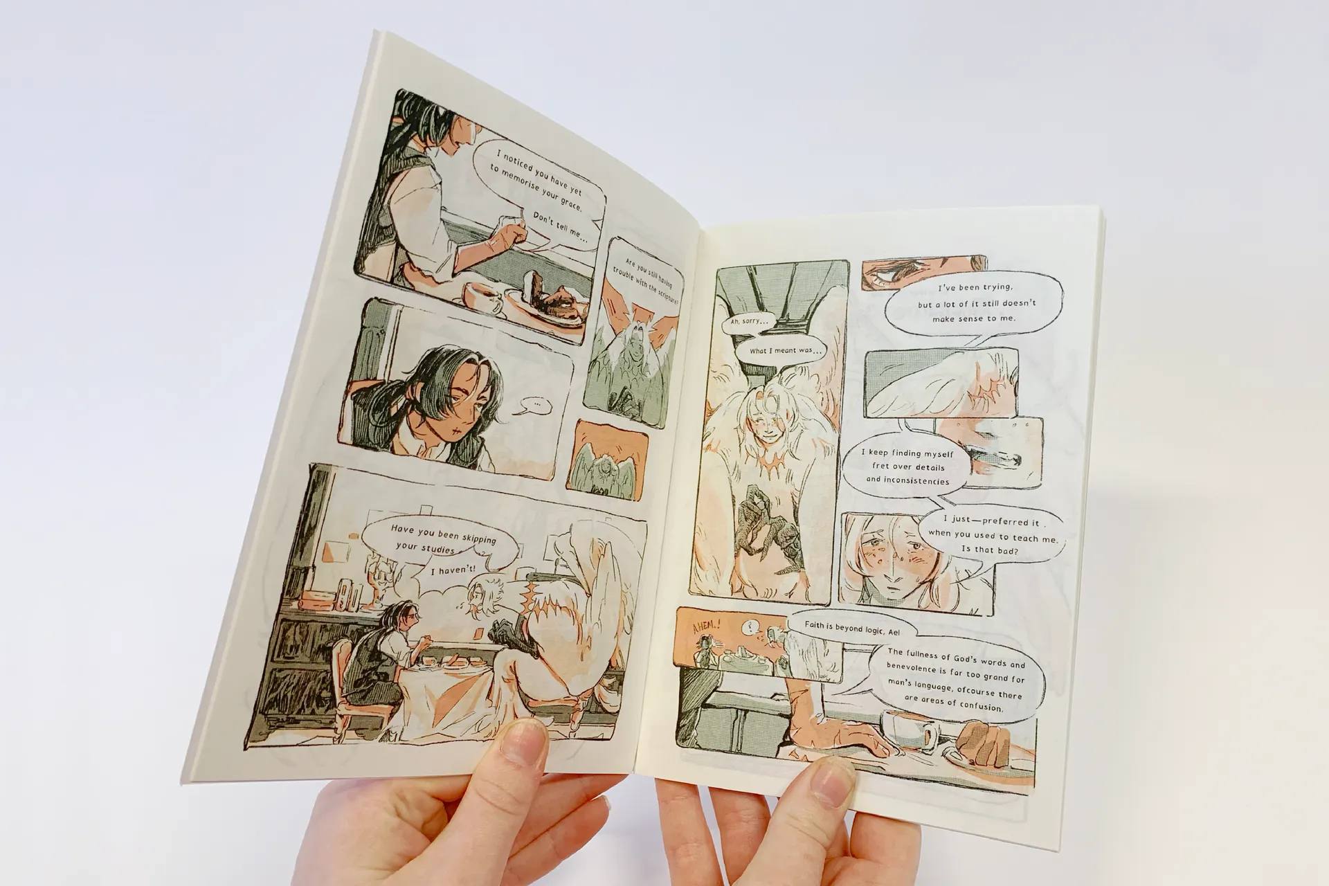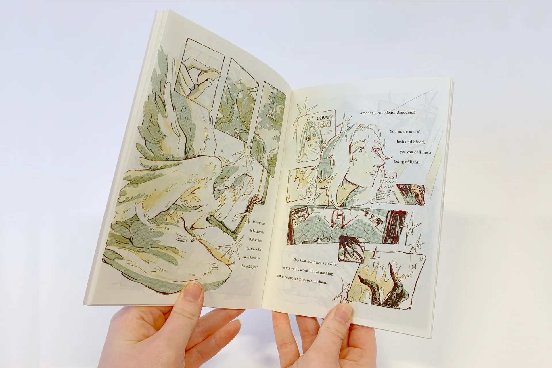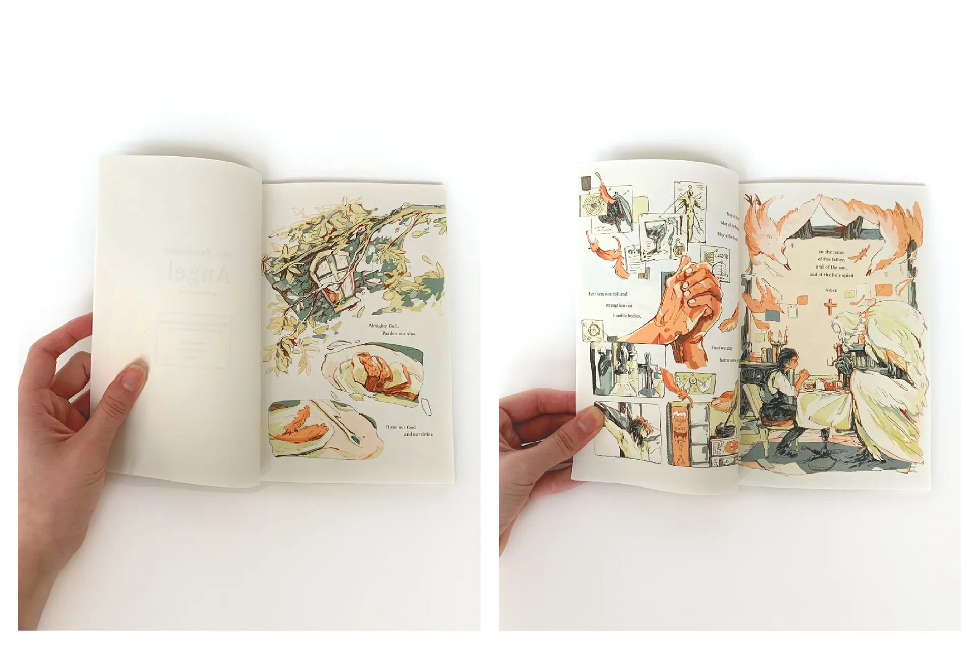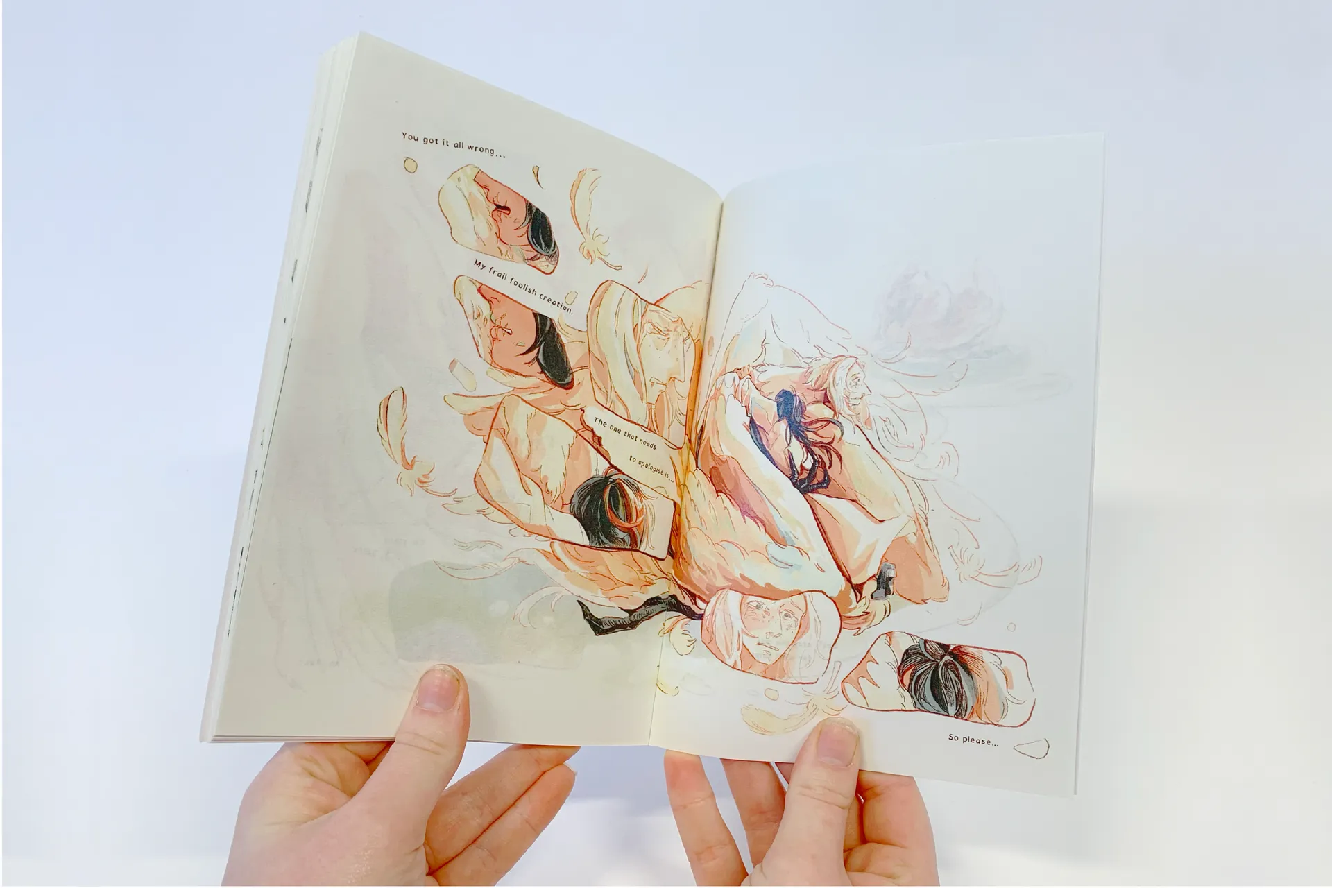 Rein Lee Banks is an illustrator based in London, specialising in visual storytelling, Book arts and graphic design. ‘My Taxidermy Angel’ is the most ambitious project of theirs yet: a coloured 60 page graphic novella, written and illustrated on their own. Feeling comforted by those that hurt us, worshipping those that are considered monsters, and wanting to remember your darkest days as something beautiful, Rein paints a beautiful, bittersweet story that explores the complicated feelings that accompany us when trying to heal from our past.