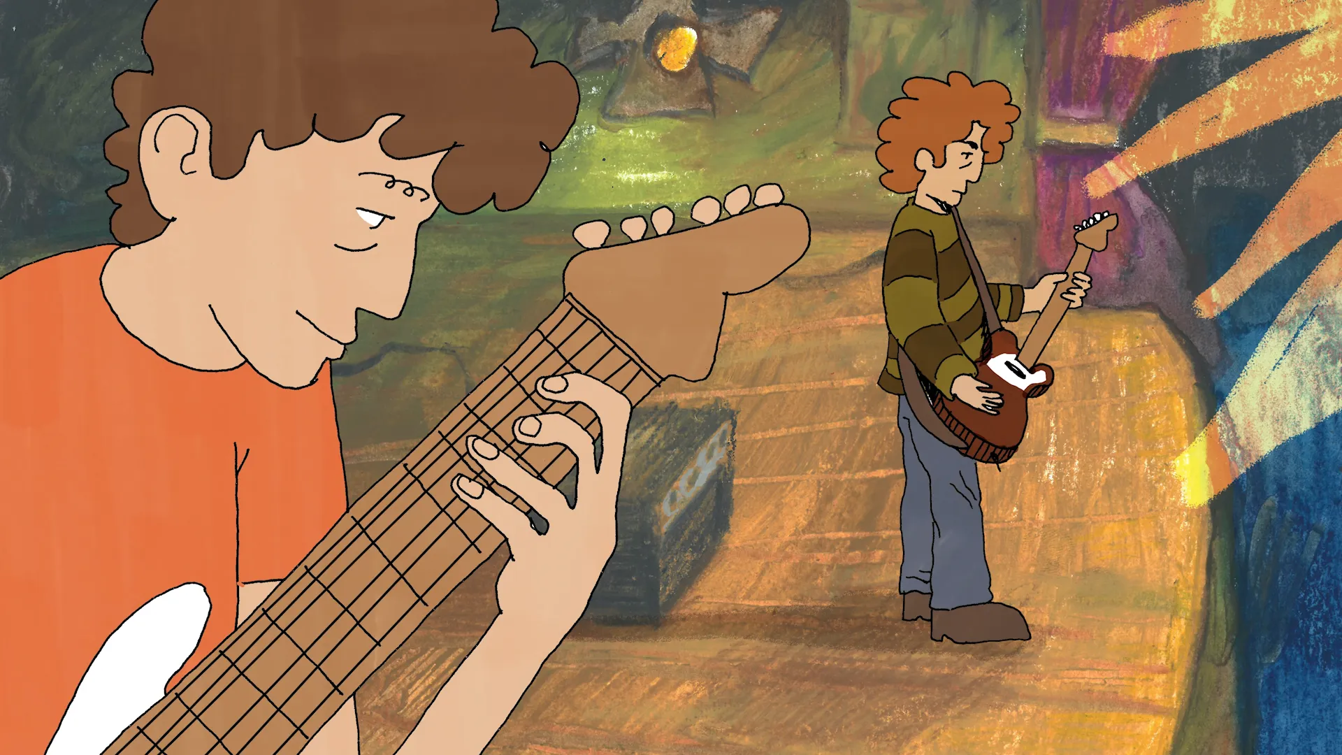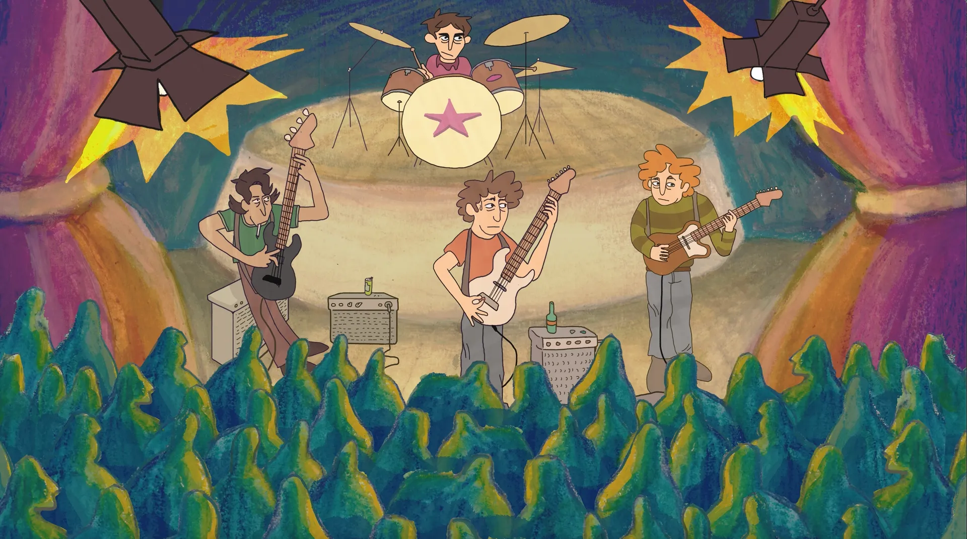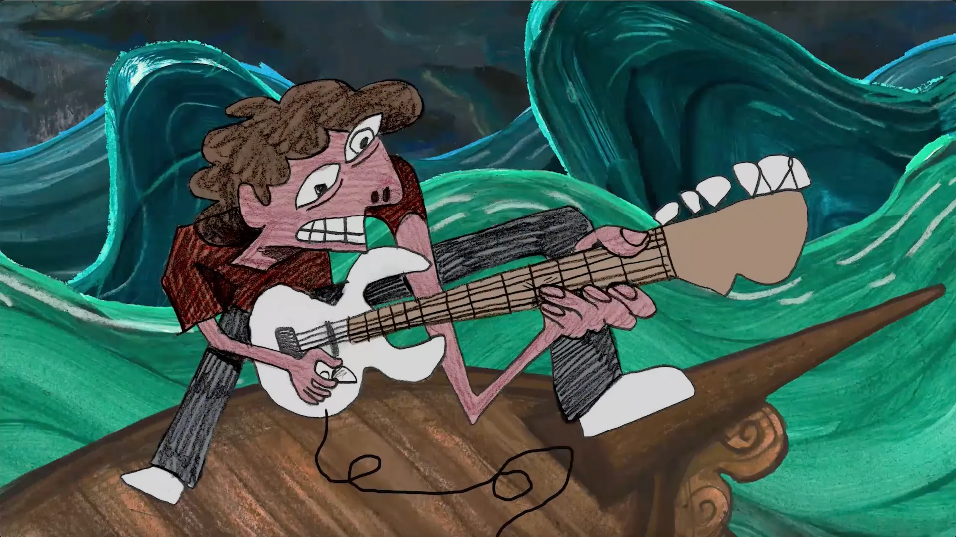 ‘Imagine the Audience Naked’ is a mixed media animation that follows funk band Grog Machine as they walk out into the spotlight. Reuben uses digital media as well as pencil, pastel, acrylic paint, and colour pencil in this animated short film.