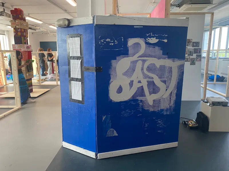 This free-standing sculpture intervenes the exhibitions space, becoming an obstacle that defines the direction and way you move around it, functioning in the same way hoarding defines the space it demands, bringing an awareness to the inside space that was once public which you do not share with it.
