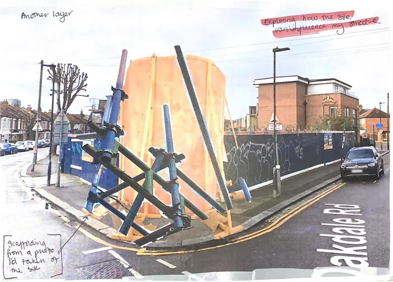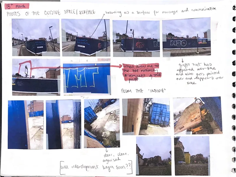 Hoardings are barriers that conceal spaces, but they also act as surfaces that facilitate conversation and visibility e.g. through graffiti tags and fly posting. The sculpture utilises this dual function. From the front, the hoarding is to a large extent used as a public canvas, one where people claim their space through such tags despite methods of removal and editing made by official councils. Round the back, this once very public online conversations are revealed, found from blogs about The Oakdale Arms. Here information and text is not edited or selected but the whole timeline of conversation is accessible.