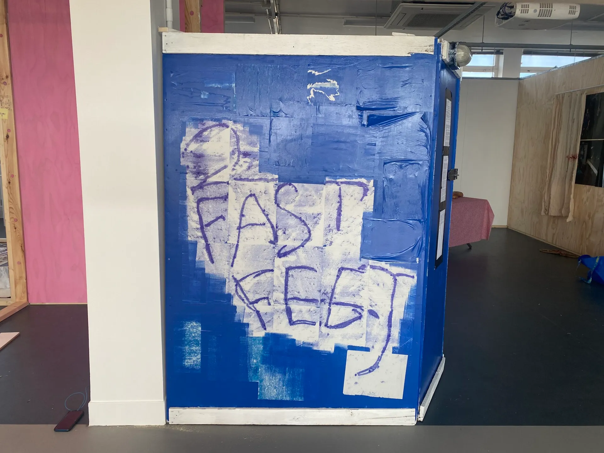 This free-standing sculpture intervenes the exhibitions space, becoming an obstacle that defines the direction and way you move around it, functioning in the same way hoarding defines the space it demands, bringing an awareness to the inside space that was once public which you do not share with it.