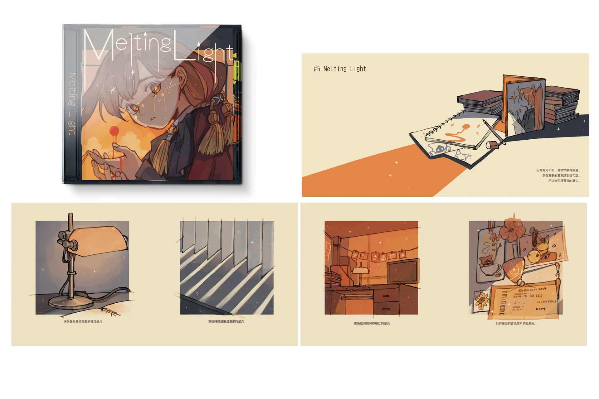 The content of the project will be presented in the form of a series of CD albums. Through the concept of albums and music preserving culture and spirit for generations and the sense of embodying the relationship between album design and artistic illustrations, this project creates a journey that allows the audience to experience “recording and memories” from multiple aspects.