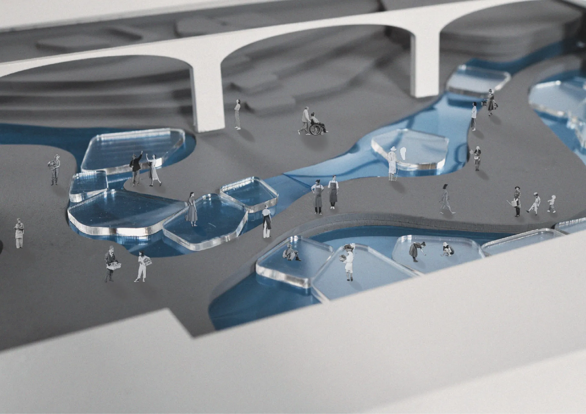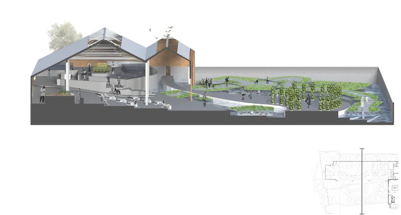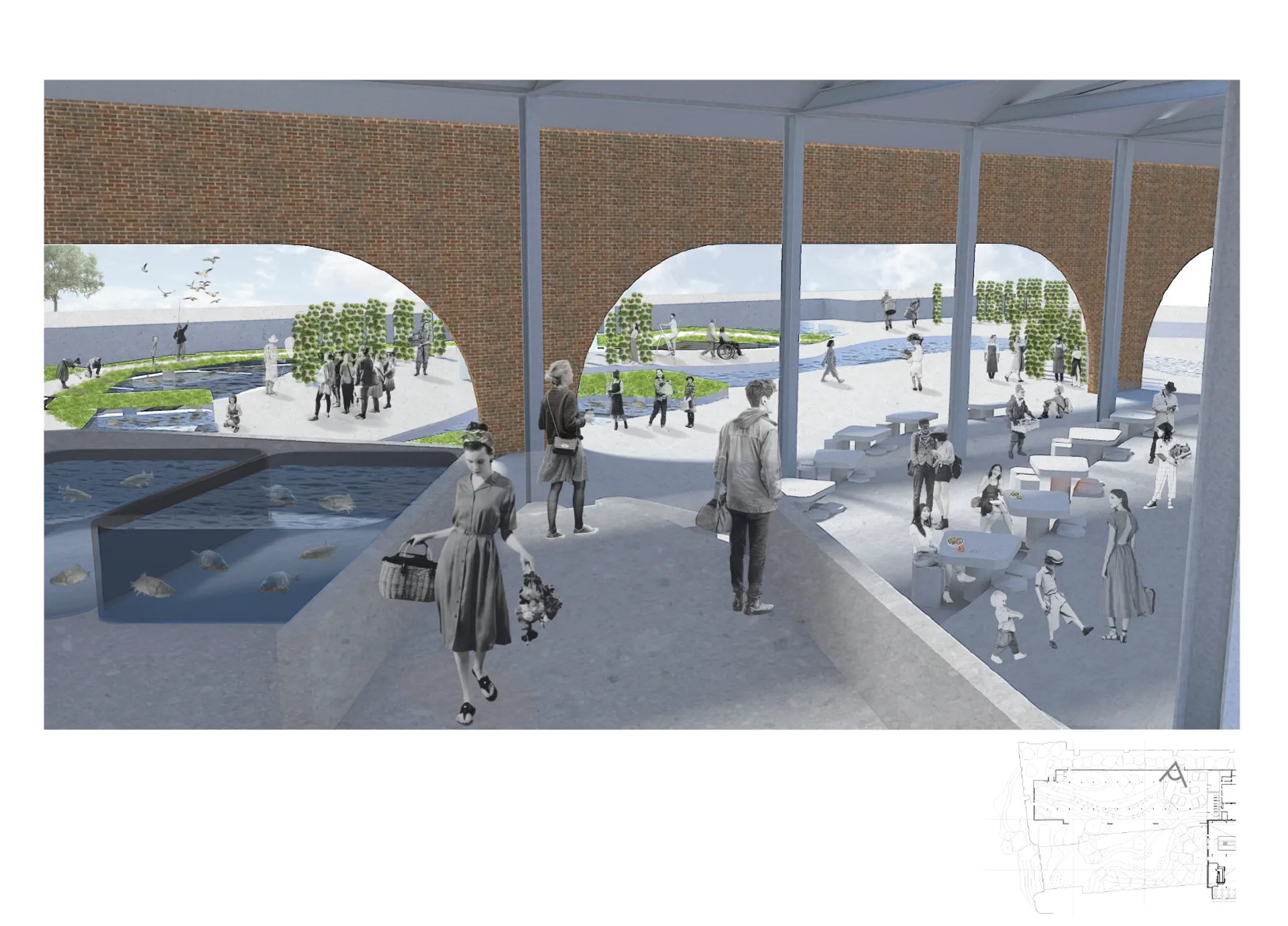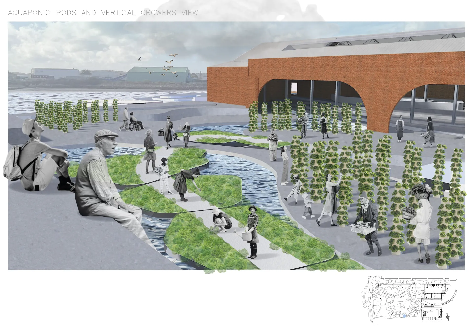 Based on these findings, I envisioned a solution to unify and benefit the community: an aquaponic farm and restaurant named “Pods of Plenty.” This location offers a comprehensive visitor experience, showcasing each stage of production— from vegetable seeding and fish breeding to growth in aquaponic pods, harvest, cooking, and dining, all in one place. Visitors can also witness the composting process, where waste produced on-site is processed.