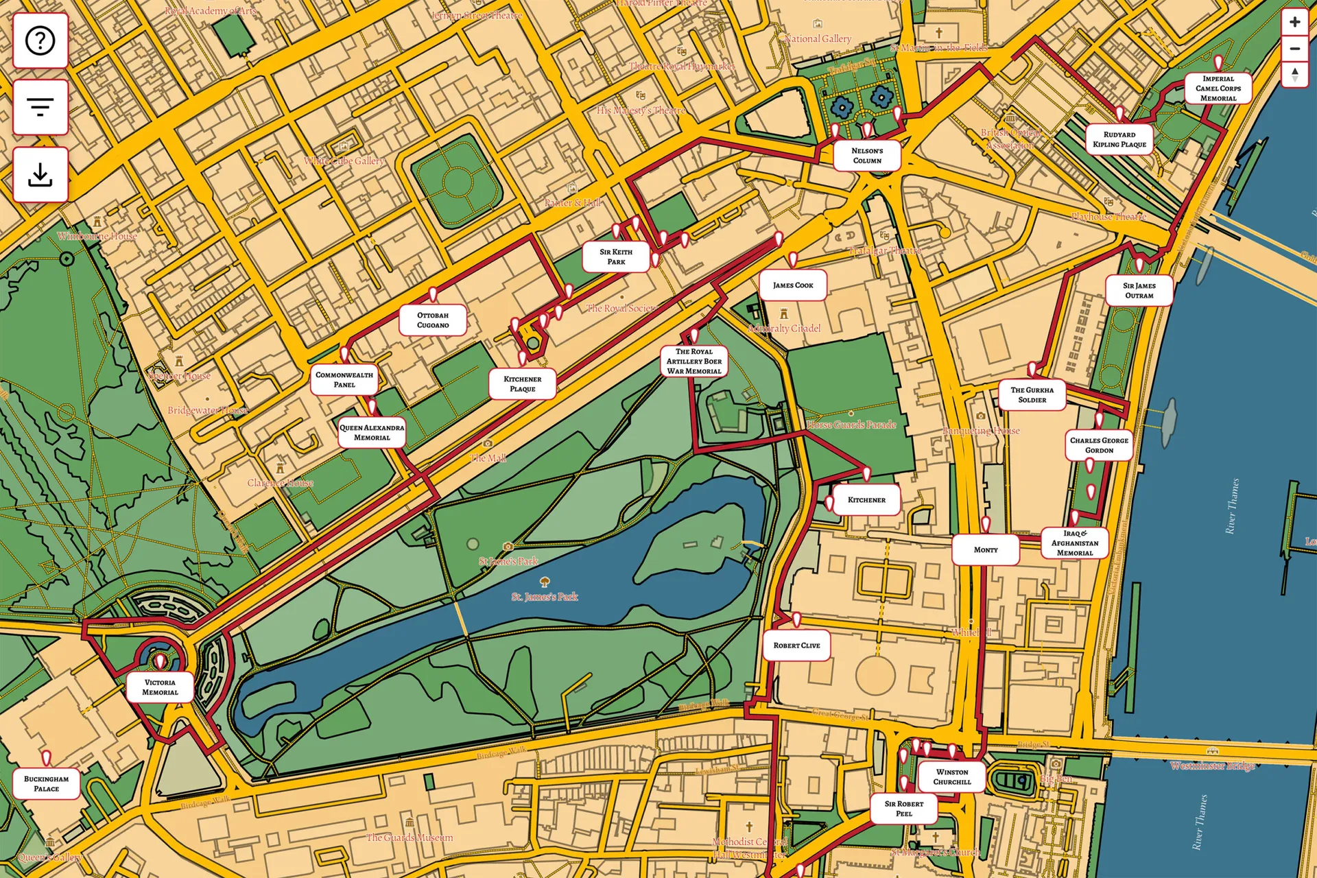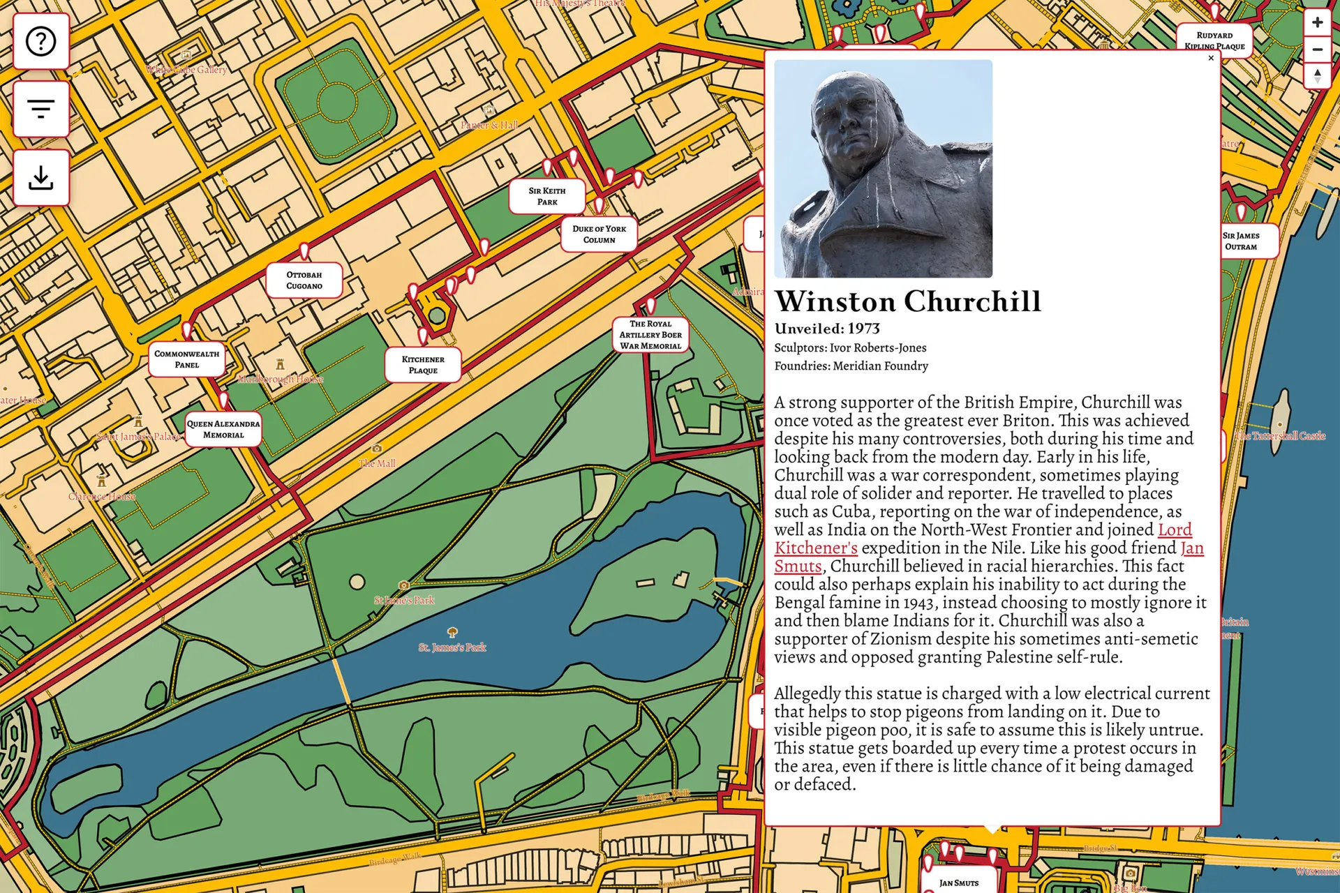 This project invites the viewer to explore the legacy of the British Empire through a multi-media discussion on the relevancy of monuments and statues around central London. The screen printed posters use layers to both highlight and censor certain figures or monuments, while the plaques also comment on the irrelevancy of some of these historical figures in the modern day. The interactive map invites users to find their own connections as well as follow a guided route highlighting many of the monuments that still exist in reference to the Empire.