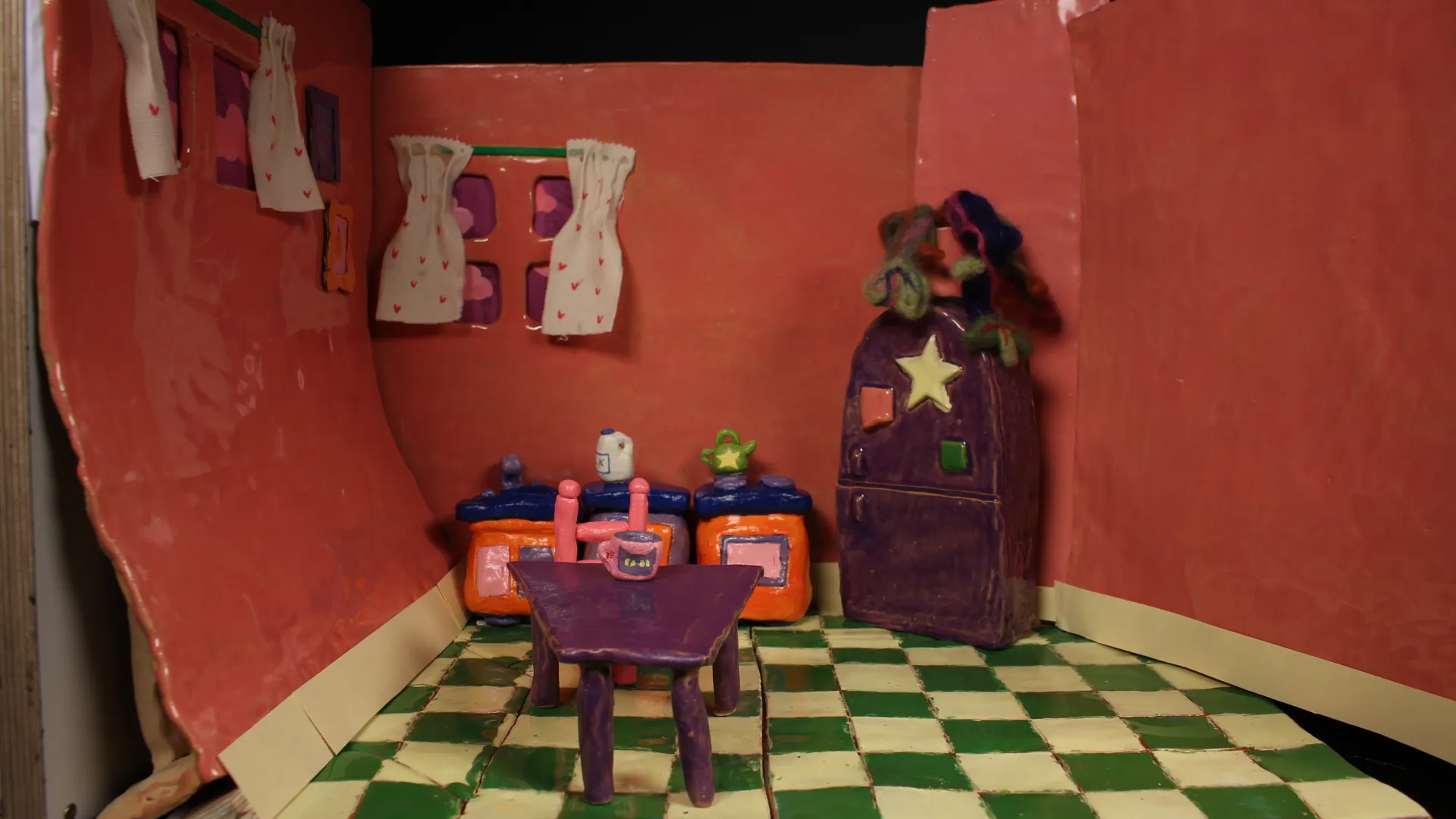 My film is a mix of 2D animation and stop-motion. It is character-based with a hand-made puppet that goes from a 2D environment to a 3D-glazed ceramic set. I was inspired by films such as Alice in Wonderland and Coraline, to create a contrast of eerieness/unease mixed with a cute and colourful design aesthetic.