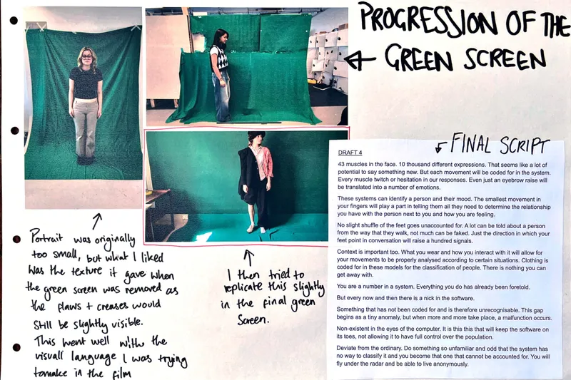For my FMP I have been looking at non-verbal communication and body language. Computers are now able to analyse our facial expressions to understand complex emotions and identify exactly two people’s relationship. Soon this will also be possible for body language. At the moment however, these systems are not 100% accurate, with quite a large margin of error. I have explored this gap in the software, thinking about ways that it may be possible to get past the system.