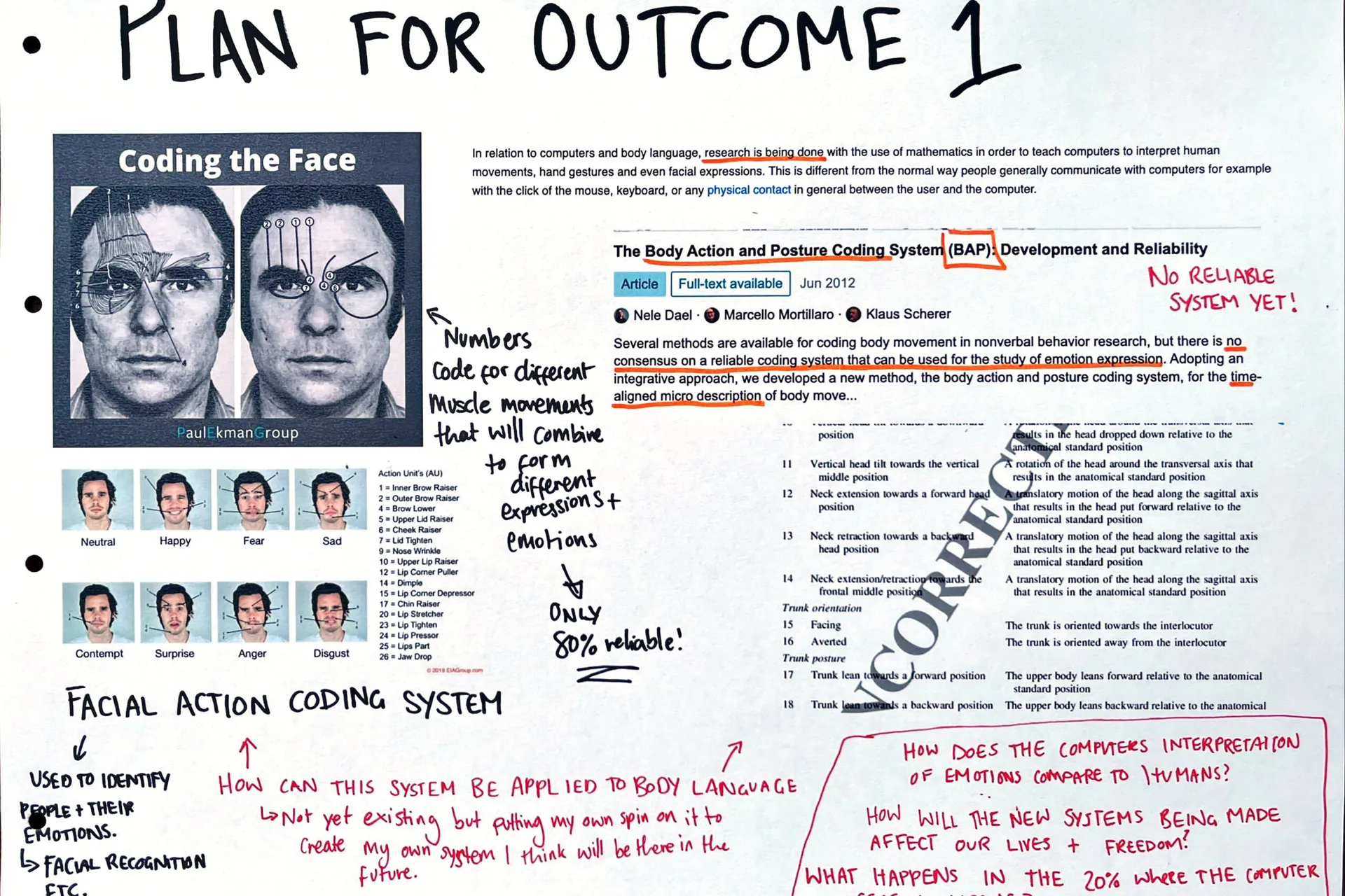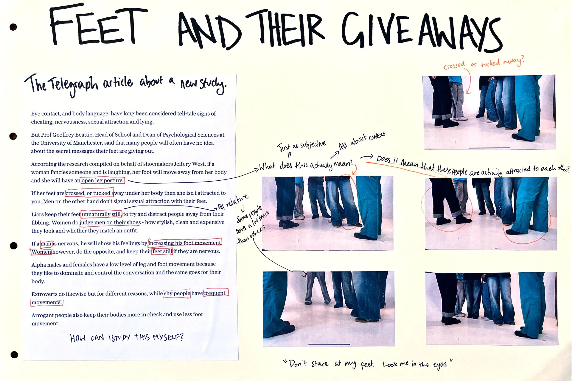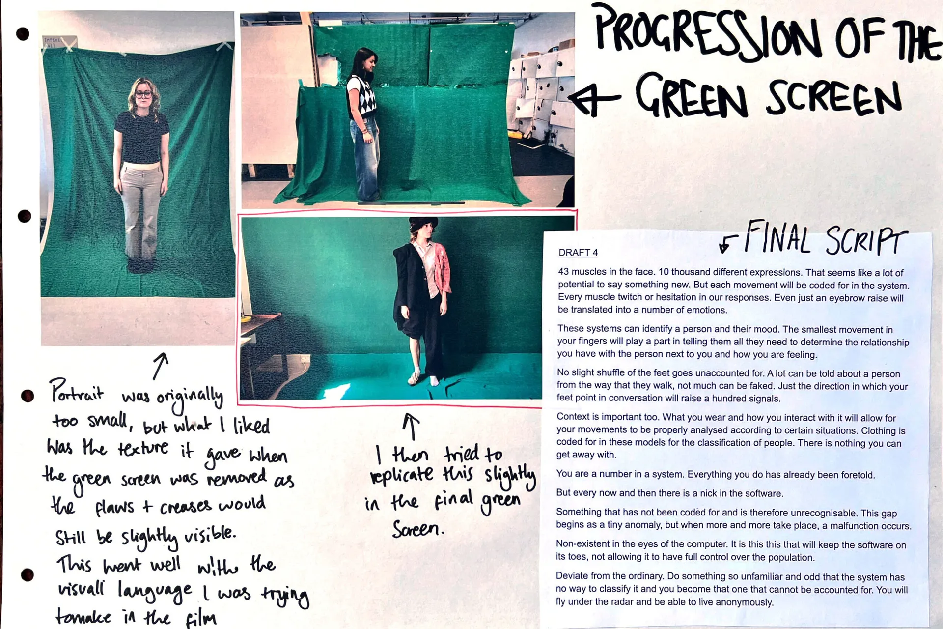 For my FMP I have been looking at non-verbal communication and body language. Computers are now able to analyse our facial expressions to understand complex emotions and identify exactly two people’s relationship. Soon this will also be possible for body language. At the moment however, these systems are not 100% accurate, with quite a large margin of error. I have explored this gap in the software, thinking about ways that it may be possible to get past the system.