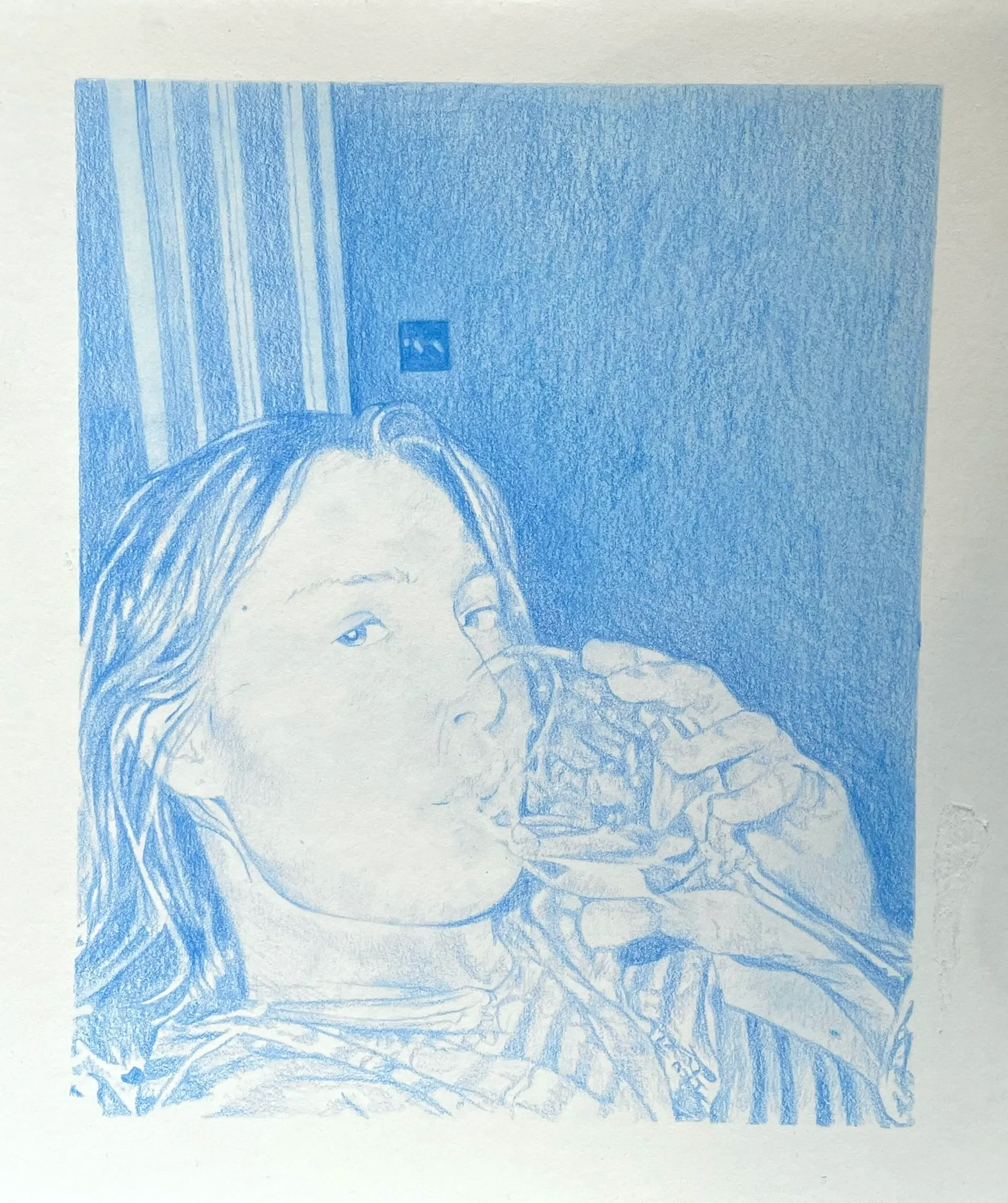 Her most recent project ‘Remembrance in Blue’ is an ongoing coloured pencil series drawn from original photographs and archival material collected by the artist. Through capturing fragments of time and the visual world experienced by the artist, the project offers a unique and thought-provoking exploration of the human condition. This work showcases the artist’s skill in interpreting and capturing the complex and nuanced emotions that define our shared humanity.