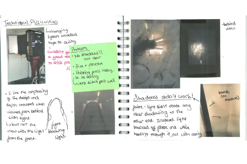 For my final outcome I’ve made a window/screen of connections whereby viewers are invited into the piece through their interactions with shadow. A light shining through the work activates it, casting imprinted patterning’s onto the white behind, here as an entrance into a darker space people walking through become part of the work.