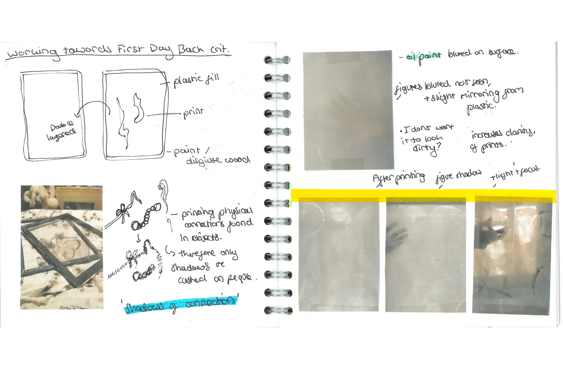 For my final outcome I’ve made a window/screen of connections whereby viewers are invited into the piece through their interactions with shadow. A light shining through the work activates it, casting imprinted patterning’s onto the white behind, here as an entrance into a darker space people walking through become part of the work.