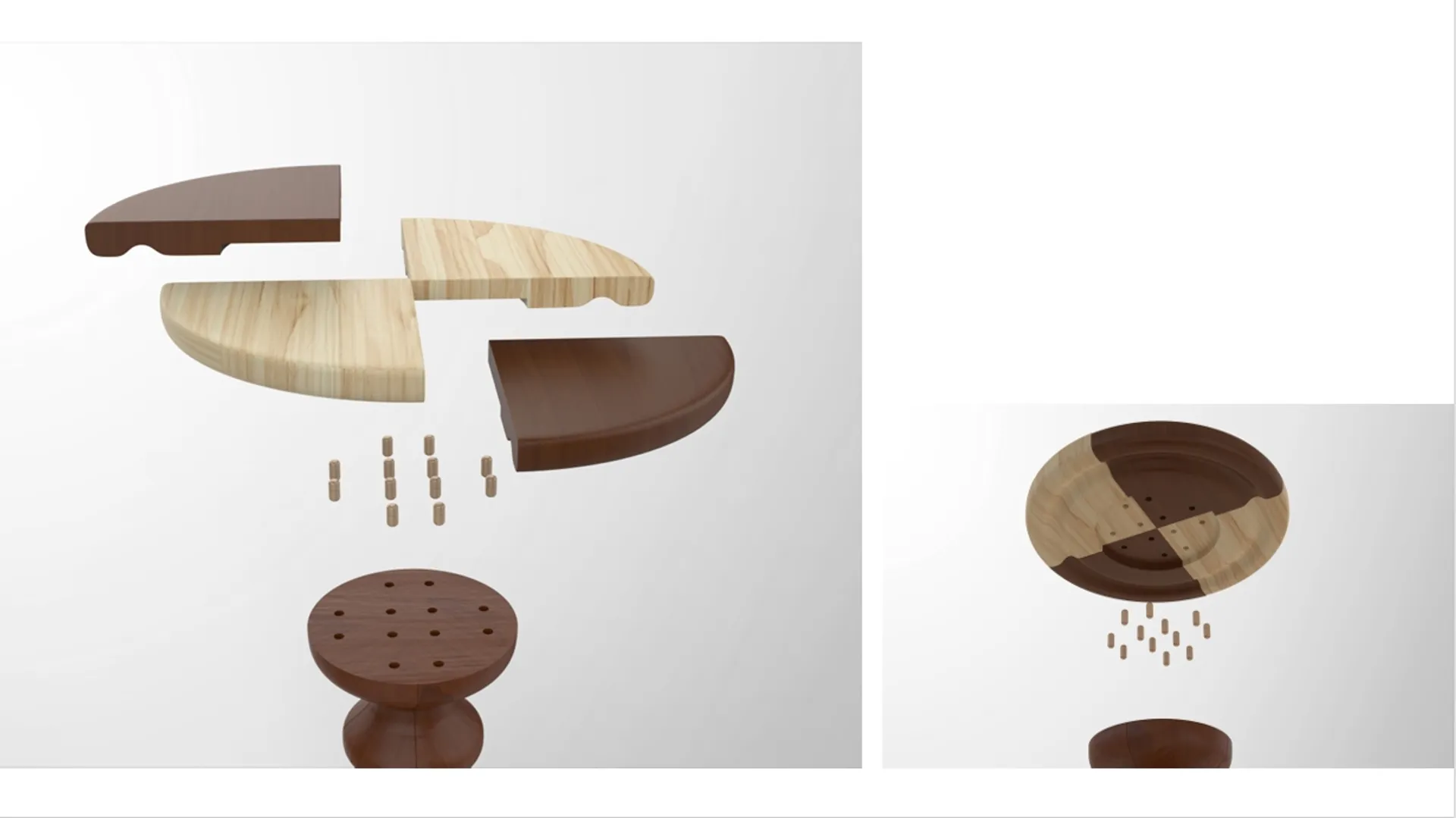 ‘N-Mixx’ is a side table designed for small space around your house, which include four parts. Each of its units is a perfect quarter circle, even the leg. Therefore, it could work as an individual one, or 2-in 1, 3-in-1 and 4-in-1. Each individual unit is easy to move, and the shape of the quarter circle can also fit well on walls or furnitures such as sofa. When the user needs to use a larger side table, just combine four units together to form a complete side table. In the process of gradually piecing together the table, the legs also gradually formed a perfectly curved leg.