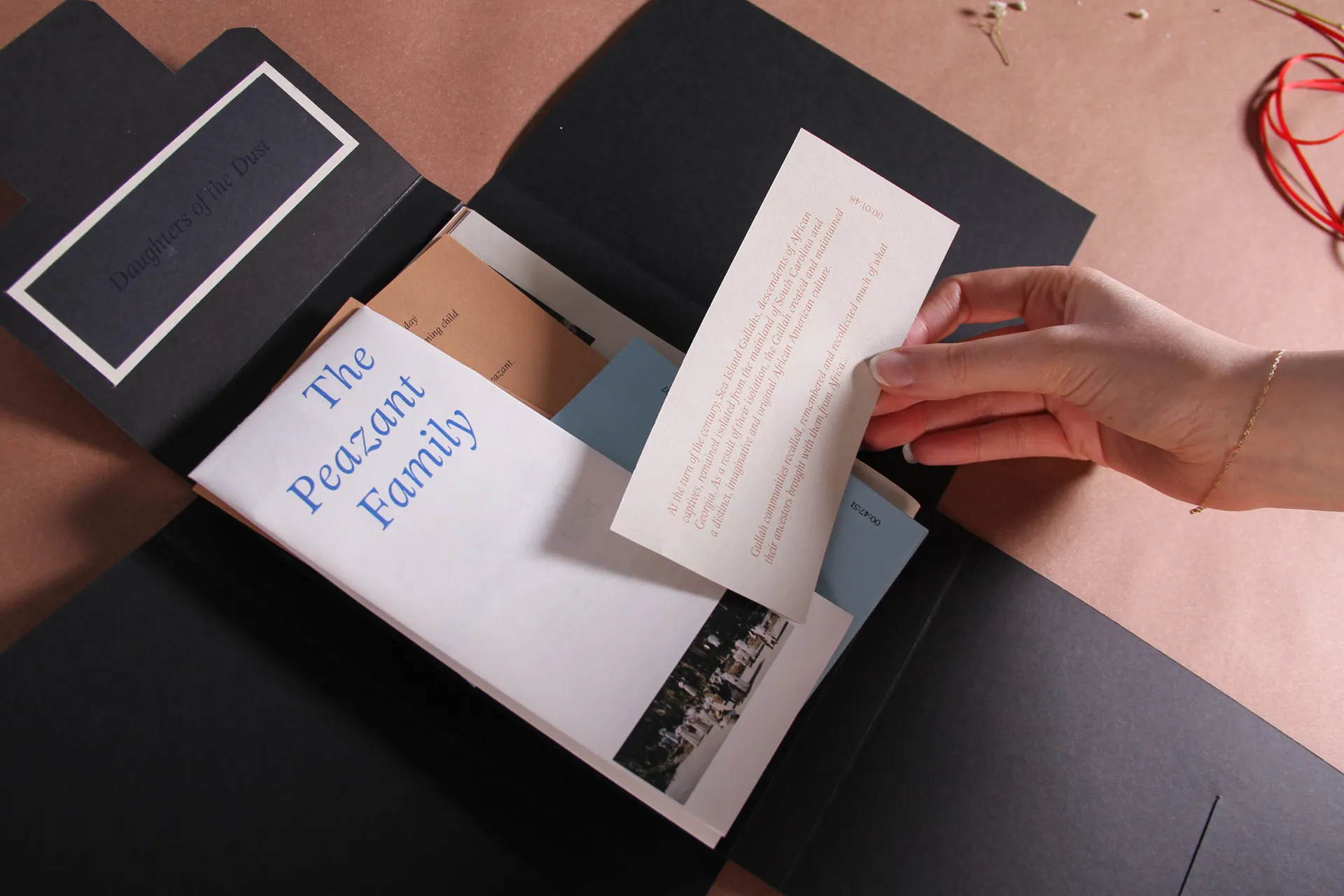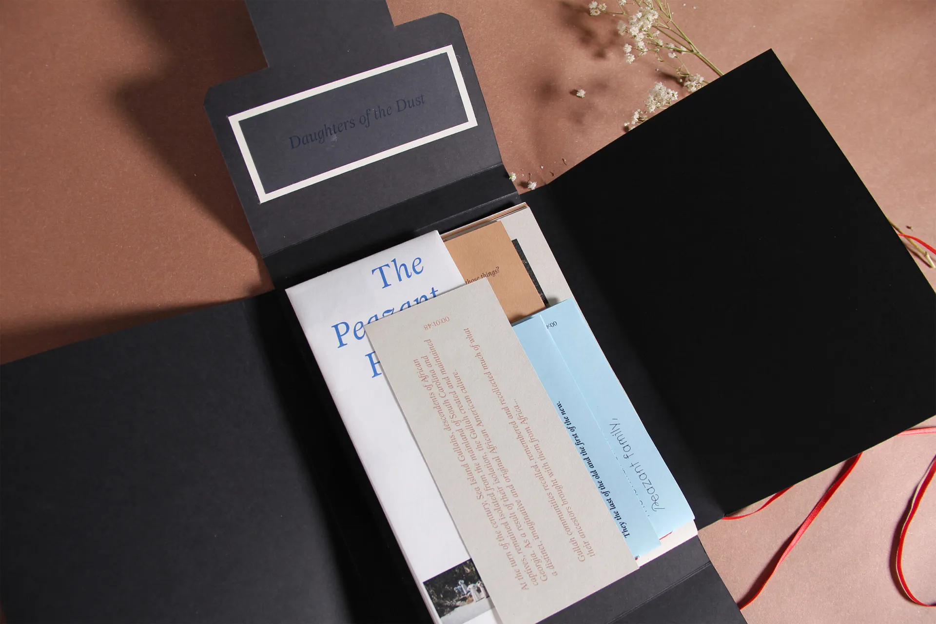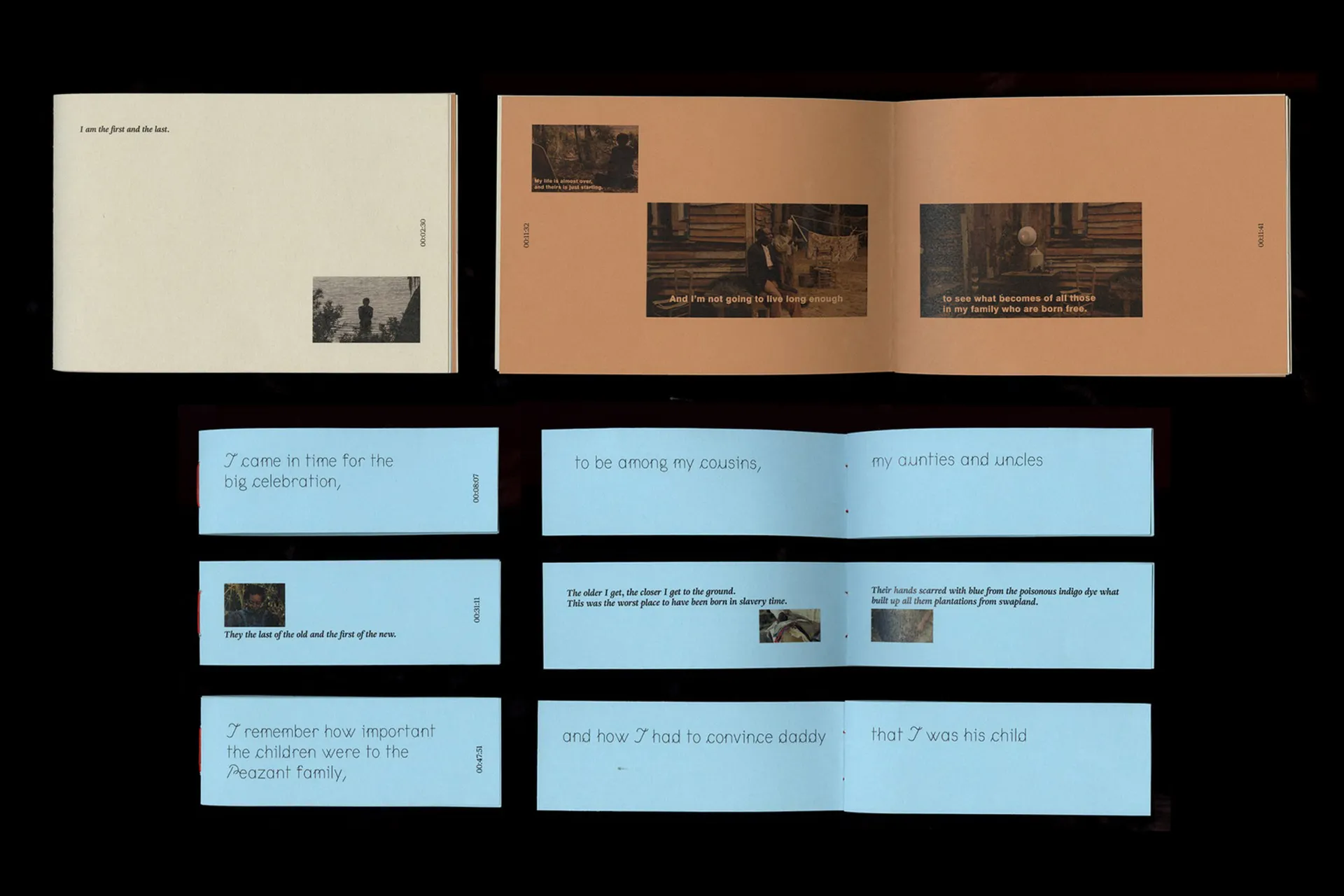 Daughters of the Dust is an unbound publication contained within a box that explores a selection of moments from the film (Daughters of the Dust, 1991) by Julie Dash, highlighting the themes of migration, memory and community. This project provided the opportunity to decode and republish moments from this film within the publication format, celebrating Dash’s reimagined, lyrical portrayal of African Americans on screen.