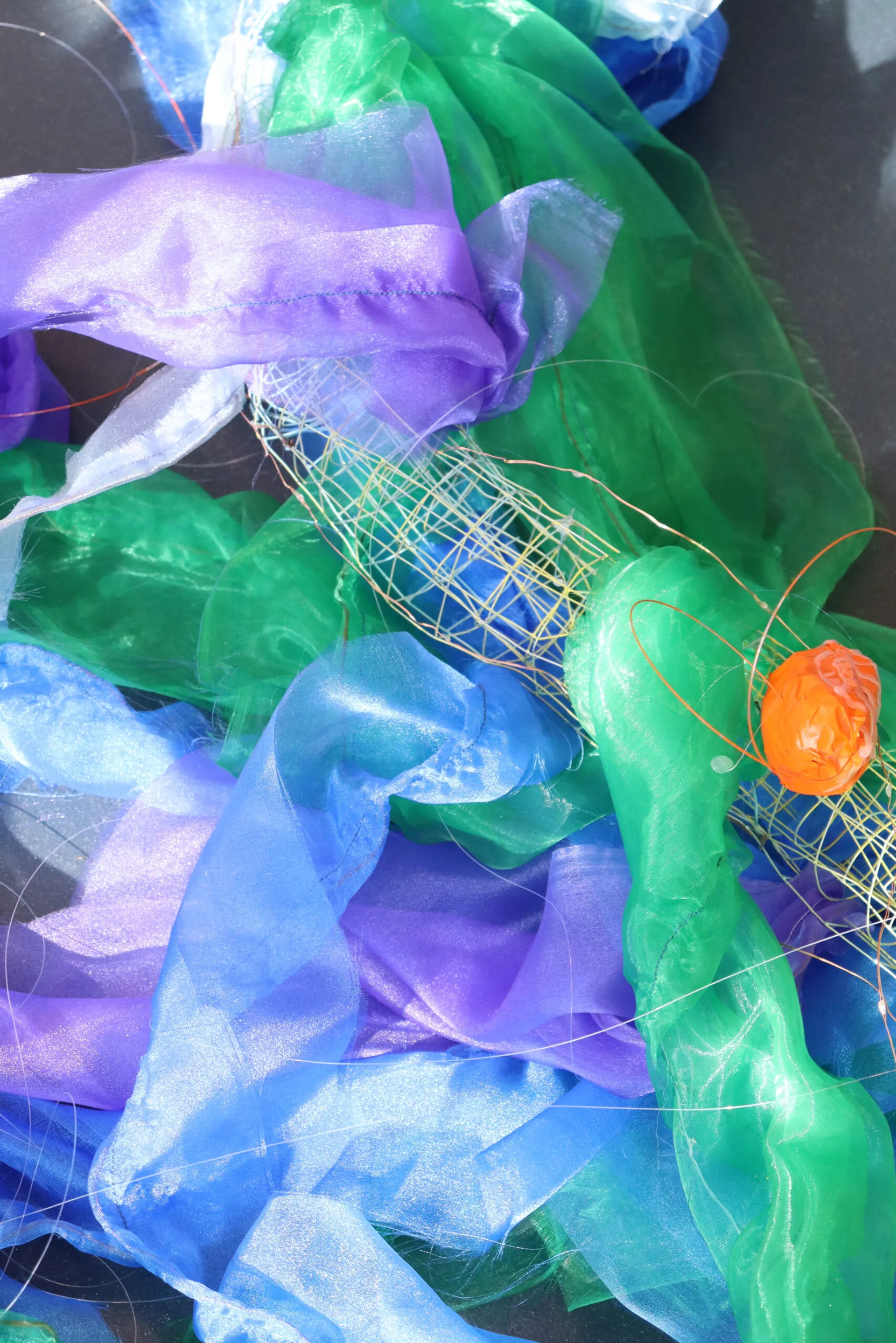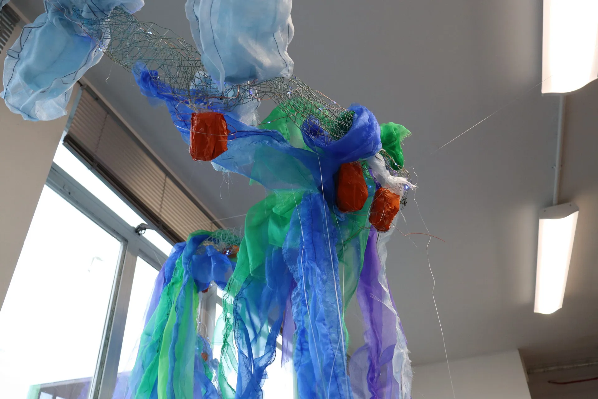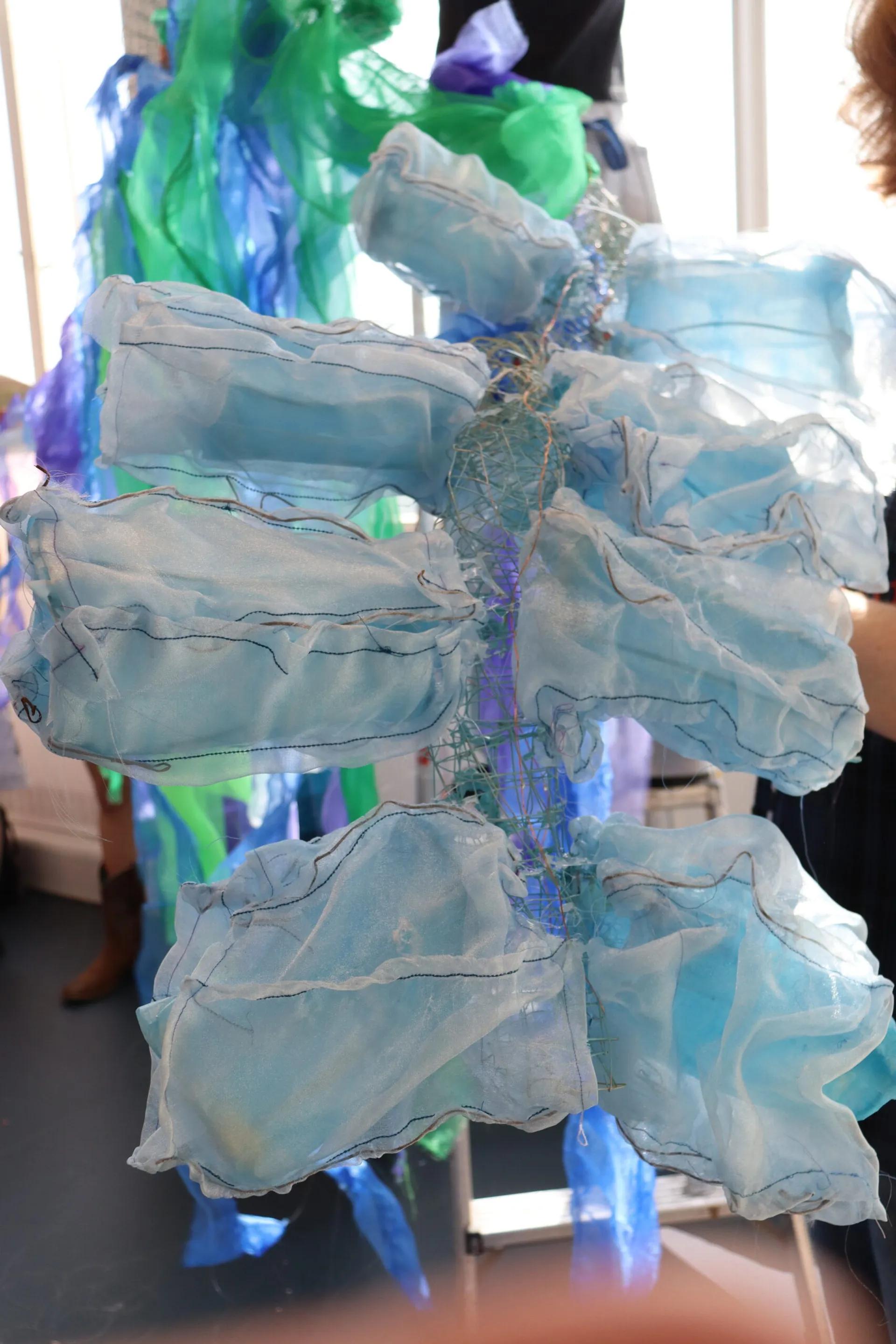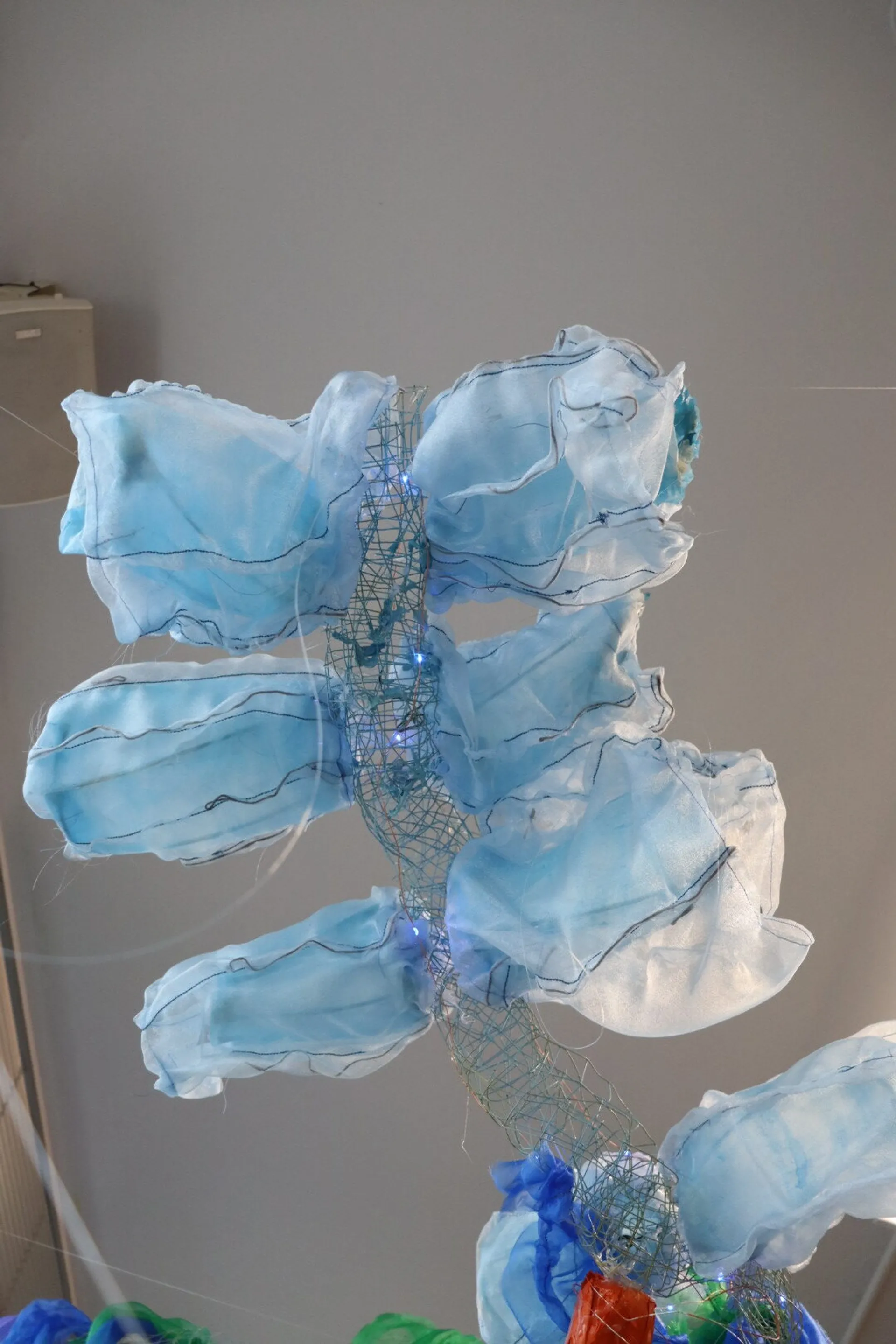 A “Giant Siphonophore”, is a colony of unusual organisms sticking onto its long and liberating stems swimming through the ocean’s depths like a gorgeous and living-like lantern. This is the quirkiest, most exotic, rare, and beautiful underwater species around the globe. This magnificent installation was used with a long rolled-up wire mesh resembling the siphonophore’s long and frolic stem with structural organzas resembling the transparent and fleshy layers of the nectophores and tentacles curved around. Looking closely, you can see this fascinating creature’s vibrant, colourful, and nostalgic textures heighten its energy and movement swimming freely. Furthermore, the colourful and transparent tentacles and organisms captivate an exotic and extraordinary environment with dangling strings of lights luminescent around the frolic structure that builds up to a different level.