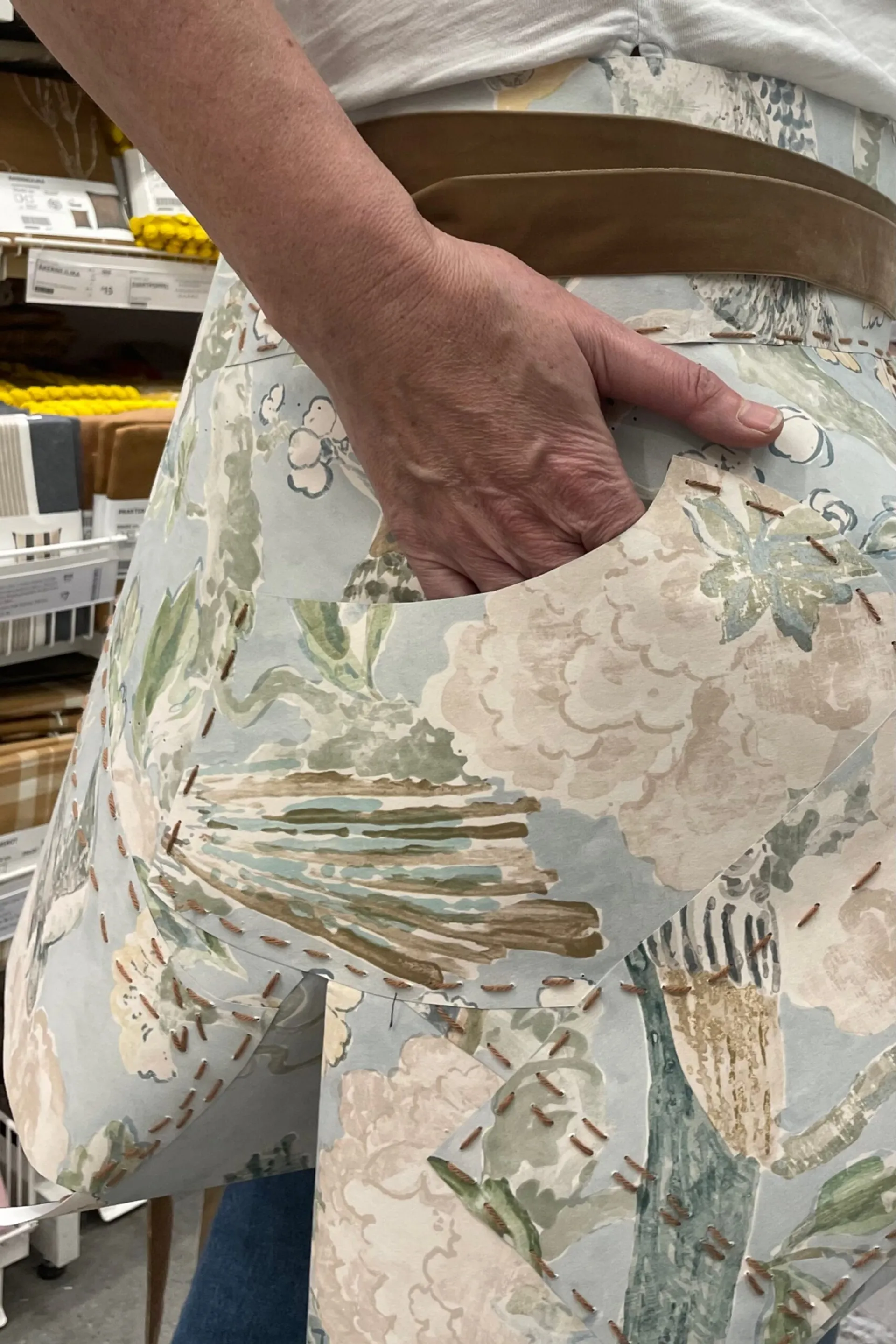 In terms of my final garments, I decided to make them out of domestic textiles, to show that a person would need no specialist fabric to make something with the pattern kit. This required some testing and experimentation due to the different properties of the textiles, especially with the use of wallpaper in the skirt. I tested many processes of construction, eventually deciding to fully hand sew all my garments, both as a celebration of the craft and to make the processes more accessible to those without a sewing machine.