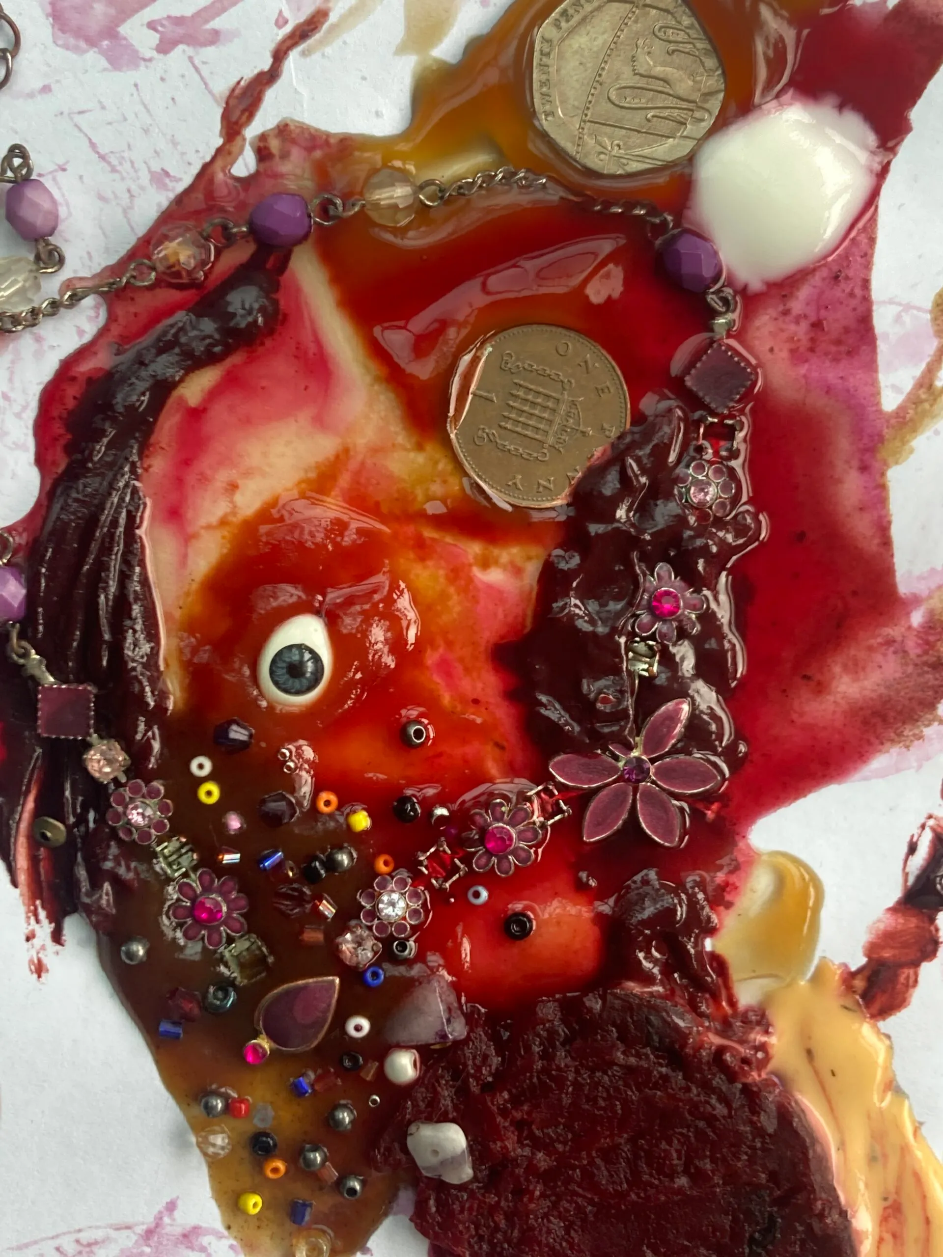 My project explores the complex beauty of the period and period body. Essentially, taking power back: the elemental power of the body and its cycles. I wanted my FMP to brandish this power of the “feminine”, in whatever form this takes. I explored the hidden treasure that is period blood, and its value as a life giving substance. This priceless liquid gold my body can provide. So, I worked on aestheticizing this in a way that felt intrinsic to my experience and the experience I viewed on feminine echo-chambers online. This interception of parody, humour and sincerity. However, I began to see this behaviour of parody in women artists, through their use of the “grotesque”. This is the direction my project took, looking at the power of using the ugly, distorted, and foul, to confront the viewer with their own conventions. I created a “feminine” dystopia, brandishing blood and gore and beauty, fusing these sentiments to thrill, agitate or satisfy.