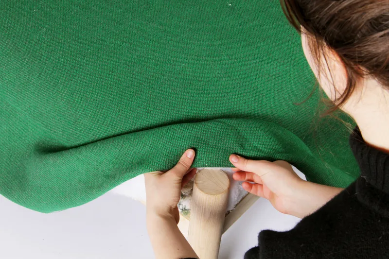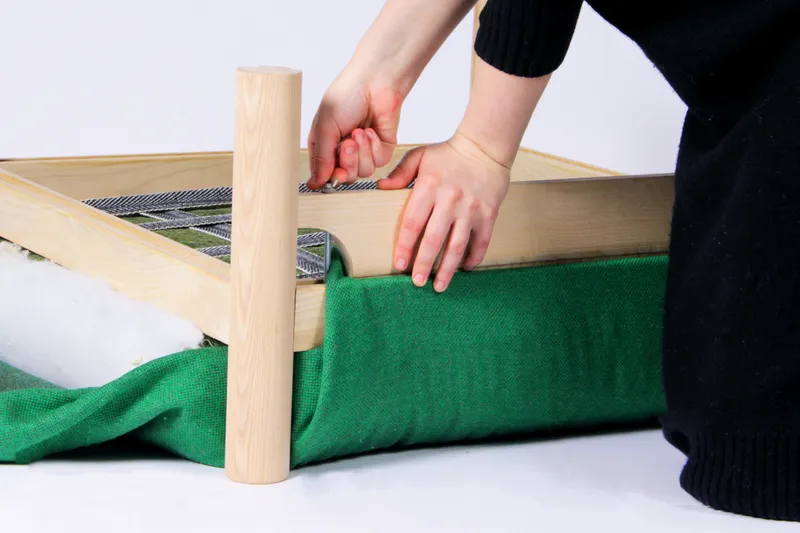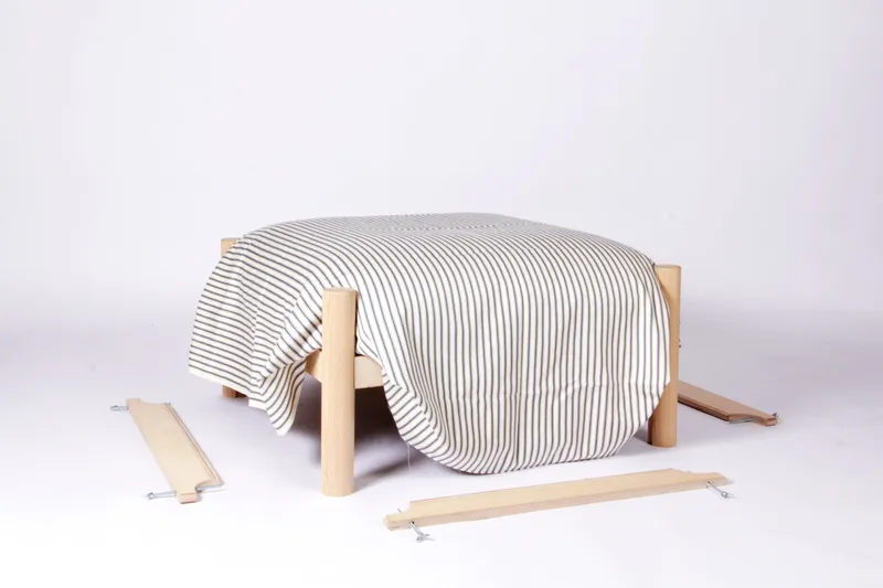 Tuck is a new type of upholstery system using a plywood wedge clamping mechanism, rather than traditional upholstery techniques, to hold the fabric in place. Once the fabric is clamped, any excess material is folded and tucked behind the legs and underneath the webbed frame. This means the fabric is easily removable to be washed, repaired, recycled or replaced. The system also requires no pattern cutting but instead utilises the standard widths of fabric off the roll, only the length needing to be cut, meaning fabric waste is kept to a minimum.