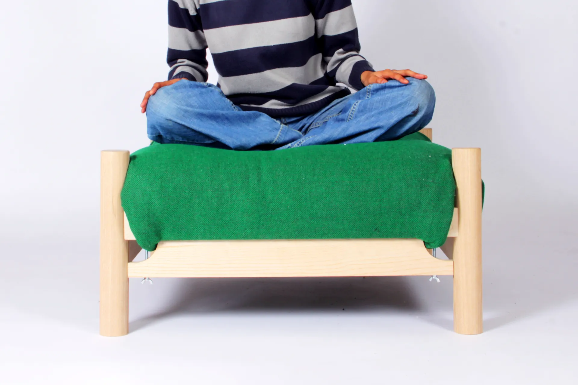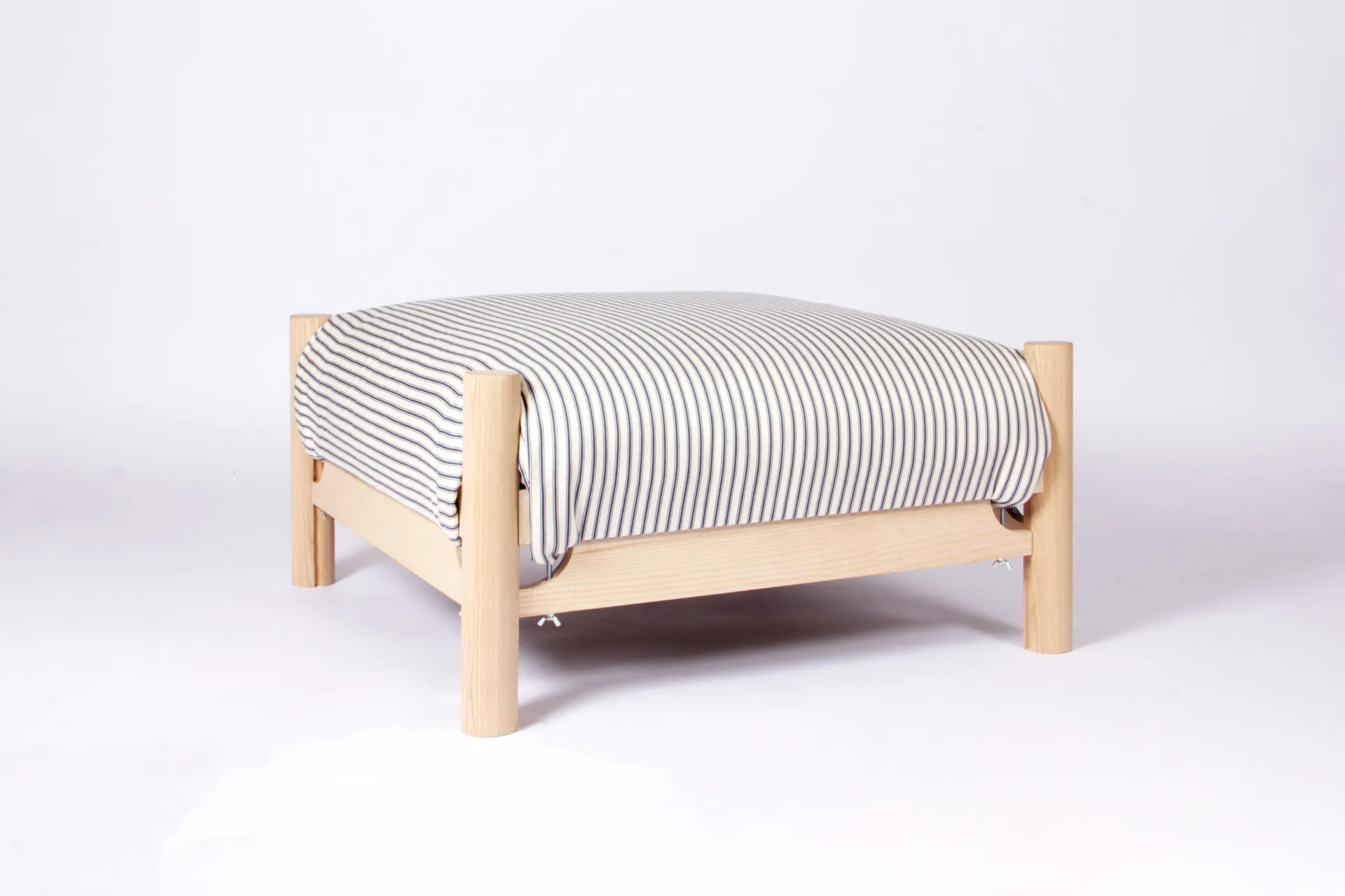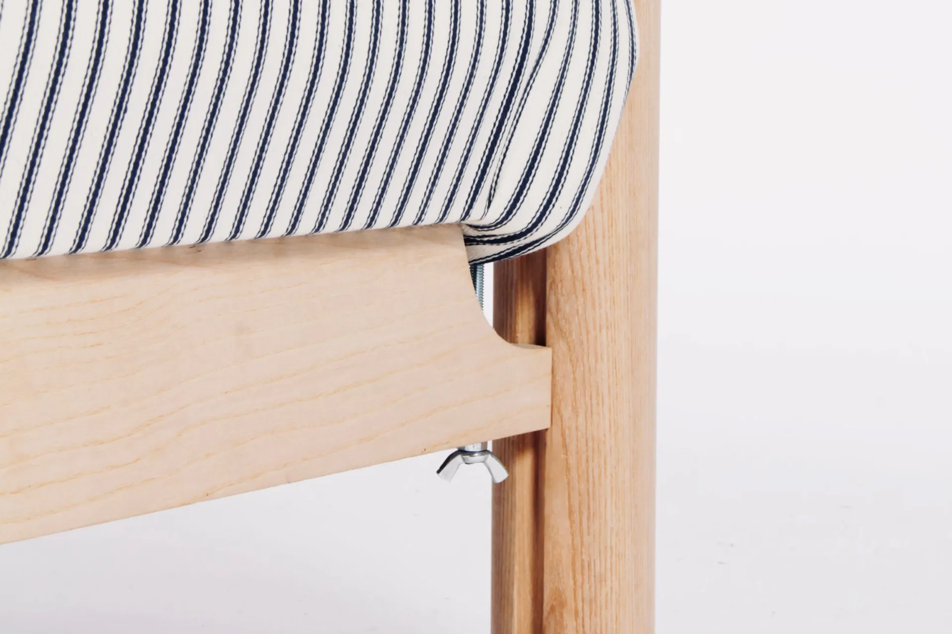 Tuck is a new type of upholstery system using a plywood wedge clamping mechanism, rather than traditional upholstery techniques, to hold the fabric in place. Once the fabric is clamped, any excess material is folded and tucked behind the legs and underneath the webbed frame. This means the fabric is easily removable to be washed, repaired, recycled or replaced. The system also requires no pattern cutting but instead utilises the standard widths of fabric off the roll, only the length needing to be cut, meaning fabric waste is kept to a minimum.