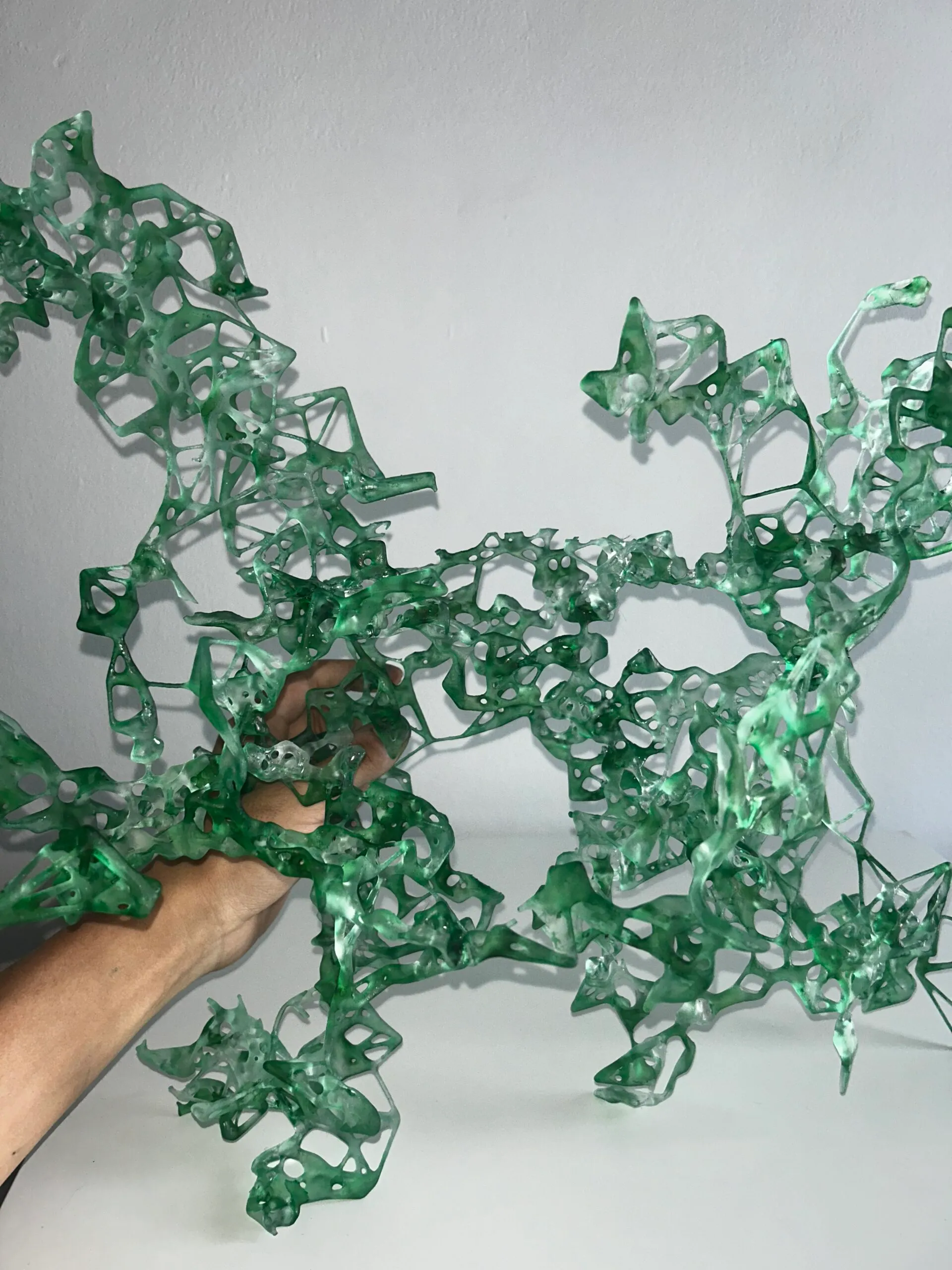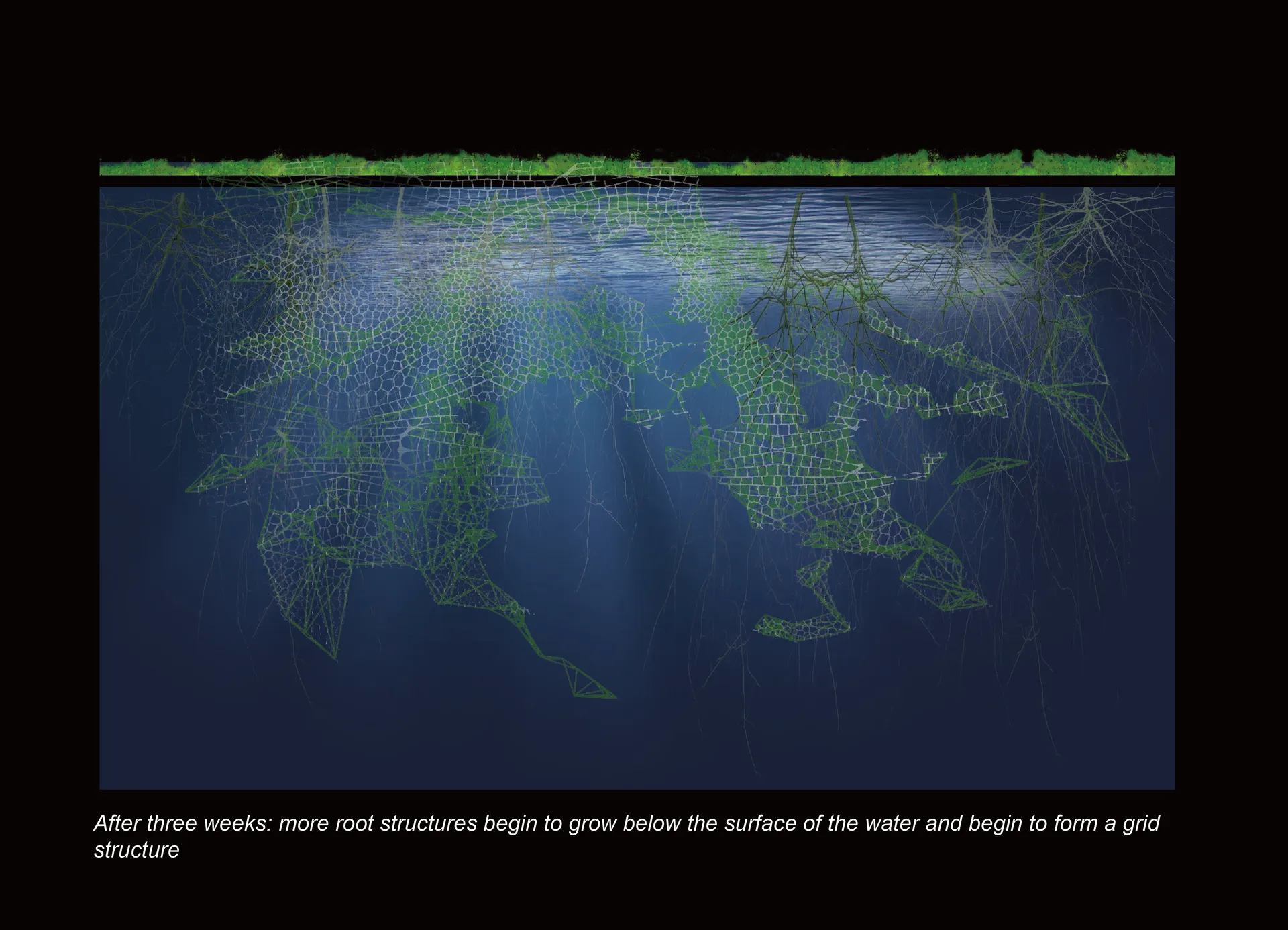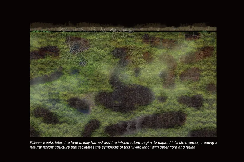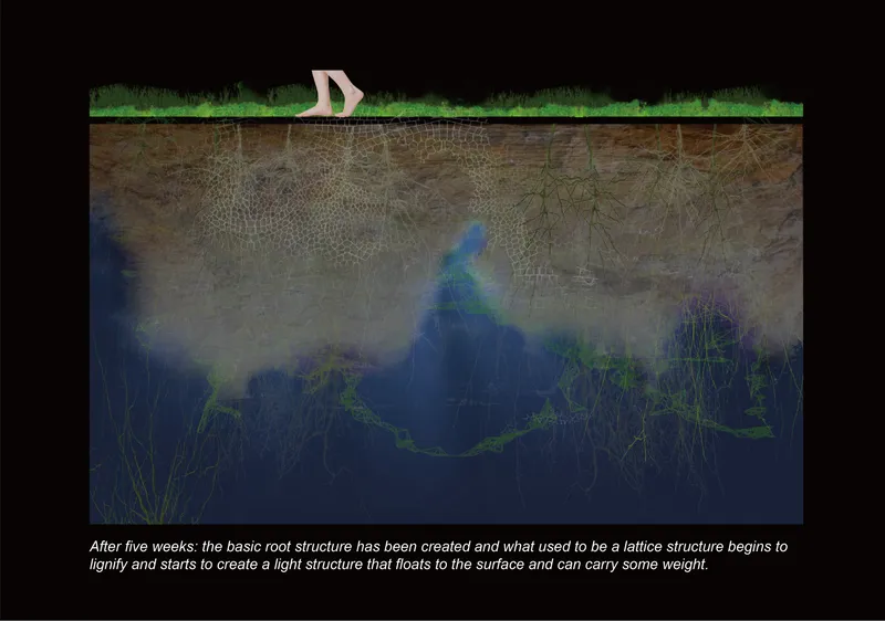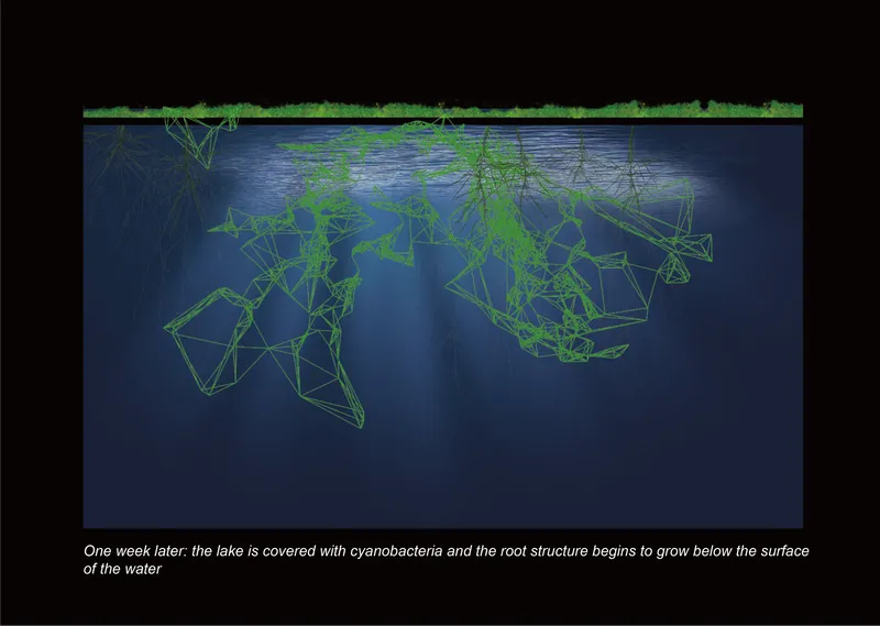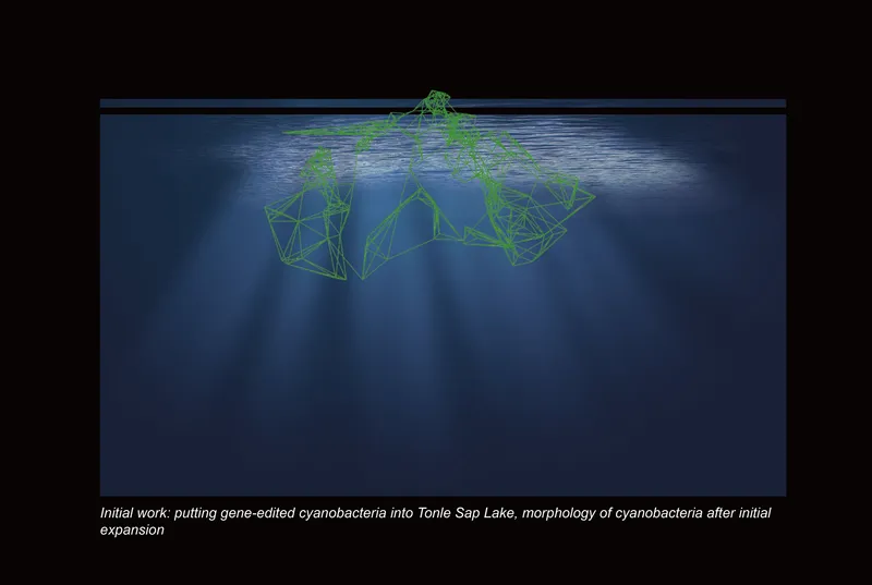 The core structure of the model consists of genetically modified cyanobacteria that are integrated with plant growth patterns, which solidify to form a lightweight, woody land mass. The coral-like structures below the water’s surface contribute to ecological restoration, providing nutrients and shelter for native aquatic species in Cambodia’s Tonle Sap Lake. This design not only supports local biodiversity, but also mitigates over-hunting and unscientific fishing practices.