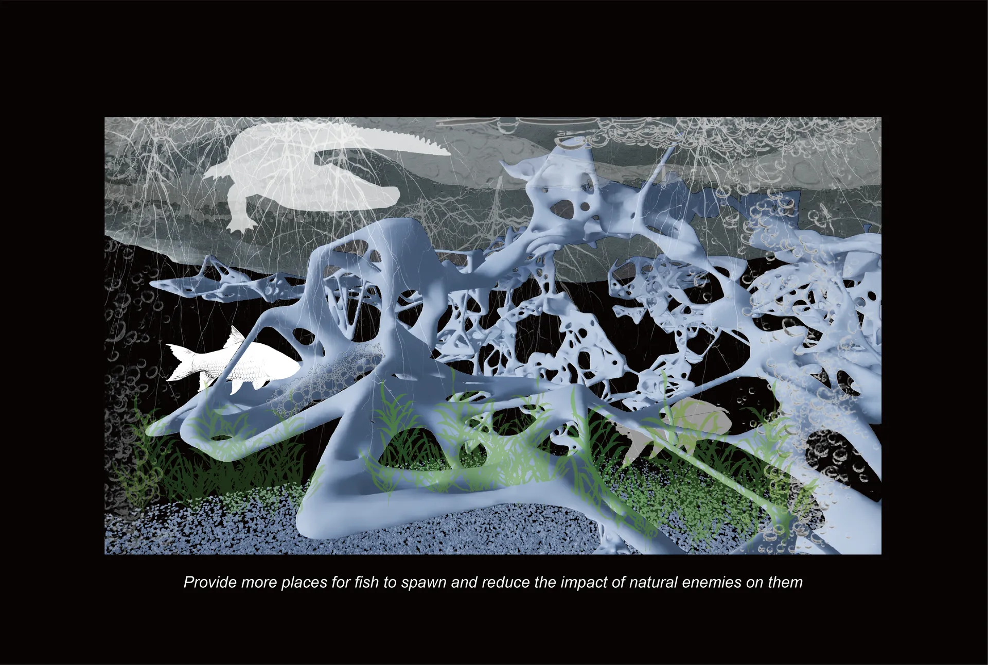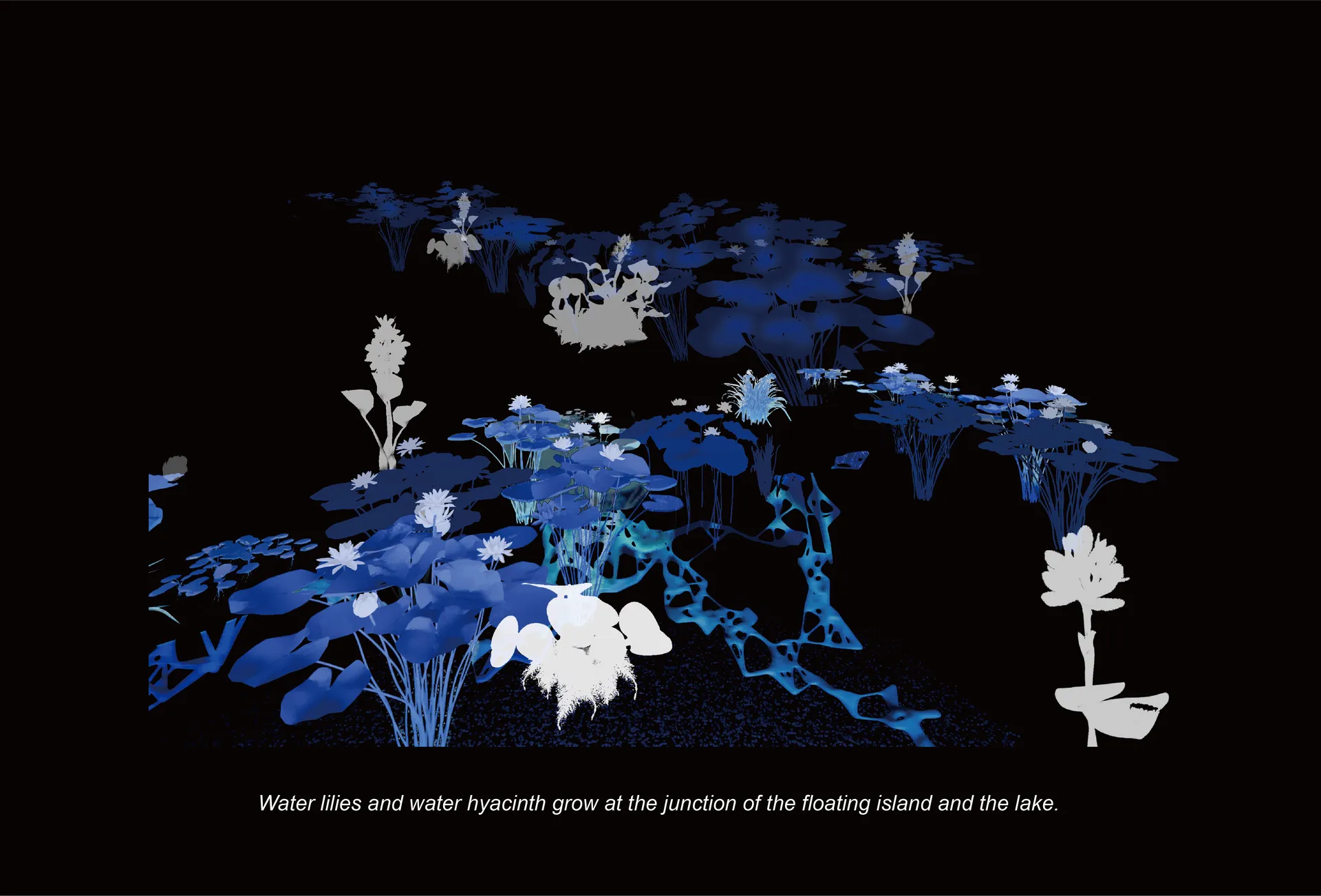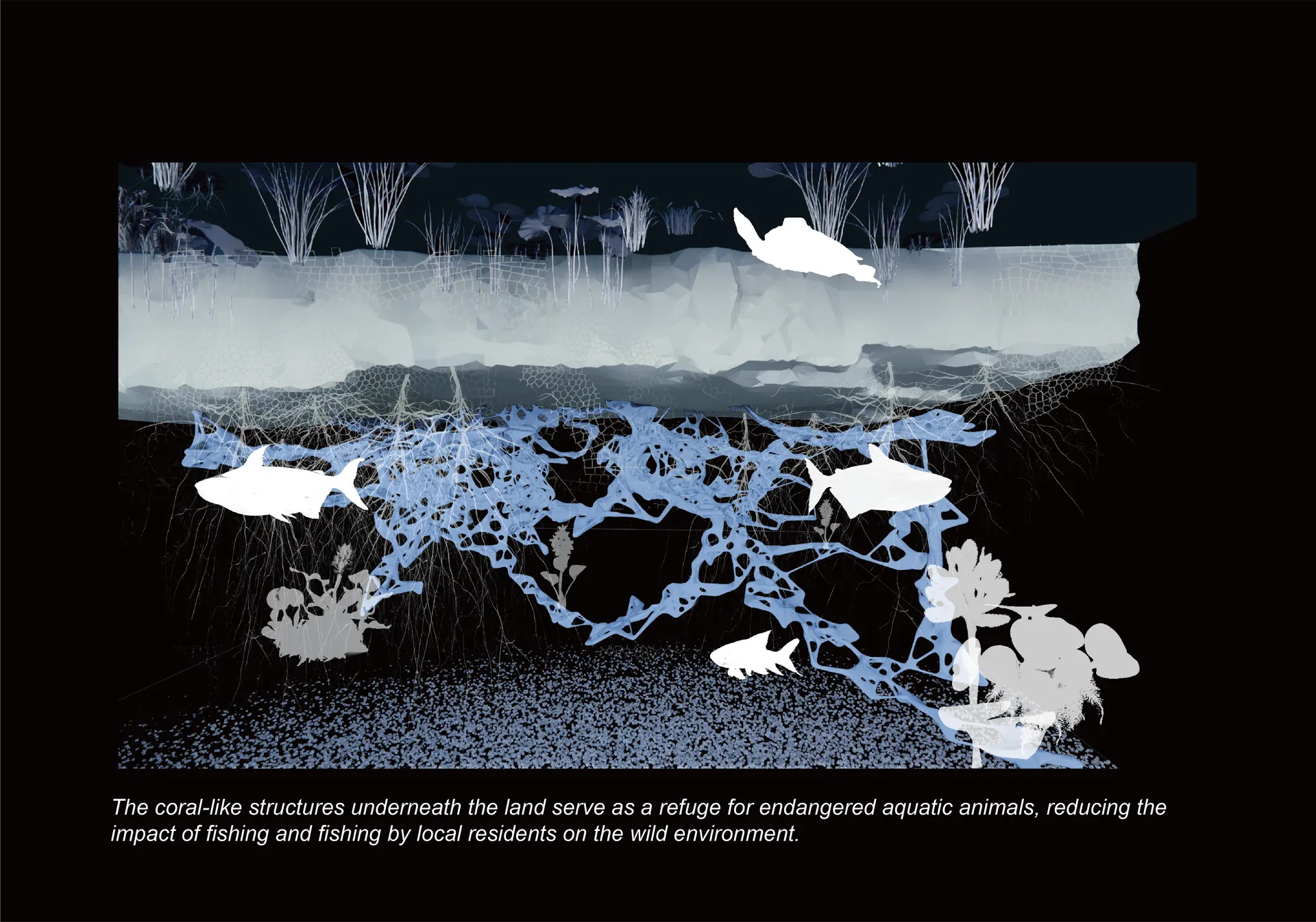 The core structure of the model consists of genetically modified cyanobacteria that are integrated with plant growth patterns, which solidify to form a lightweight, woody land mass. The coral-like structures below the water’s surface contribute to ecological restoration, providing nutrients and shelter for native aquatic species in Cambodia’s Tonle Sap Lake. This design not only supports local biodiversity, but also mitigates over-hunting and unscientific fishing practices.