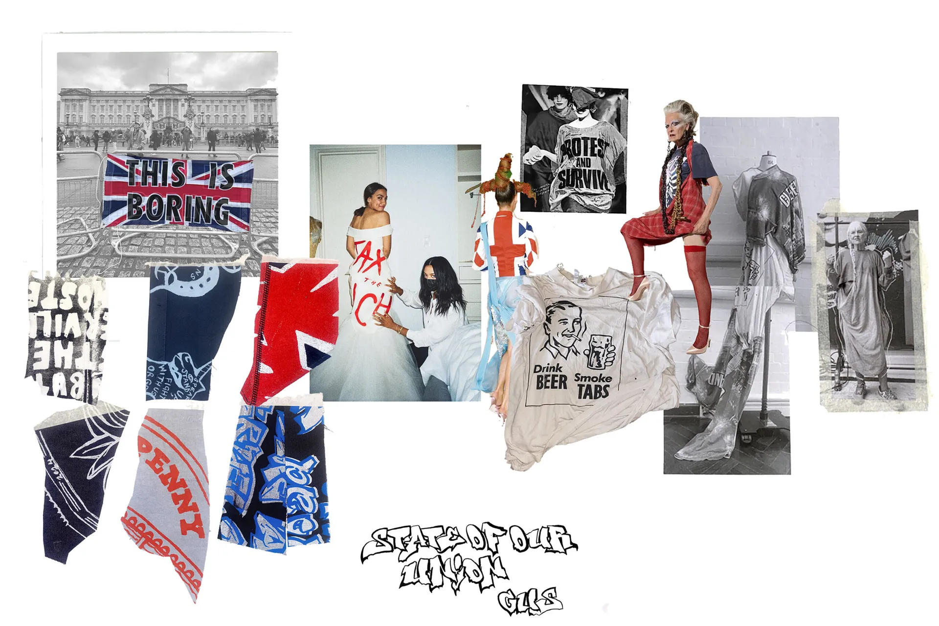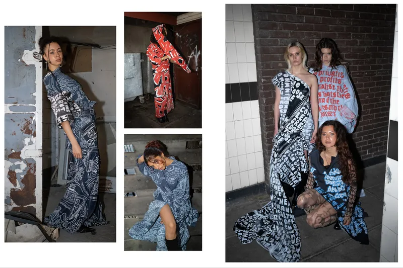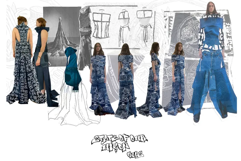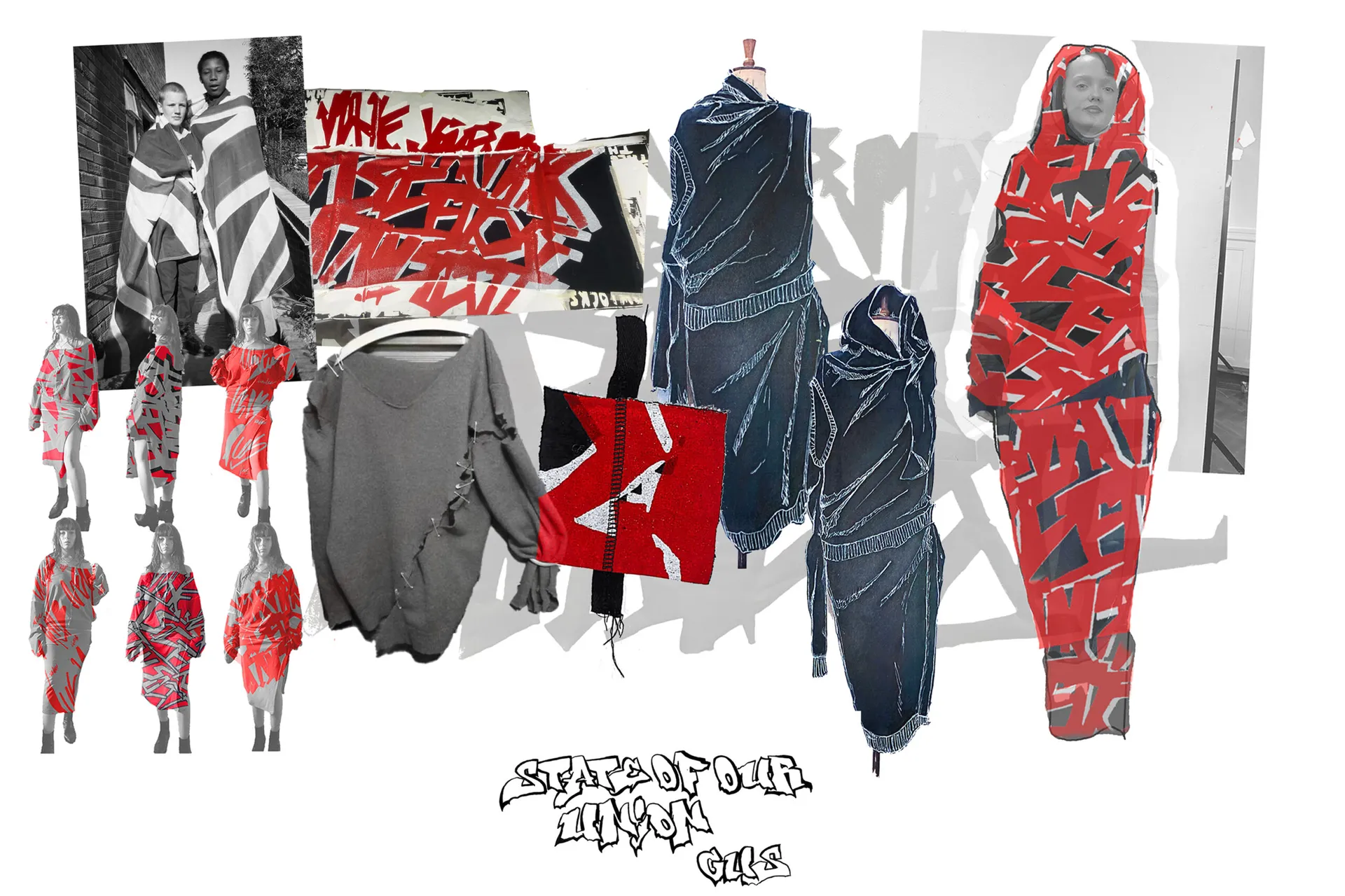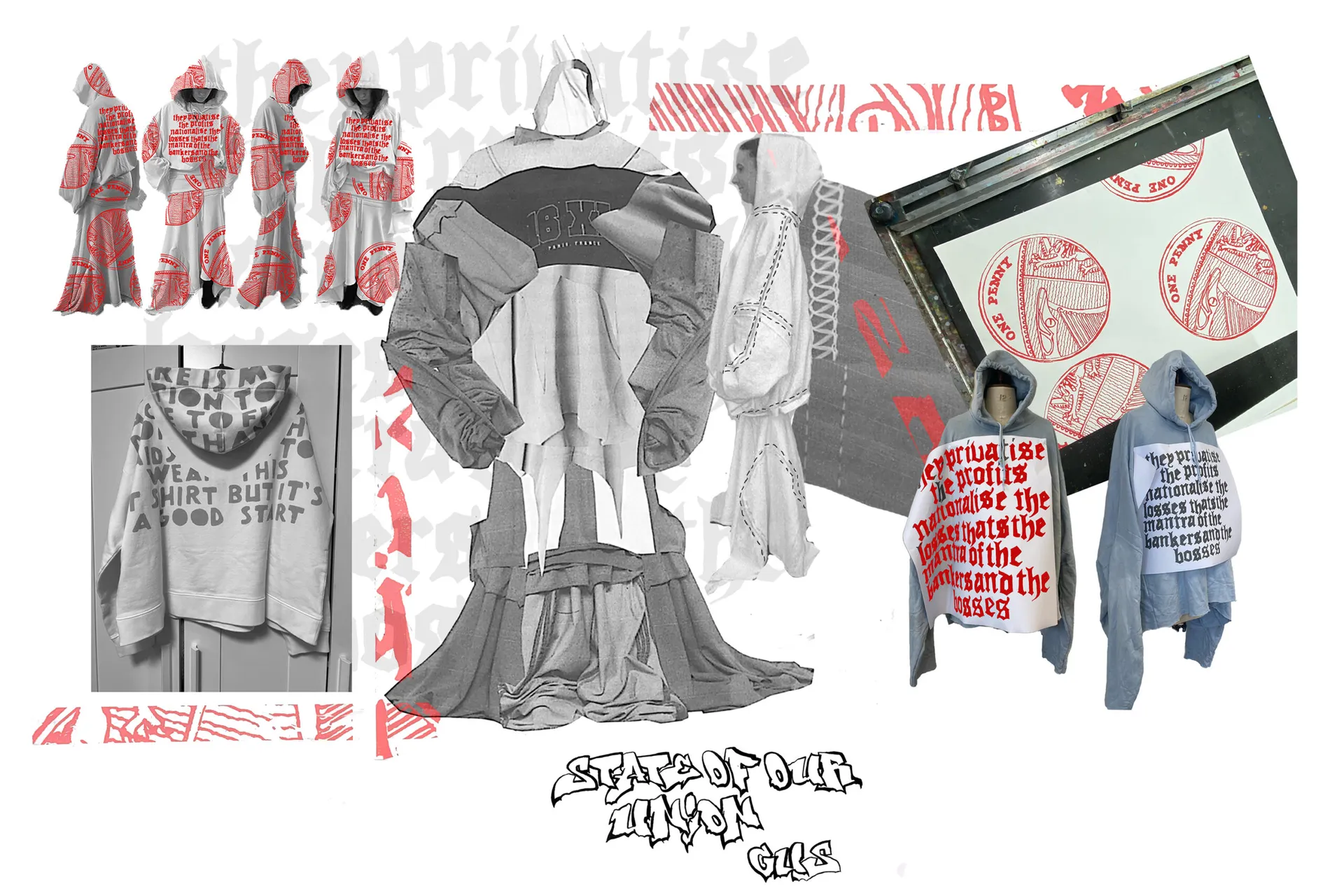 Using historical archives, current news and media influences, I have designed and applied prints that represent every nation within the British Isles. A Scottish landing poem, “The Goose and the Common”, featured in look one, a reworded government crest, protests the status-quo in look 2. Look 3 represents my love of graffiti, using a slogan promoted in British media in the 70s to try and hinder graffer’s influence in society. The British pound features in look 4, displaying not the crown as the unifying factor of our nation but the workers within it. Look 5, represents the bankers and bosses as the real enemy, not whoever the right wing are framing to scapegoat their own failures. Finally, quotes from writer, Thomas Paine encompasses my own moral code and beliefs in look 6.