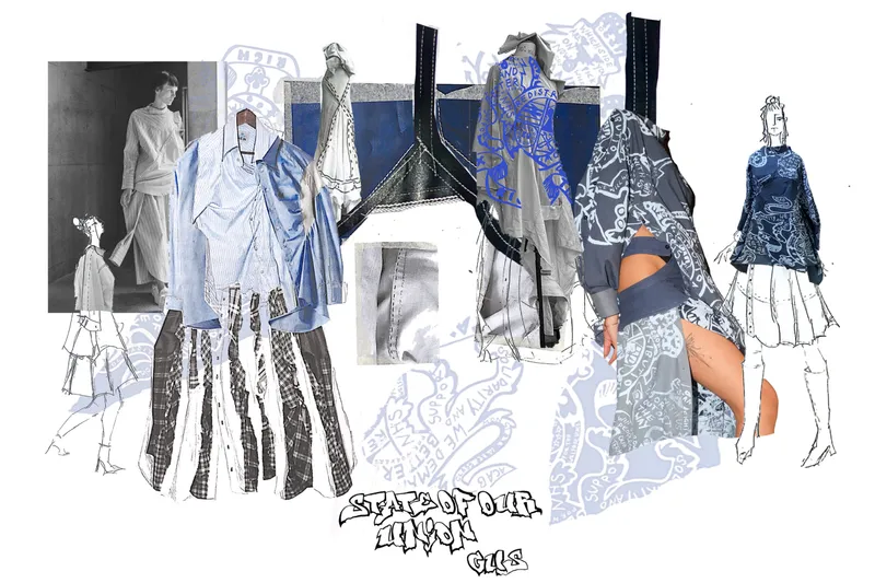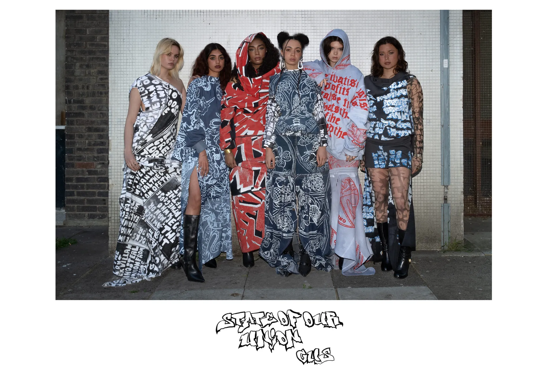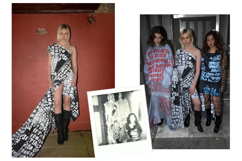 This final graduate collection references past, present and future struggles of the Union of Great Britain: Wales, Scotland Ireland and England. Traditional slogans, emblems, crests and phrases have been reworded and screen printed to question the integrity of our current government, the monarchy as a symbol of “Britishness” and holds a 14-year-old Tory tenure to account. As citizens, we navigate a tumultuous time in British politics and this collection represents a feeling of distinct and profound change in young people’s political and ideological beliefs. Print is imperative to “political optics” and message sending therefore it has been deployed in this collection liberally in meaning and in fabrication. Using only second-hand garments, I have placed a new meaning onto the traditional “Britishness” in order to reclaim patriotism from right-wing scare-mongers, giving our country a new meaning: of unprejudiced inclusivity and solidarity, curating a look of ‘diverse harmony’ that exists within our union today.