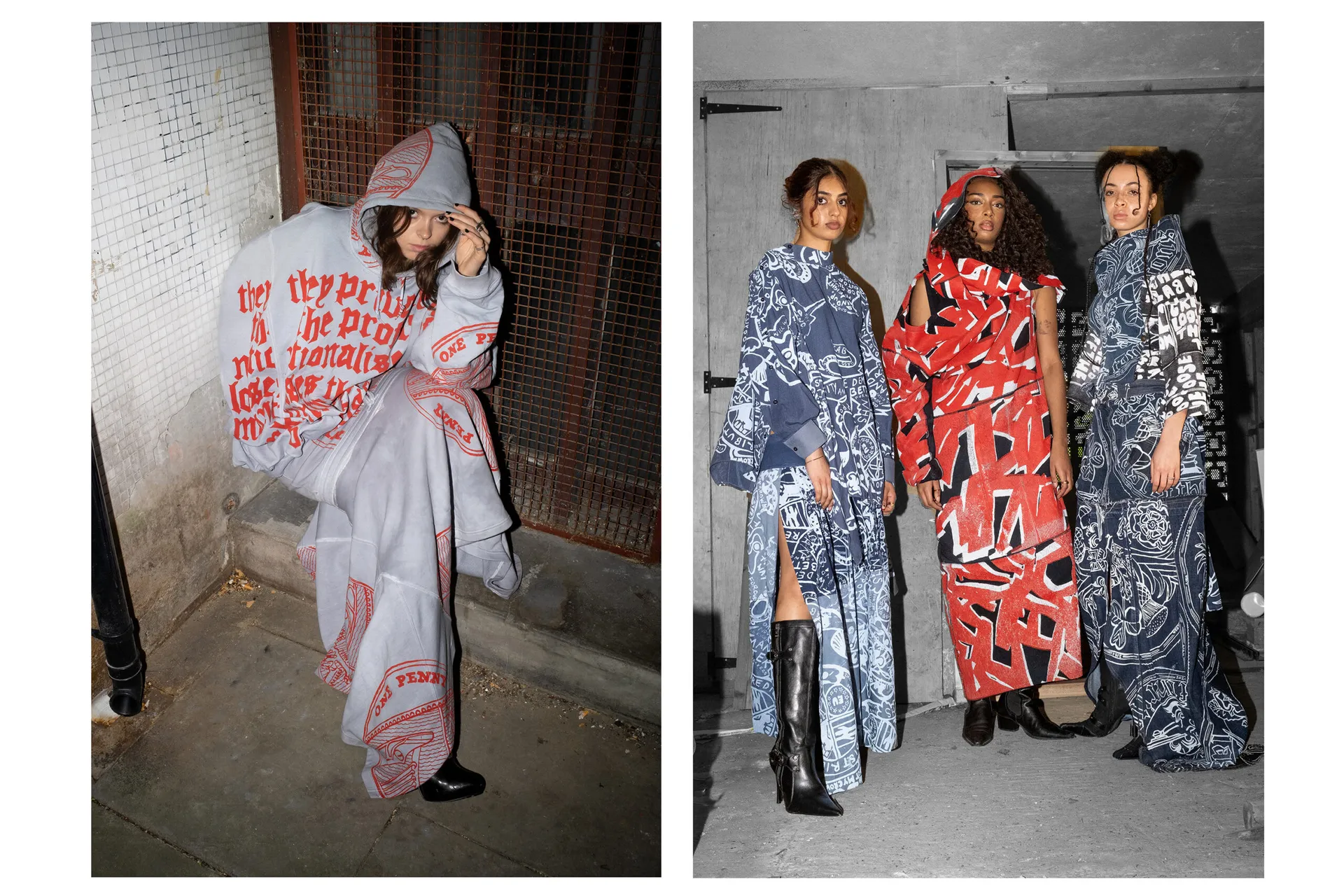 This final graduate collection references past, present and future struggles of the Union of Great Britain: Wales, Scotland Ireland and England. Traditional slogans, emblems, crests and phrases have been reworded and screen printed to question the integrity of our current government, the monarchy as a symbol of “Britishness” and holds a 14-year-old Tory tenure to account. As citizens, we navigate a tumultuous time in British politics and this collection represents a feeling of distinct and profound change in young people’s political and ideological beliefs. Print is imperative to “political optics” and message sending therefore it has been deployed in this collection liberally in meaning and in fabrication. Using only second-hand garments, I have placed a new meaning onto the traditional “Britishness” in order to reclaim patriotism from right-wing scare-mongers, giving our country a new meaning: of unprejudiced inclusivity and solidarity, curating a look of ‘diverse harmony’ that exists within our union today.