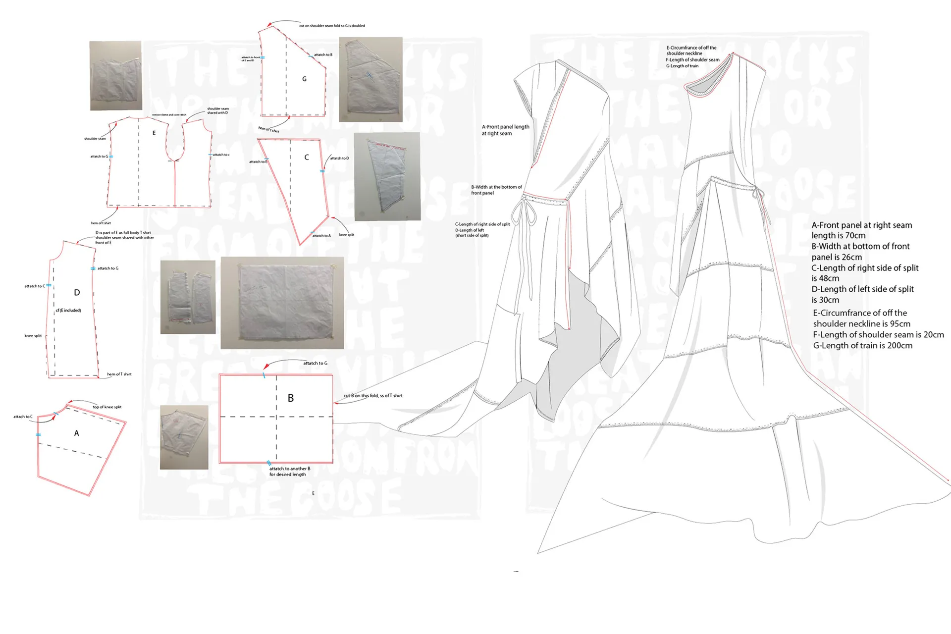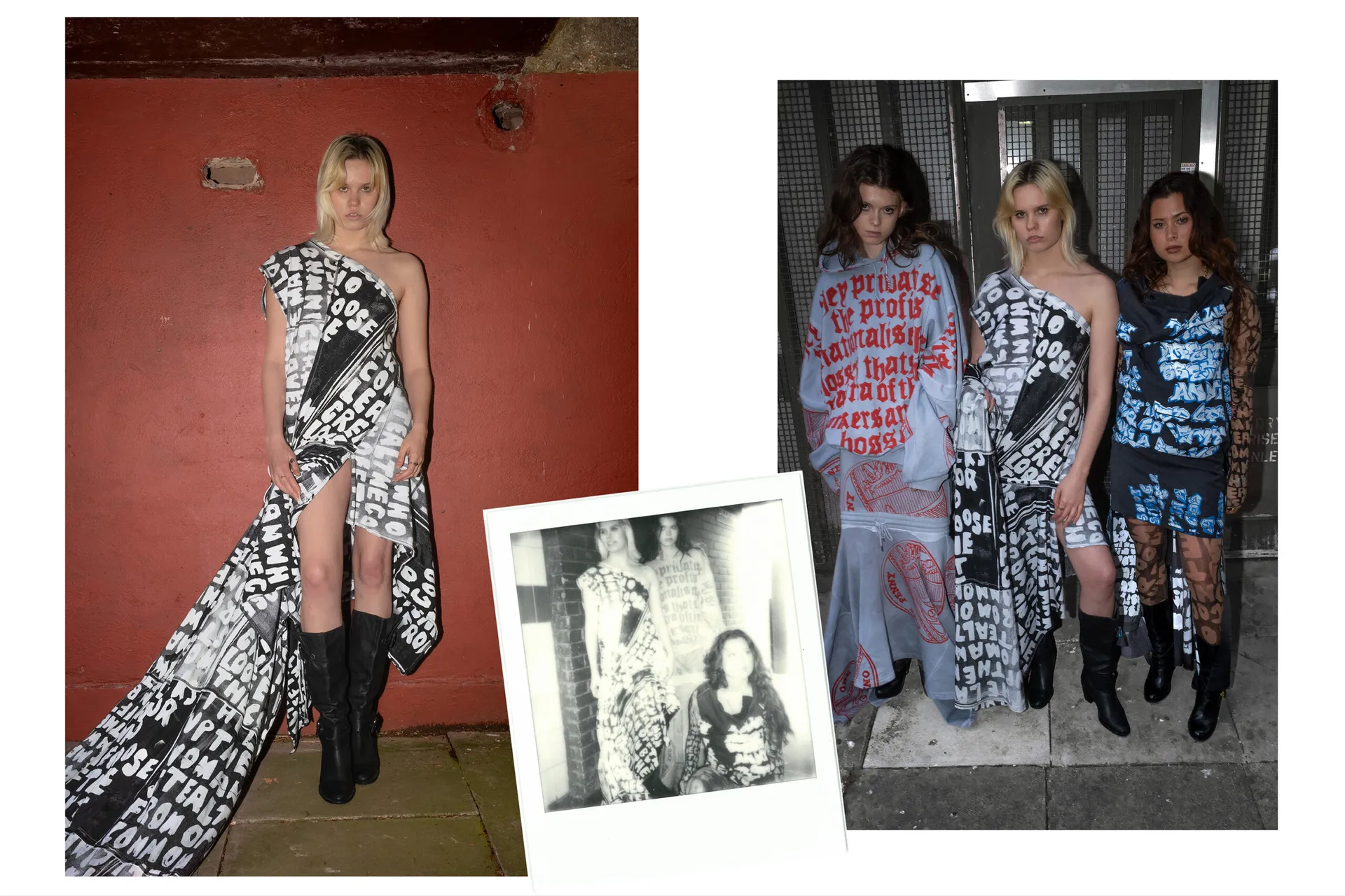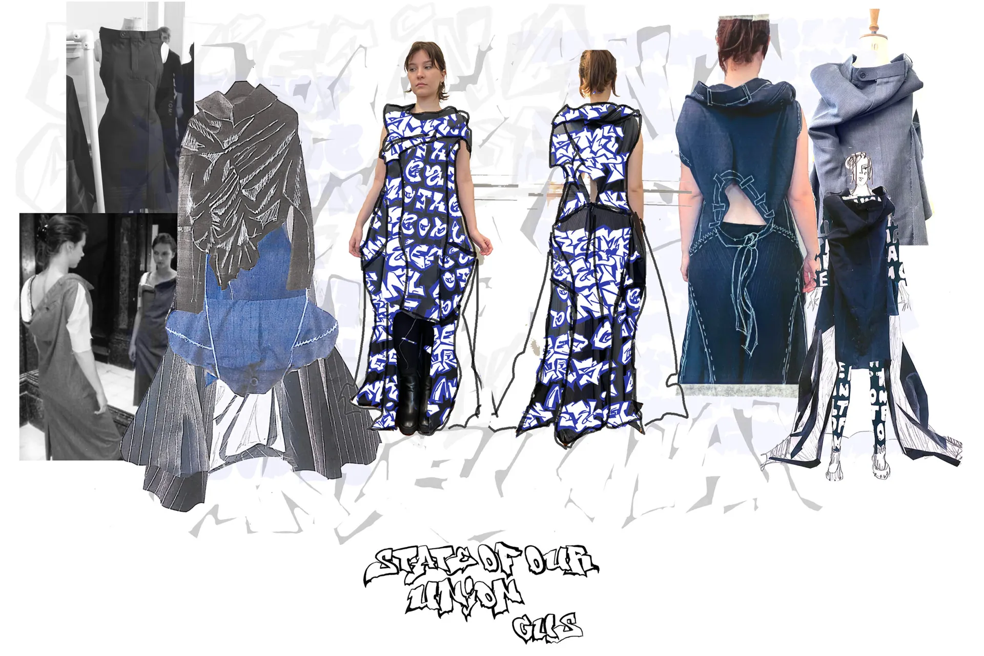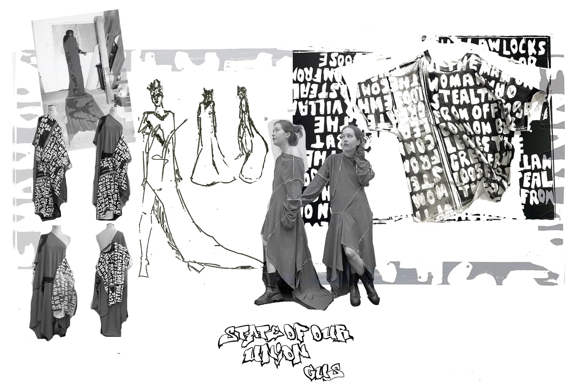 Using historical archives, current news and media influences, I have designed and applied prints that represent every nation within the British Isles. A Scottish landing poem, “The Goose and the Common”, featured in look one, a reworded government crest, protests the status-quo in look 2. Look 3 represents my love of graffiti, using a slogan promoted in British media in the 70s to try and hinder graffer’s influence in society. The British pound features in look 4, displaying not the crown as the unifying factor of our nation but the workers within it. Look 5, represents the bankers and bosses as the real enemy, not whoever the right wing are framing to scapegoat their own failures. Finally, quotes from writer, Thomas Paine encompasses my own moral code and beliefs in look 6.