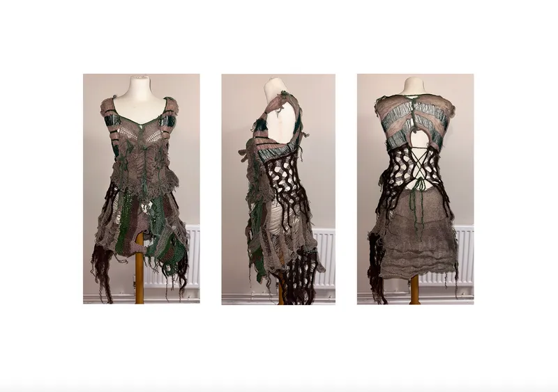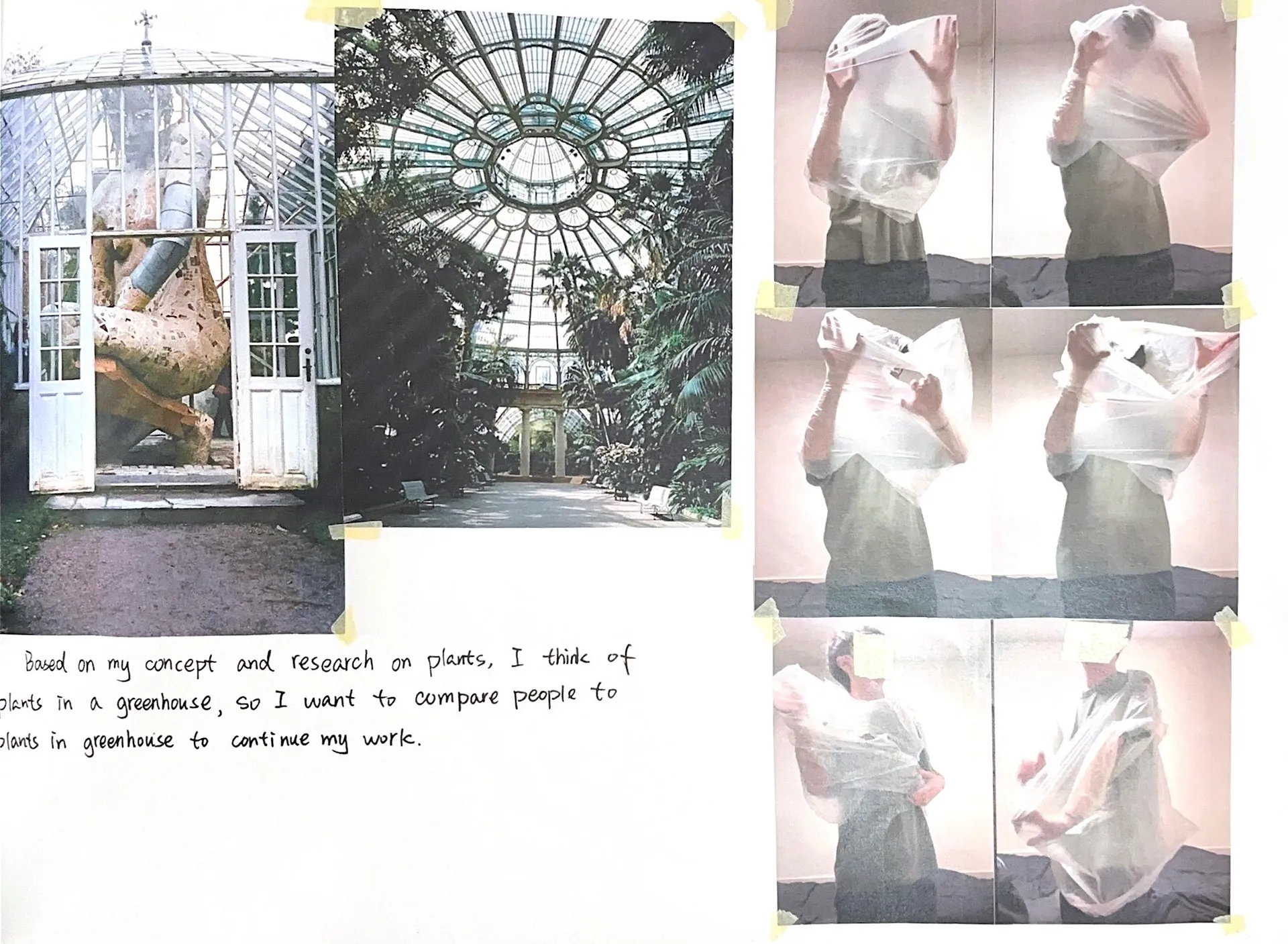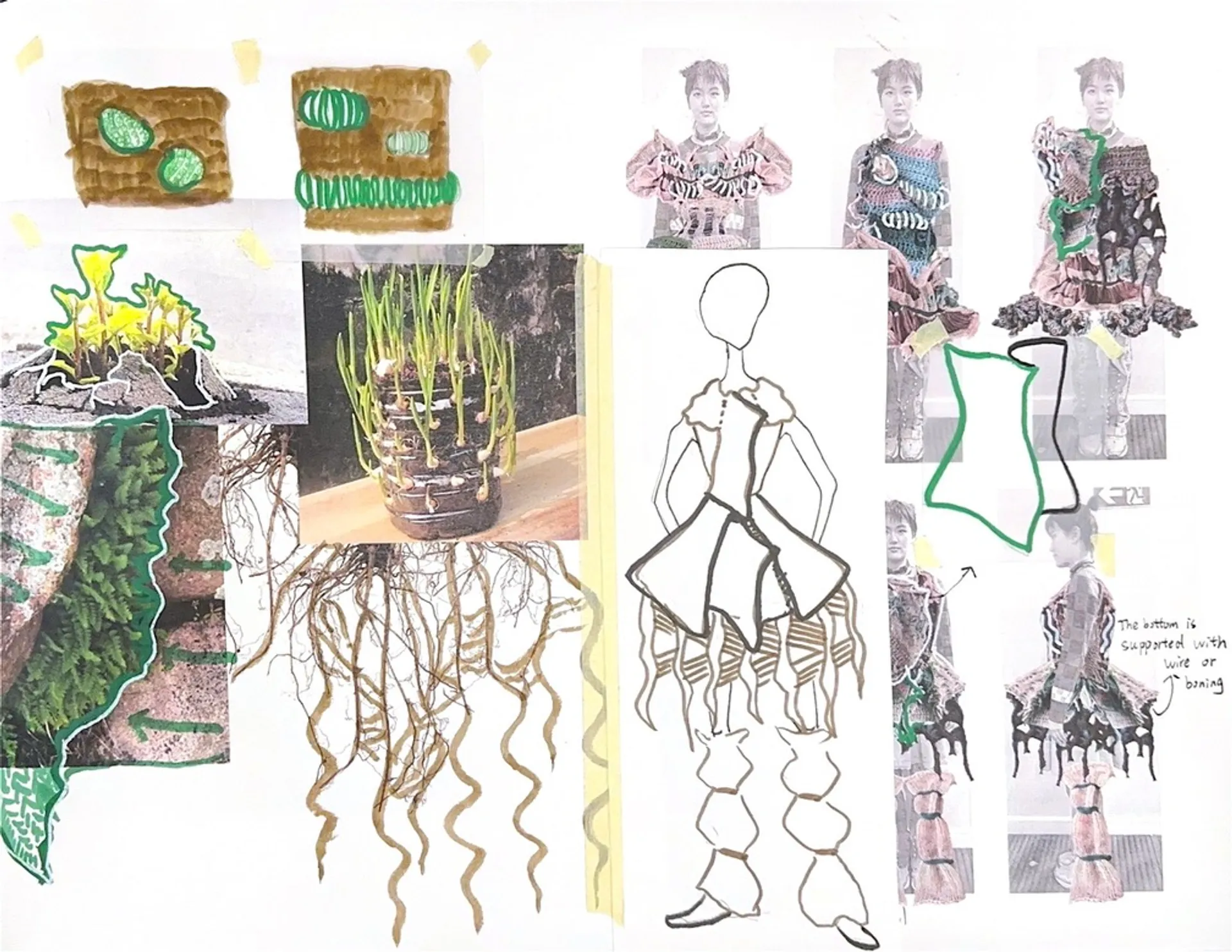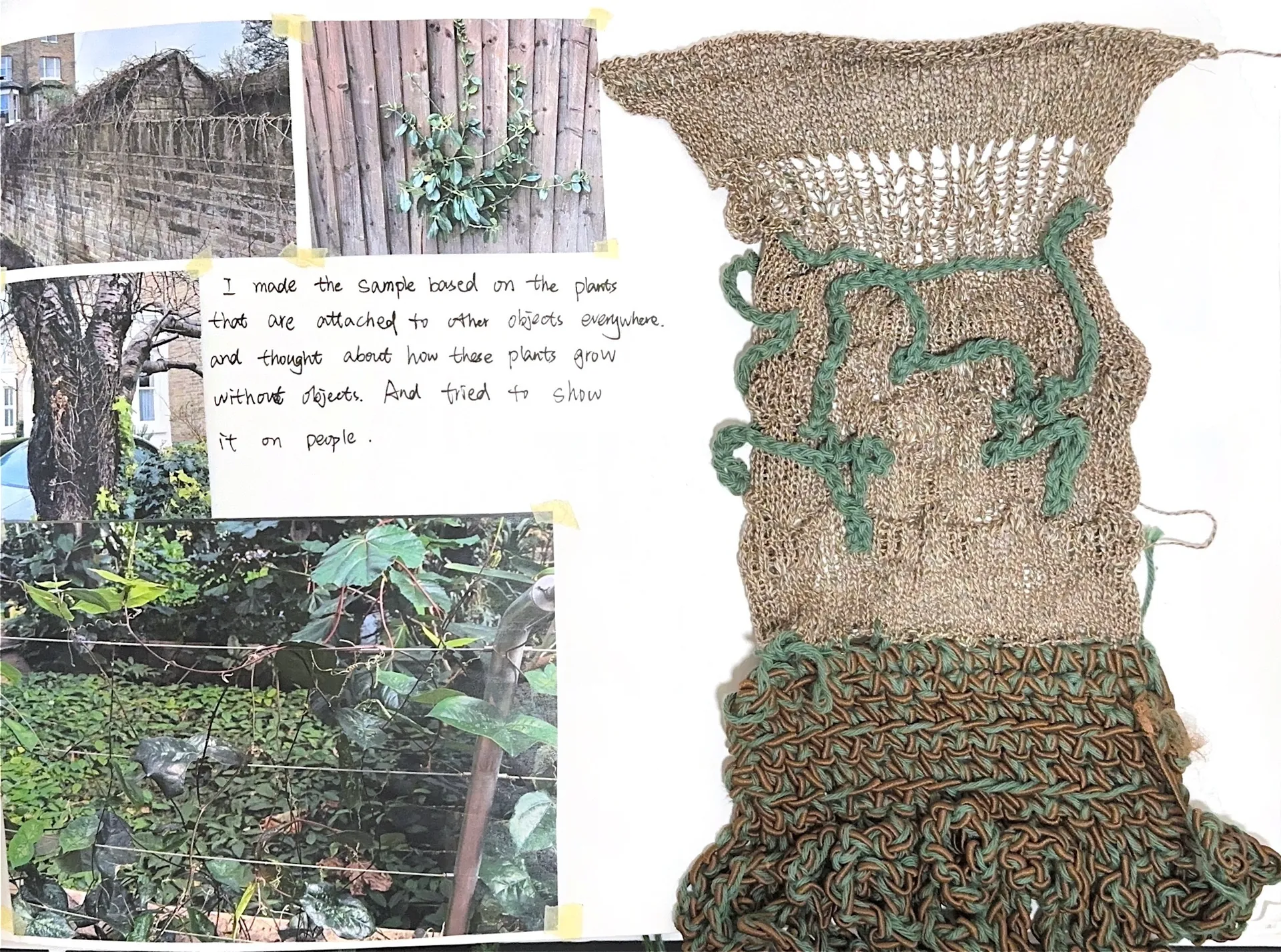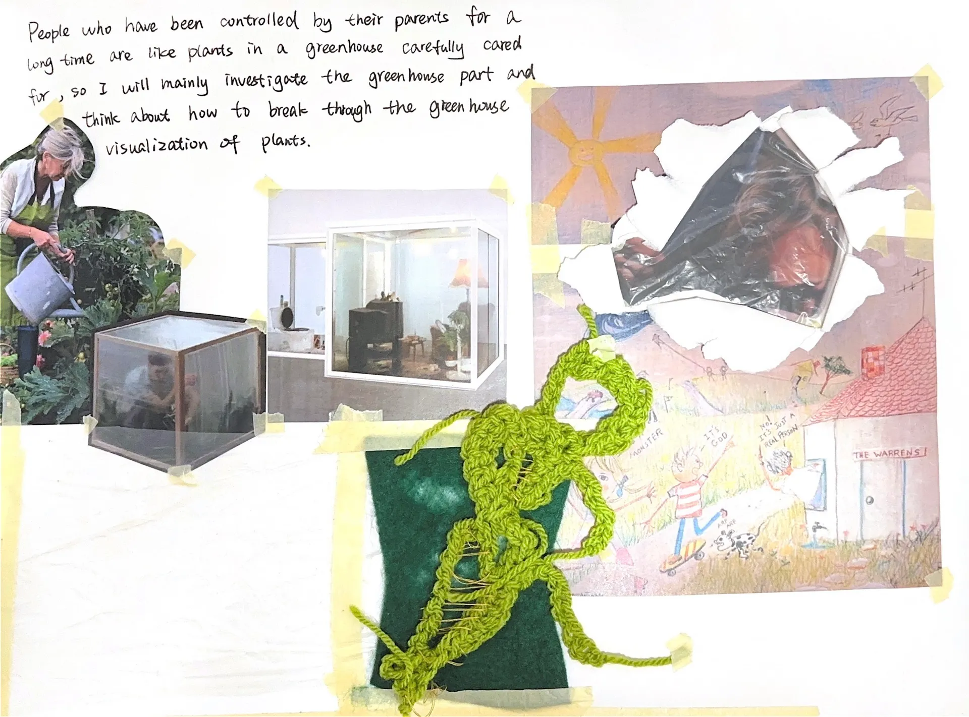 I had a dream about being a prisoner in a prison. Because I think dreams and reality are inevitably related, so I think of people who are controlled by the family. Parents always feel that their children have not grown up, and regard them as flowers in the greenhouse, monitoring and guarding them all the time. This has a negative impact on me, so I want to make the process of breaking through the shackles of the pot by investigating different elements, because I think this process is very important, so I investigated the elements of the greenhouse, surveillance camera and puppet, but later I found that I prefer to focus on the element of the greenhouse plant, so in the presentation of the whole costume, I only used plant-inspired knitwear samples to make clothes, and tried to try and find the feeling of plants breaking free.