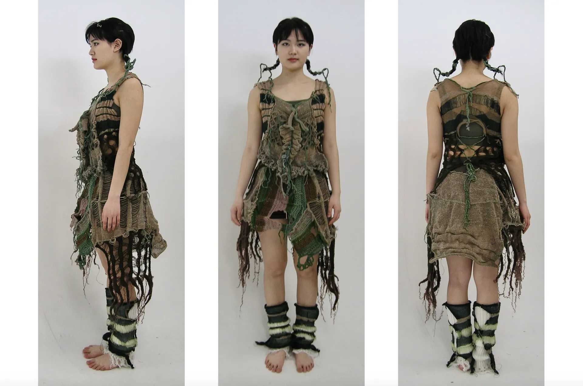 I had a dream about being a prisoner in a prison. Because I think dreams and reality are inevitably related, so I think of people who are controlled by the family. Parents always feel that their children have not grown up, and regard them as flowers in the greenhouse, monitoring and guarding them all the time. This has a negative impact on me, so I want to make the process of breaking through the shackles of the pot by investigating different elements, because I think this process is very important, so I investigated the elements of the greenhouse, surveillance camera and puppet, but later I found that I prefer to focus on the element of the greenhouse plant, so in the presentation of the whole costume, I only used plant-inspired knitwear samples to make clothes, and tried to try and find the feeling of plants breaking free.