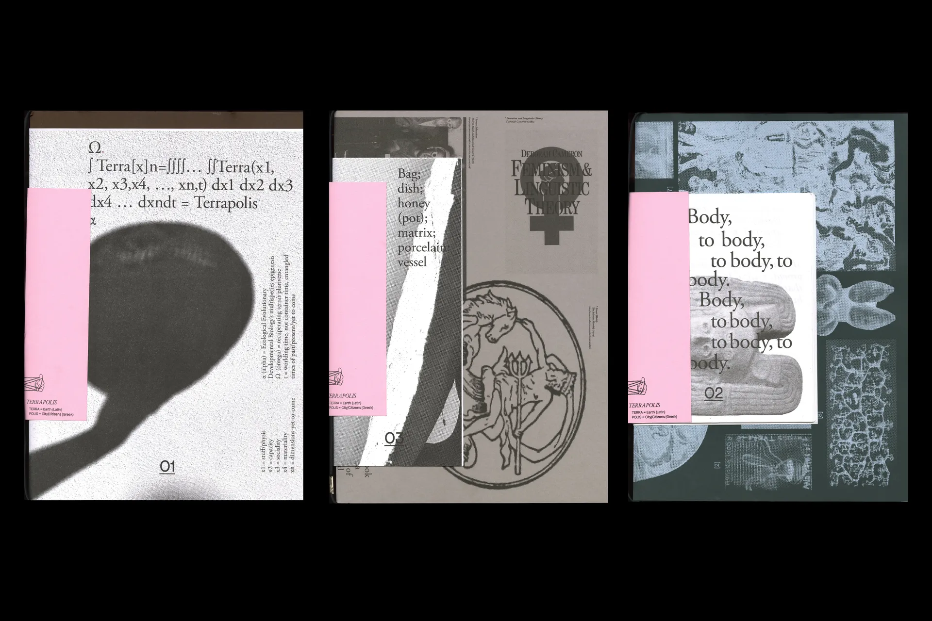 Terrapolis is a collection of chap books for my ecofeminist digital research. When producing them, I condensed my research into print through transmediation and transmutation, which drove the form of my books. Inflecting digital research to printed matter meant it was adapted to a different medium. Design choices in displaying said research, such as the alternative use of footnoting and loose inserts, allow the reader to form their interpretation of the discourse. Underpinning this project is The Carrier Bag Theory of Fiction, Le Guin, which looks to new methods of feminist storytelling. It informed my research, which includes ecology, hydrology and mythology.