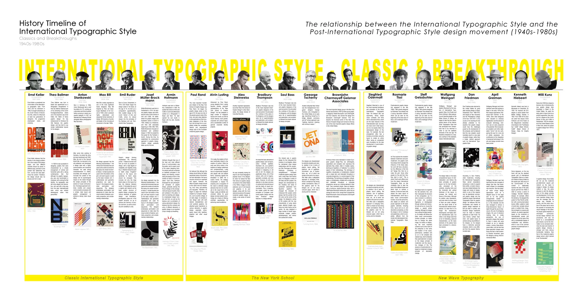 The core research object of this project is the International Typographic Style (hereinafter referred to as ITS), which was born after the Second World War and has had a profound influence to this day. The aim of this project is to explore the relationship between the seemingly stylistically creative ‘Postmodernist’ styles represented by New York School and New Wave Typography and the classic ITS by adopting the method of visual analysis in order to verify and deduce the relationship between the design styles of those who tried to escape from the monotony and seriousness of the classic ITS and the classic ITS that still have inheritance and development.