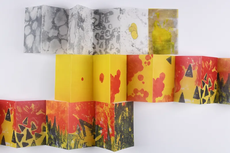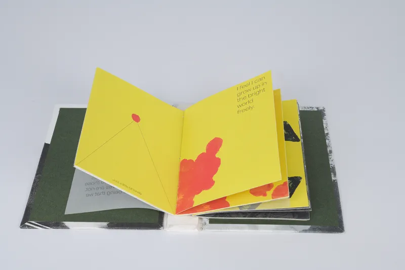 This work uses Monoprint, graphic elements, and typography to explore the dynamic changes of an individual in relation to others through abstract visuals. The red circle represents the self, while the blue triangle symbolizes others, whose interaction gradually forms a “forest” representing lost identity. The piece reflects the tension between interpersonal oppression and self-choice. Through a debate-style dialogue, it reveals existentialist thoughts on “existence precedes essence,” inviting viewers to reflect on the complexity of self and others.
