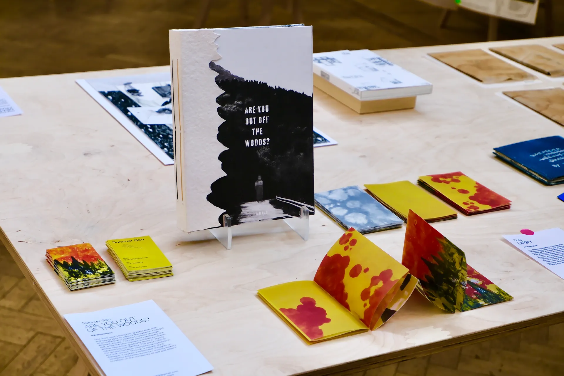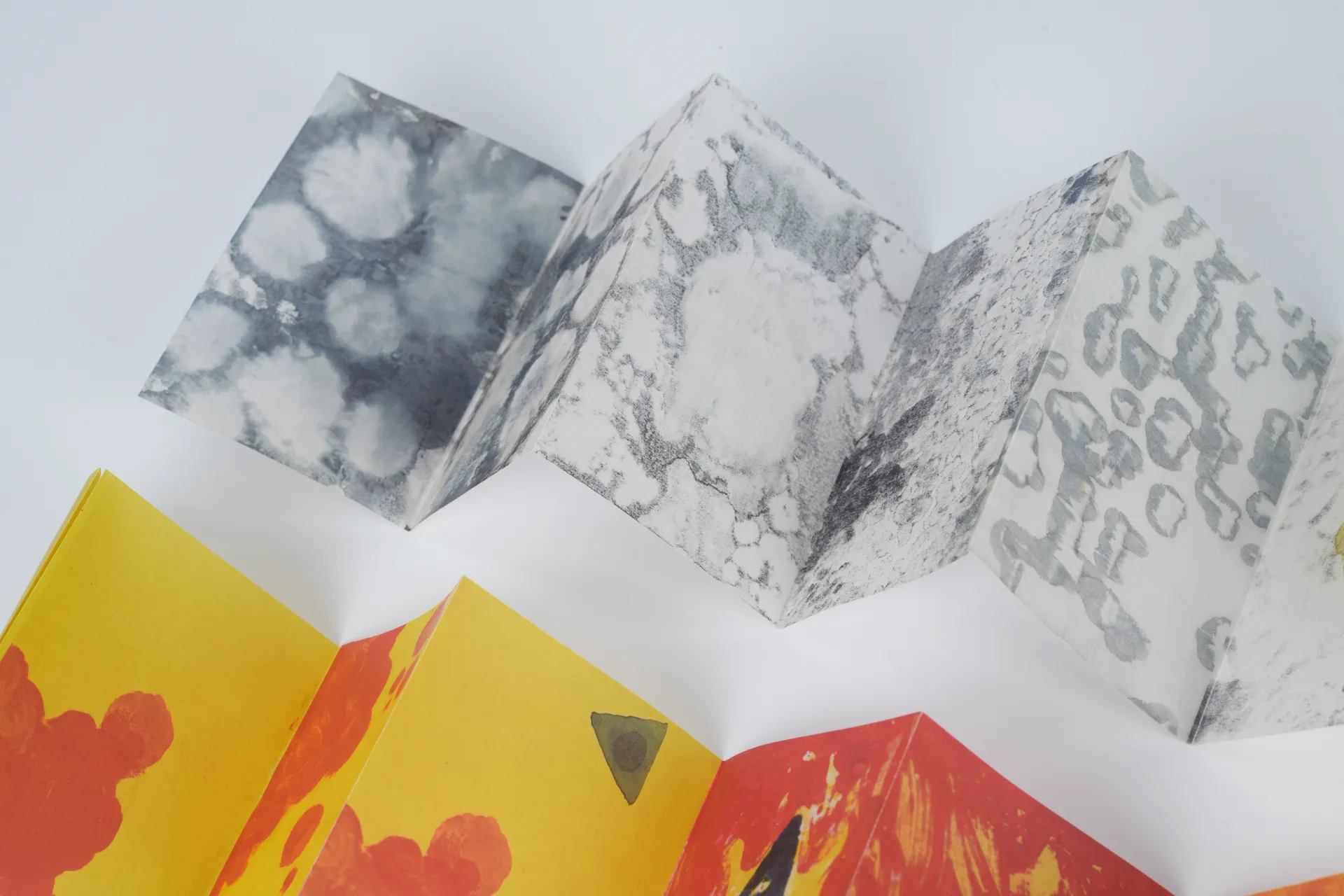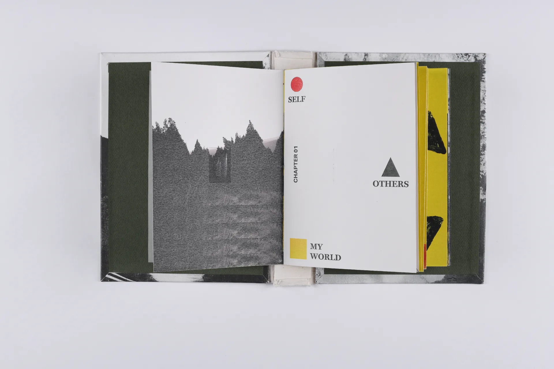 This work uses Monoprint, graphic elements, and typography to explore the dynamic changes of an individual in relation to others through abstract visuals. The red circle represents the self, while the blue triangle symbolizes others, whose interaction gradually forms a “forest” representing lost identity. The piece reflects the tension between interpersonal oppression and self-choice. Through a debate-style dialogue, it reveals existentialist thoughts on “existence precedes essence,” inviting viewers to reflect on the complexity of self and others.