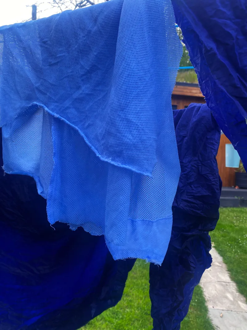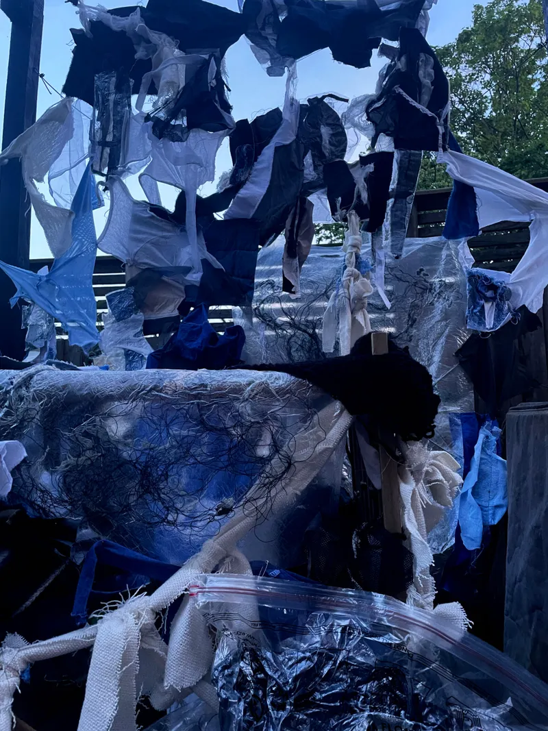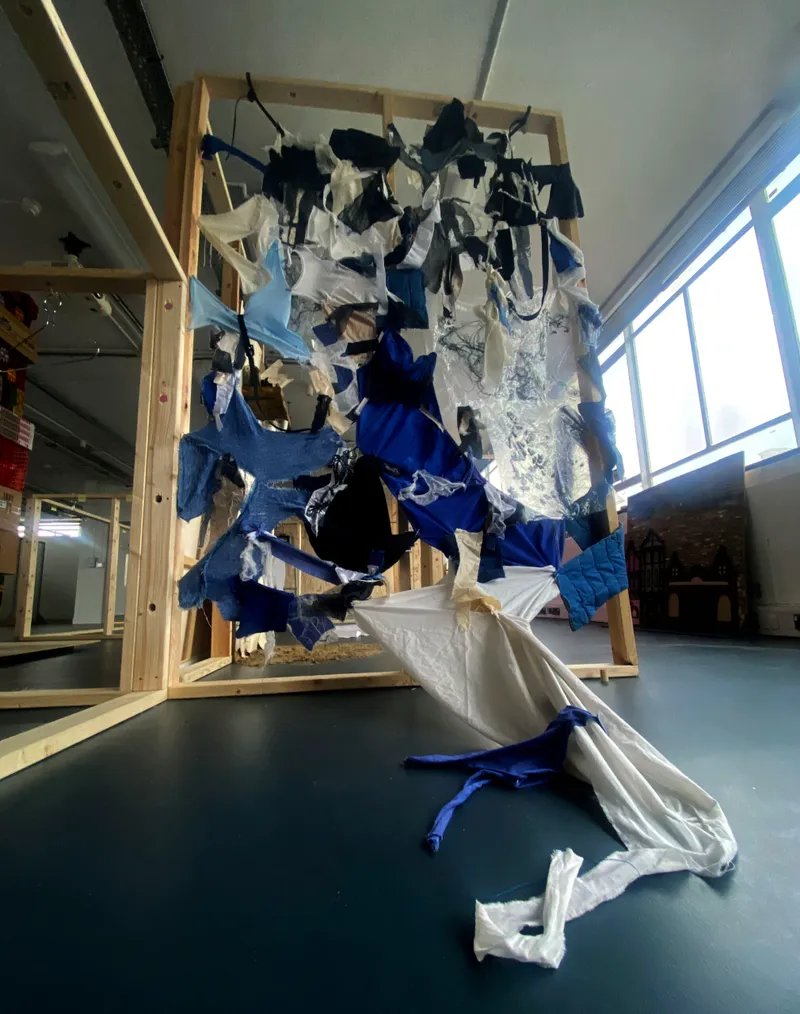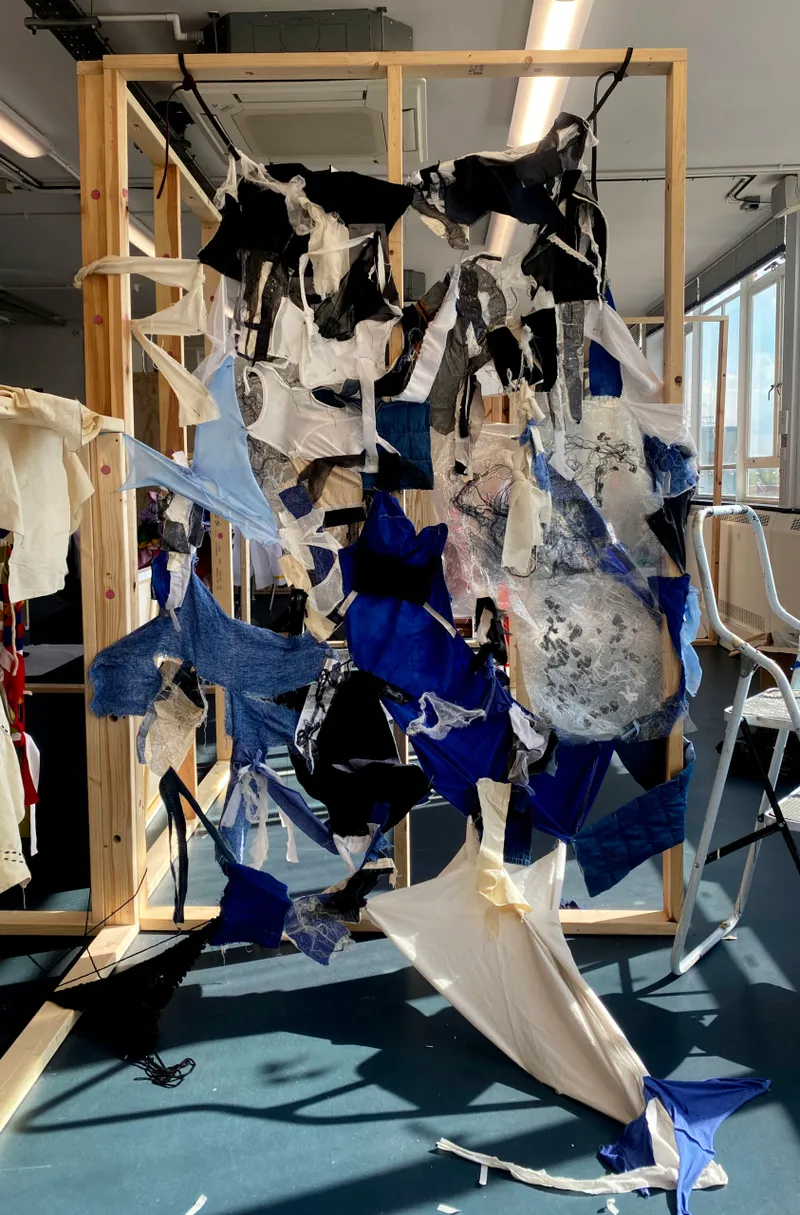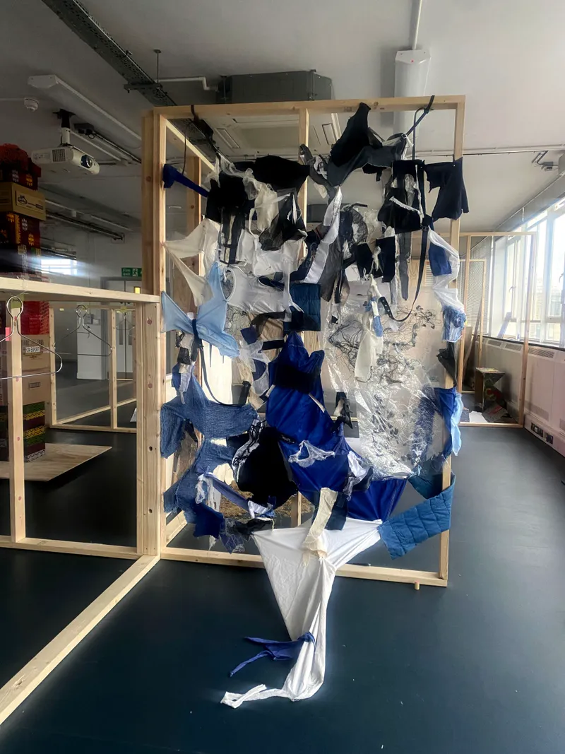 A hanging installation that explores the unnoticed plastic usage in textiles and mass production. It combines recycled fabrics and discarded plastics to give them new life. Hung by belts, the piece is anchored to a wooden frame resembling a stretched canvas, inviting viewers to delve deeper into its composition and details, highlighting the impact of consumerism on material items.