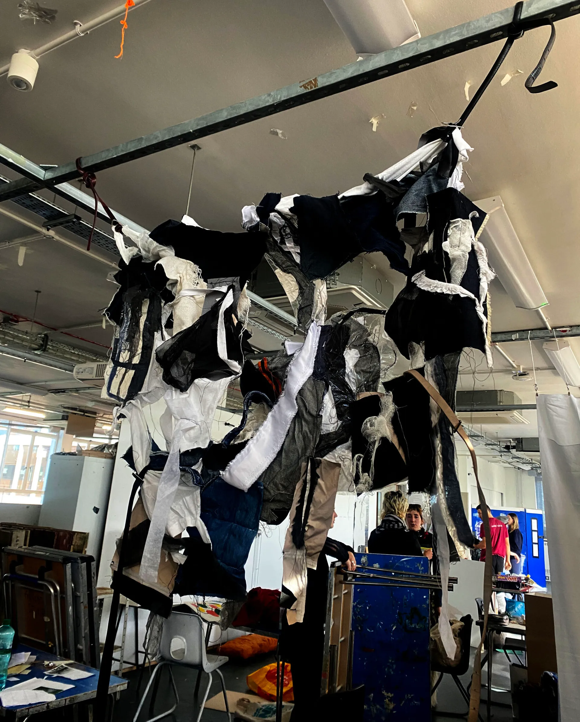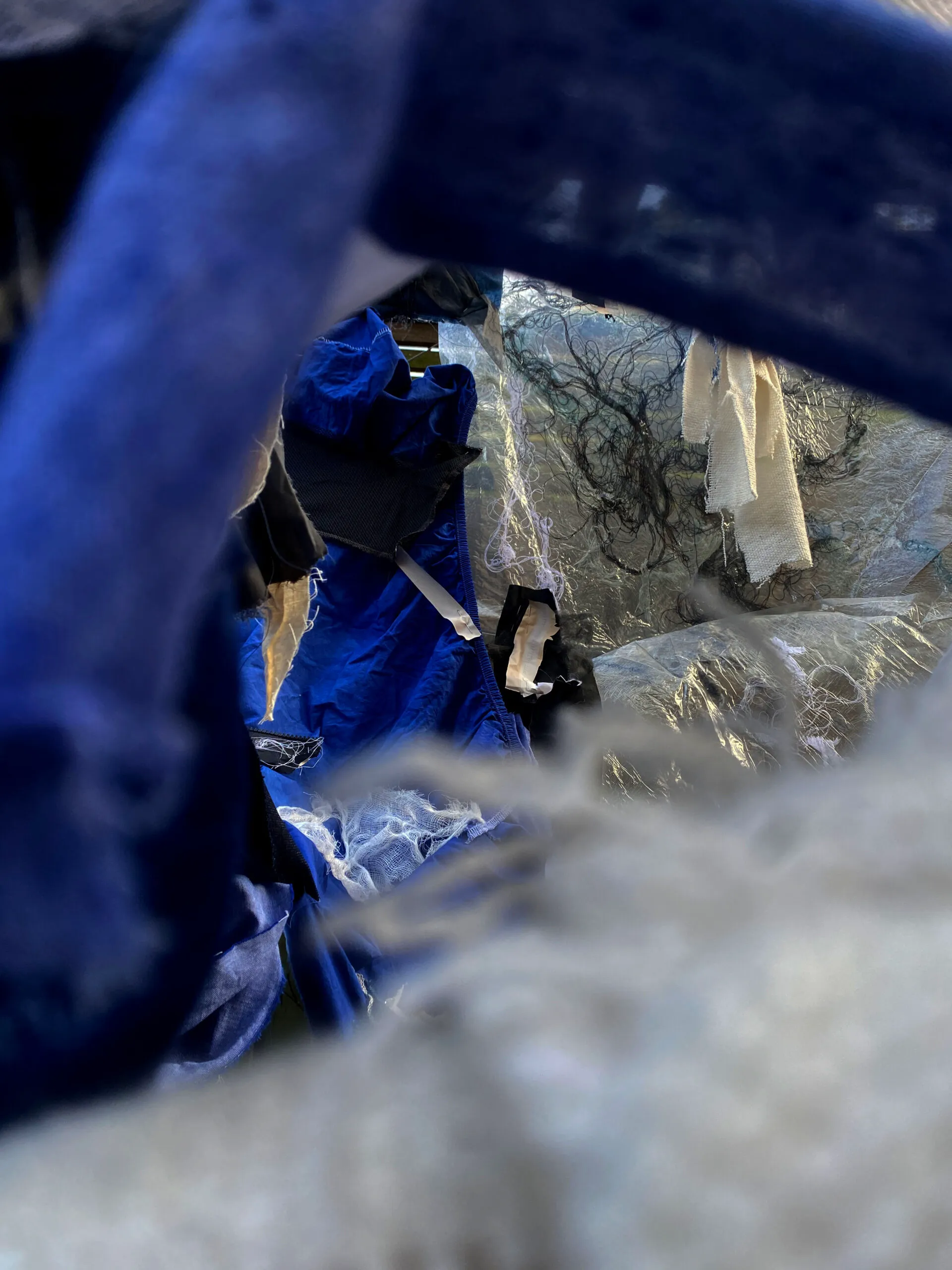 A hanging installation that explores the unnoticed plastic usage in textiles and mass production. It combines recycled fabrics and discarded plastics to give them new life. Hung by belts, the piece is anchored to a wooden frame resembling a stretched canvas, inviting viewers to delve deeper into its composition and details, highlighting the impact of consumerism on material items.