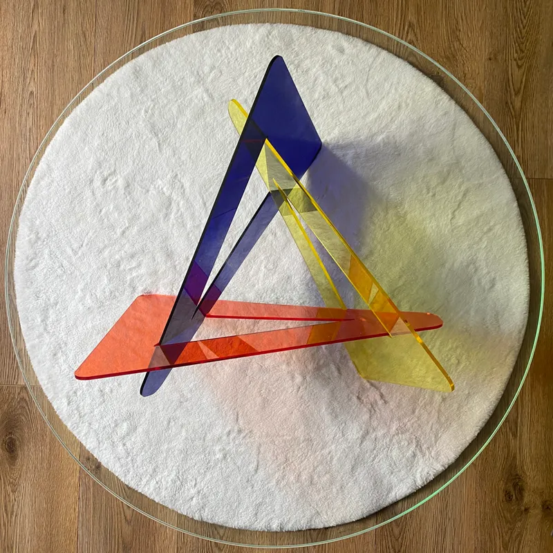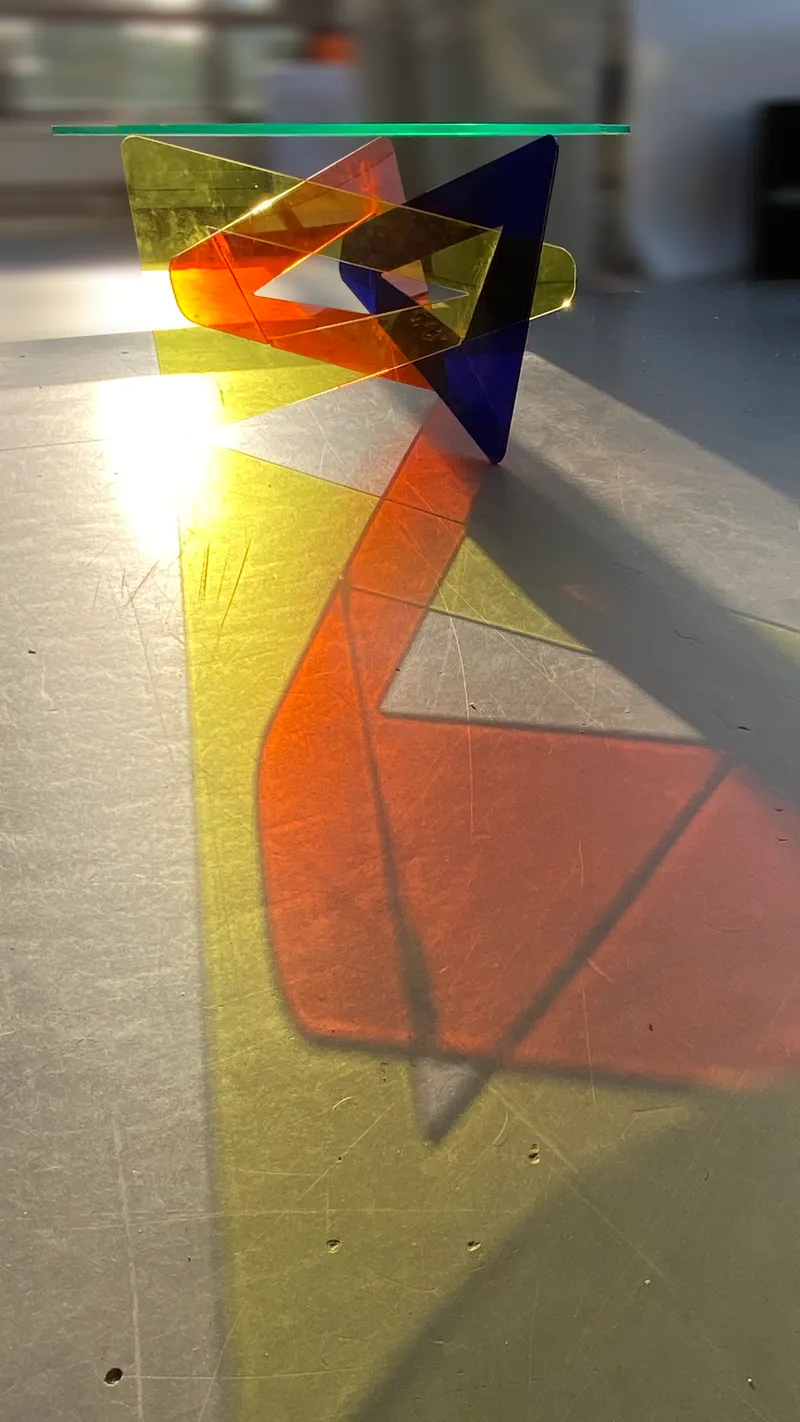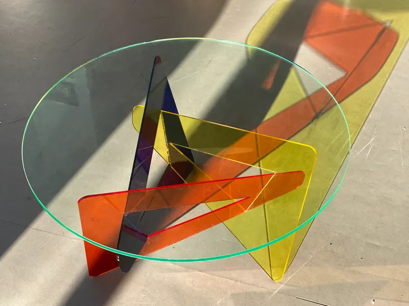 The TRI: table BASSE-A uses vibrant yellow, blue, and amber Coloured Tinted Cast Acrylic, laser-cut into a geometric base with a clear acrylic top, creating a lively centerpiece. The TRI: table BASSE-WW combines walnut veneered MDF, precisely cut with CNC technology, forming a sturdy base for a circular glass top.