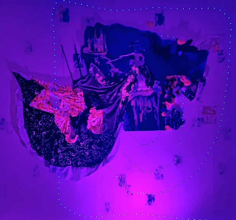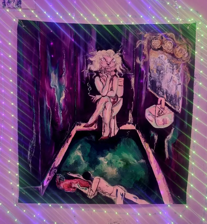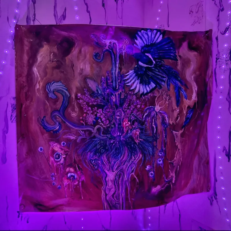 I primarily focus on ‘Installation Oil Paintings’; the symbolic messages extend beyond the canvas through the use of lighting and set design, blurring the lines between painting and installation. These immersive paintings aim to break down the alienating wall that static paintings can possess, creating an all consuming other-worldly atmosphere. These portals to other dimensions are fantasy in nature and focus around criticising our current political landscape and the exploration of personal experiences. Previous work explored ideas around inner turmoil and mental health, while current work focuses around Fantasy and Feminism through the exploration of hybrid figures and a transhumanist narrative.